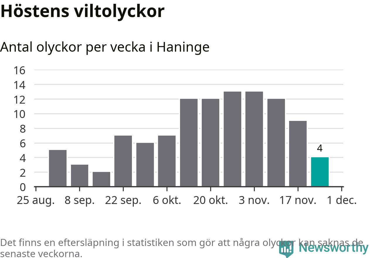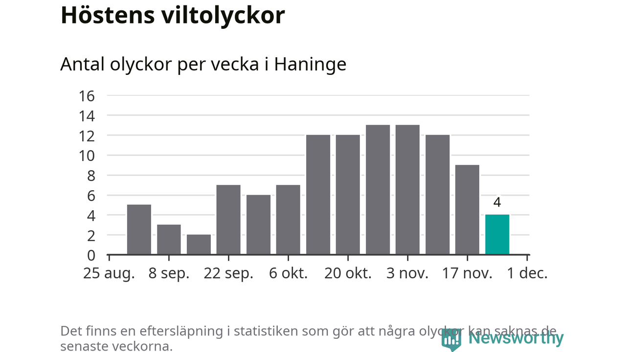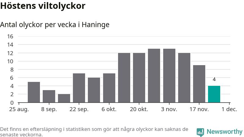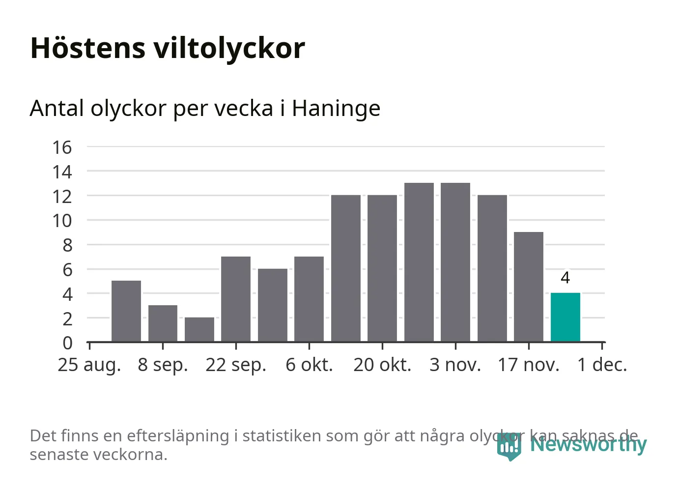 Hittills har fyra viltolyckor rapporterats in i Haninge kommun från vecka 48. Se listan här.