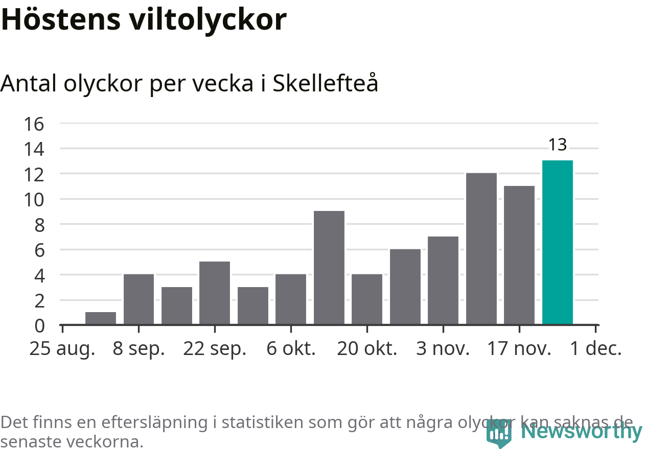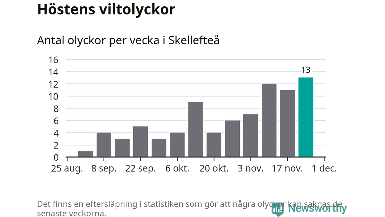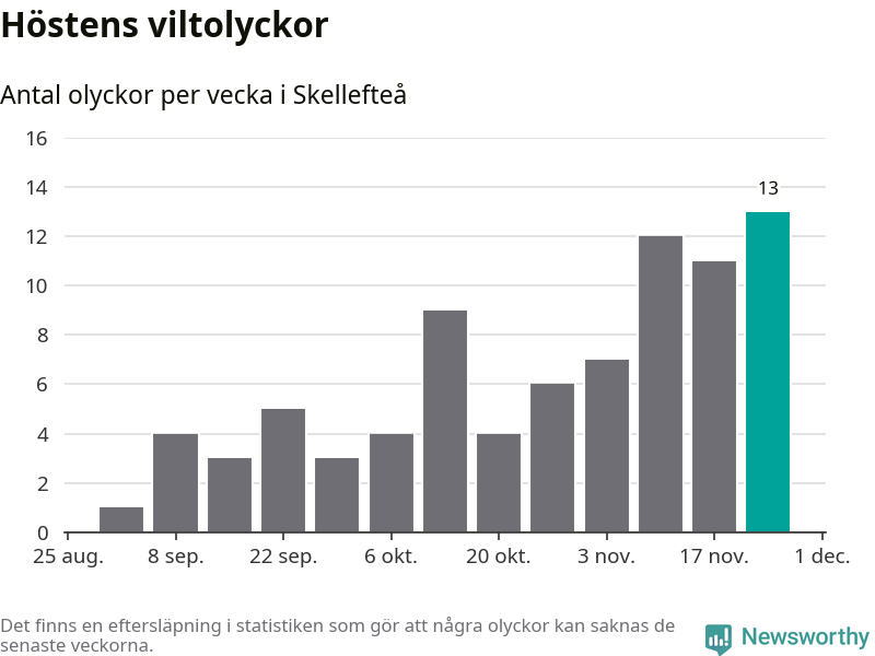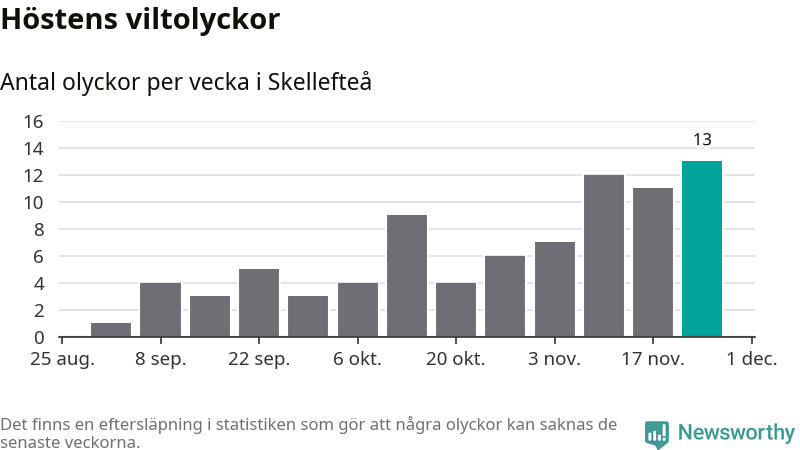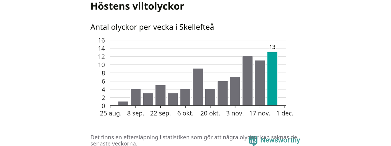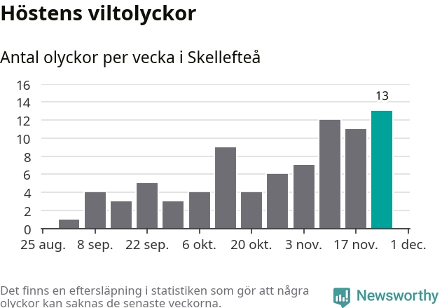 Under vecka 48 rapporterades 13 viltolyckor in i Skellefteå kommun. Det är det största antalet på en vecka den här hösten.