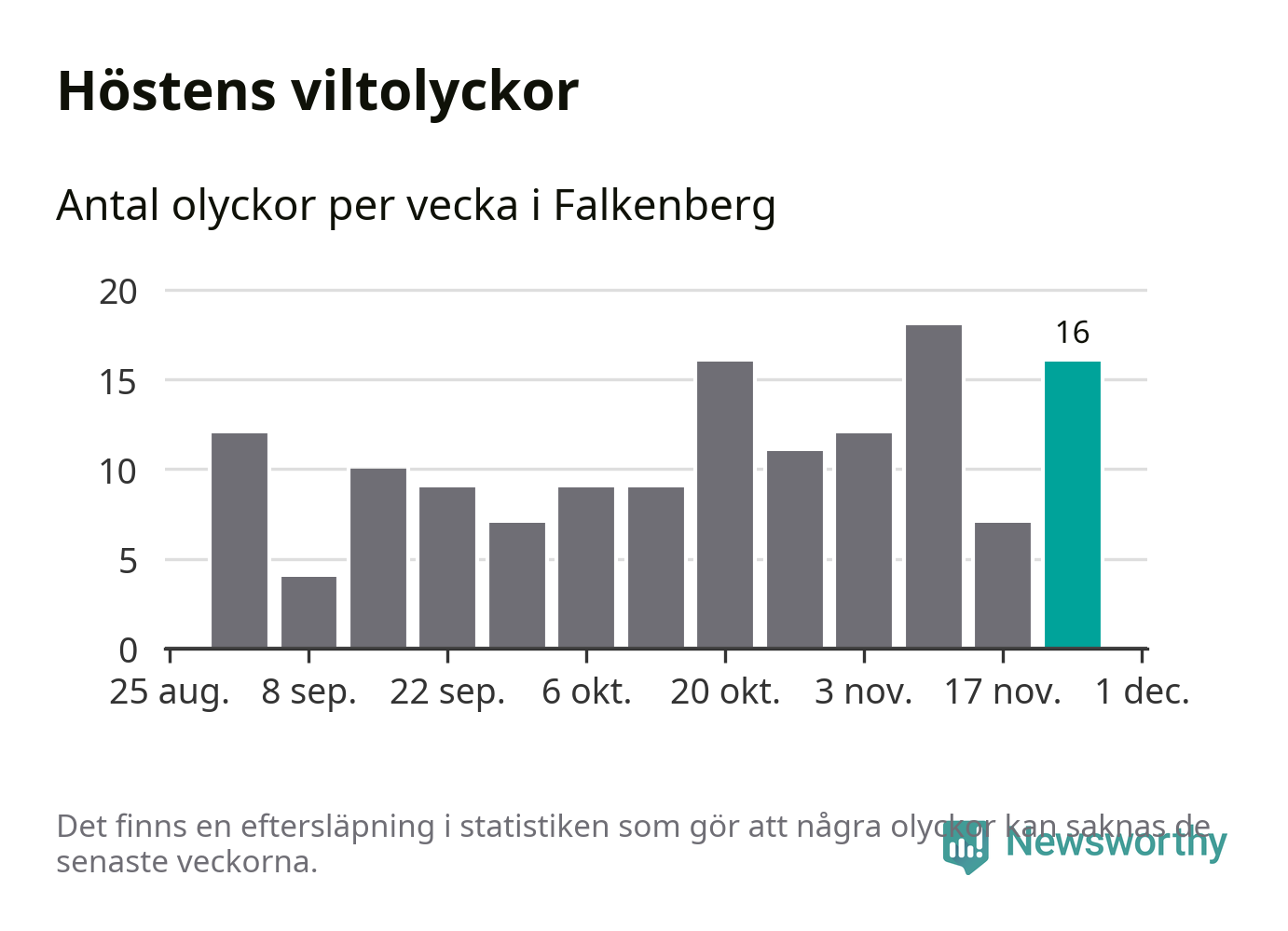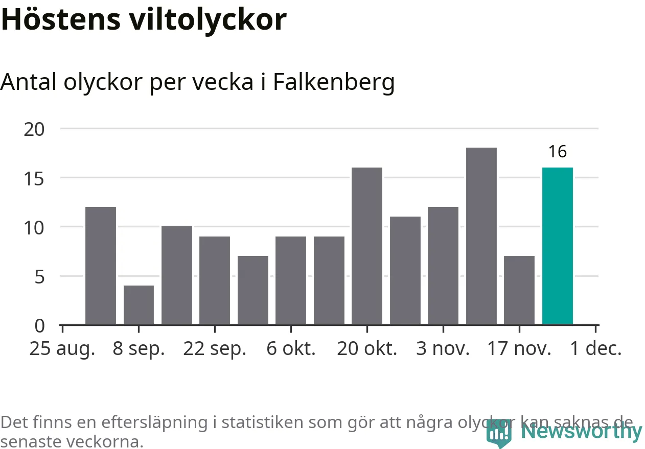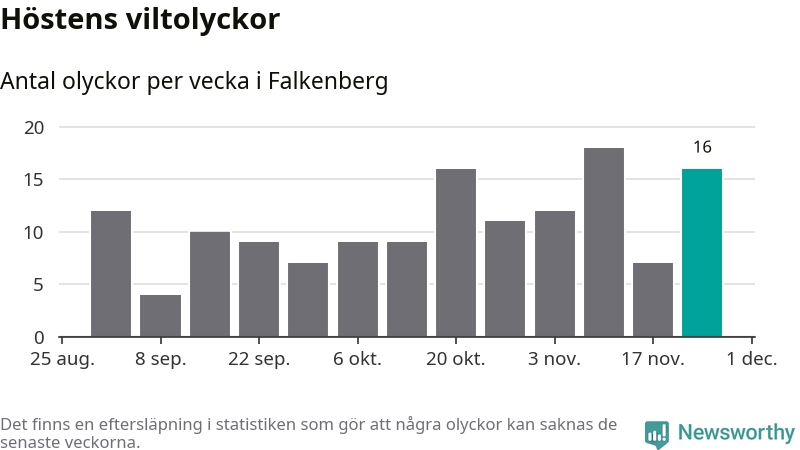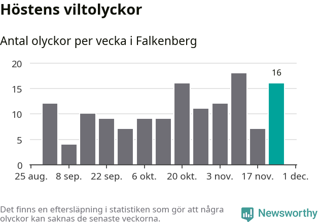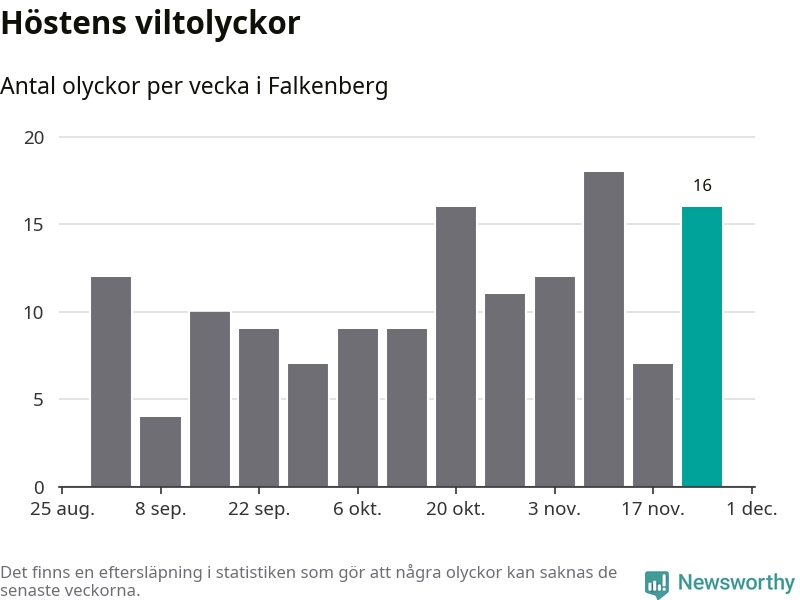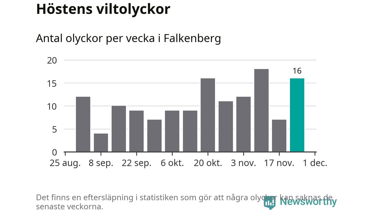 16 olyckor på en enda vecka är däremot ovanligt många. Bara tolv gånger tidigare sedan 2015 har det skett så många viltolyckor på en vecka i Falkenbergs kommun, senast för tre veckor sedan.