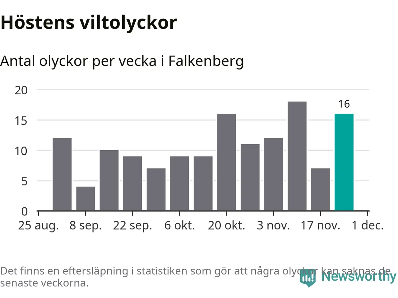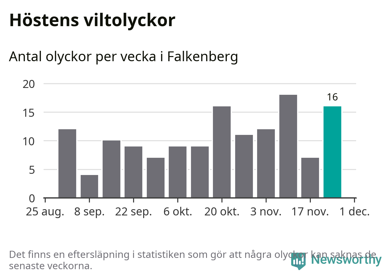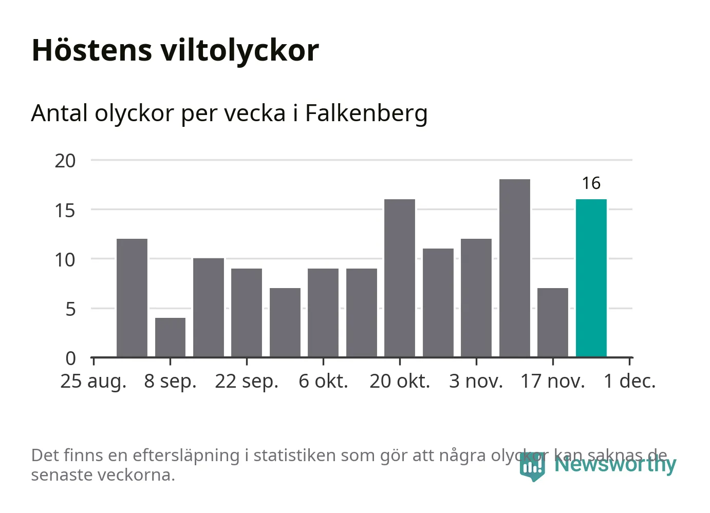 16 olyckor på en enda vecka är däremot ovanligt många. Bara tolv gånger tidigare sedan 2015 har det skett så många viltolyckor på en vecka i Falkenbergs kommun, senast för tre veckor sedan.