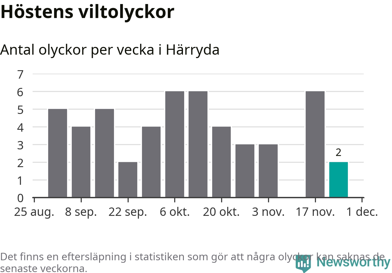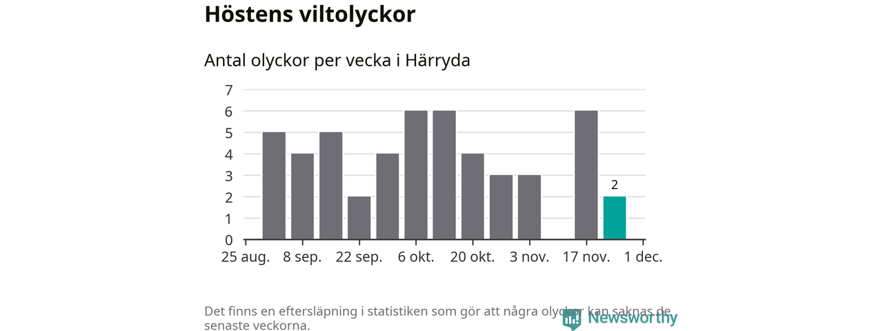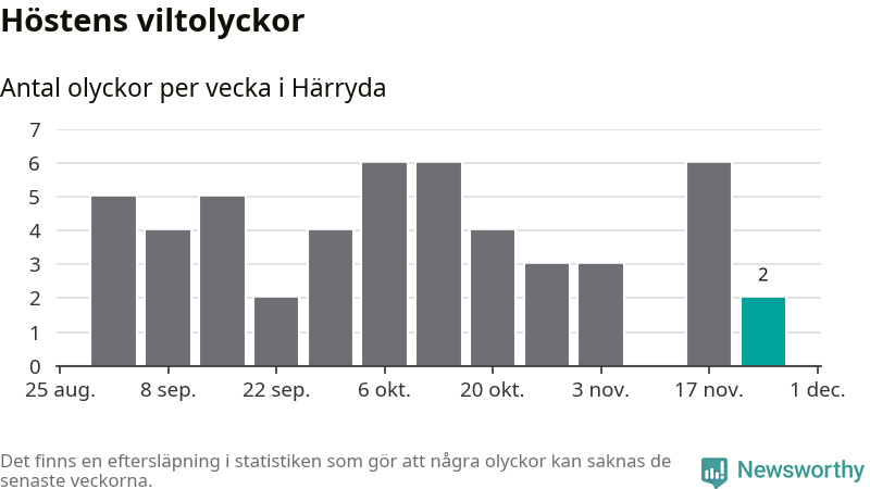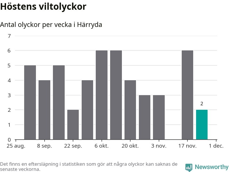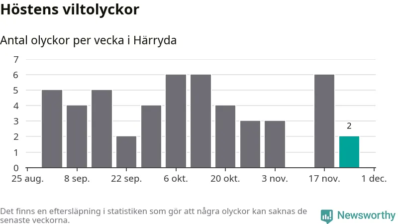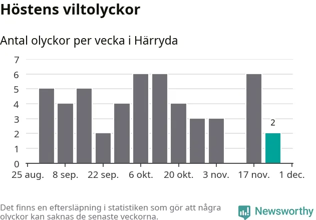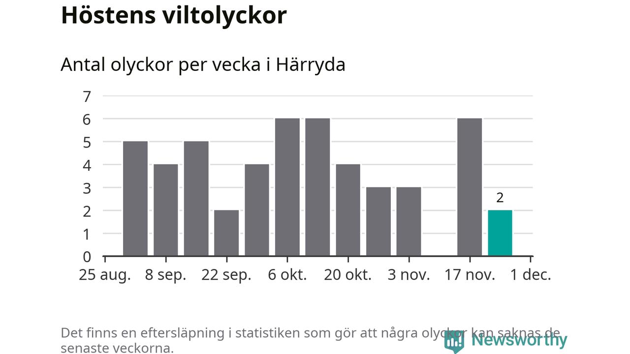 Hittills har två viltolyckor rapporterats in i Härryda kommun från vecka 48. Se listan här.