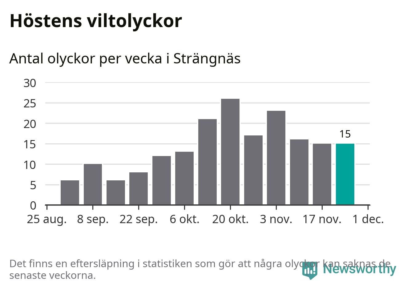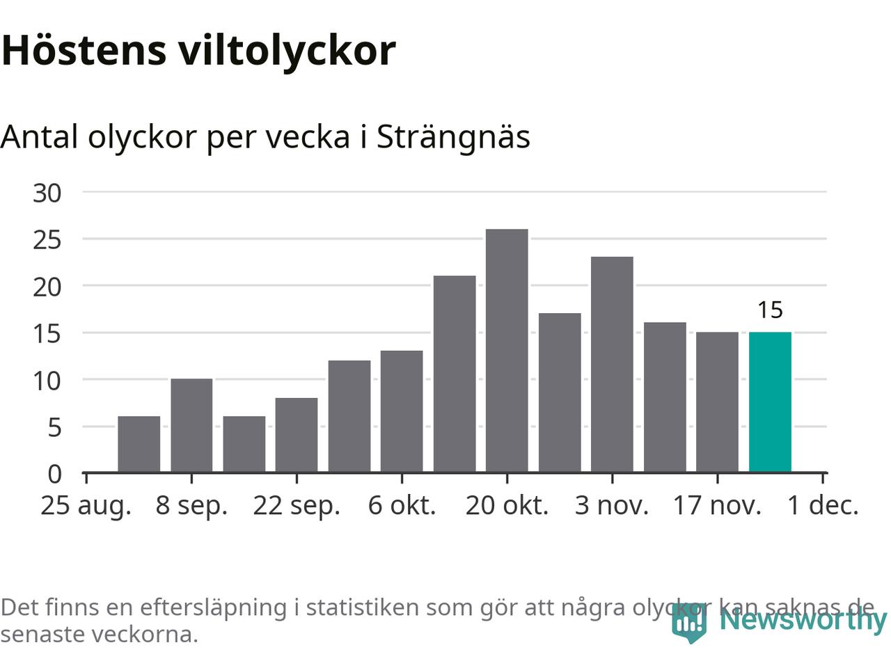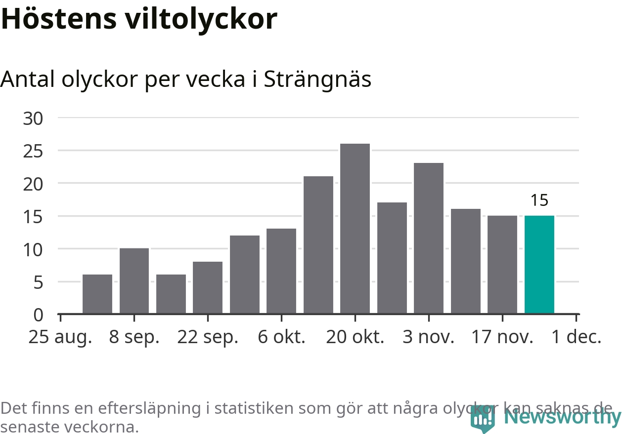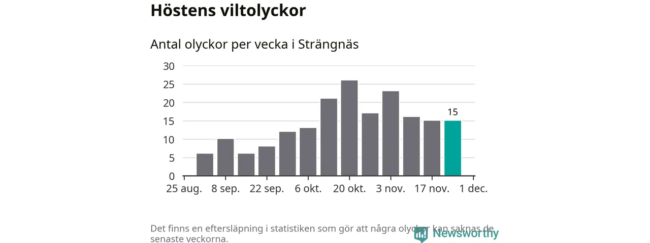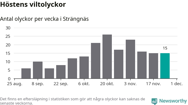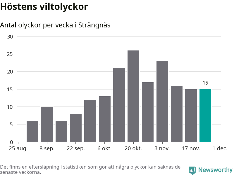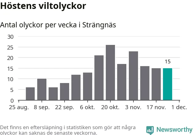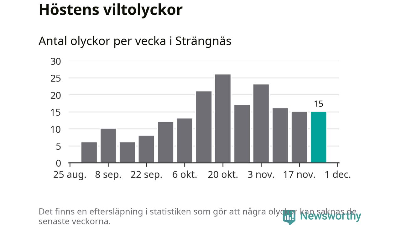 Hittills har 15 viltolyckor rapporterats in i Strängnäs kommun från vecka 48. Se listan här.