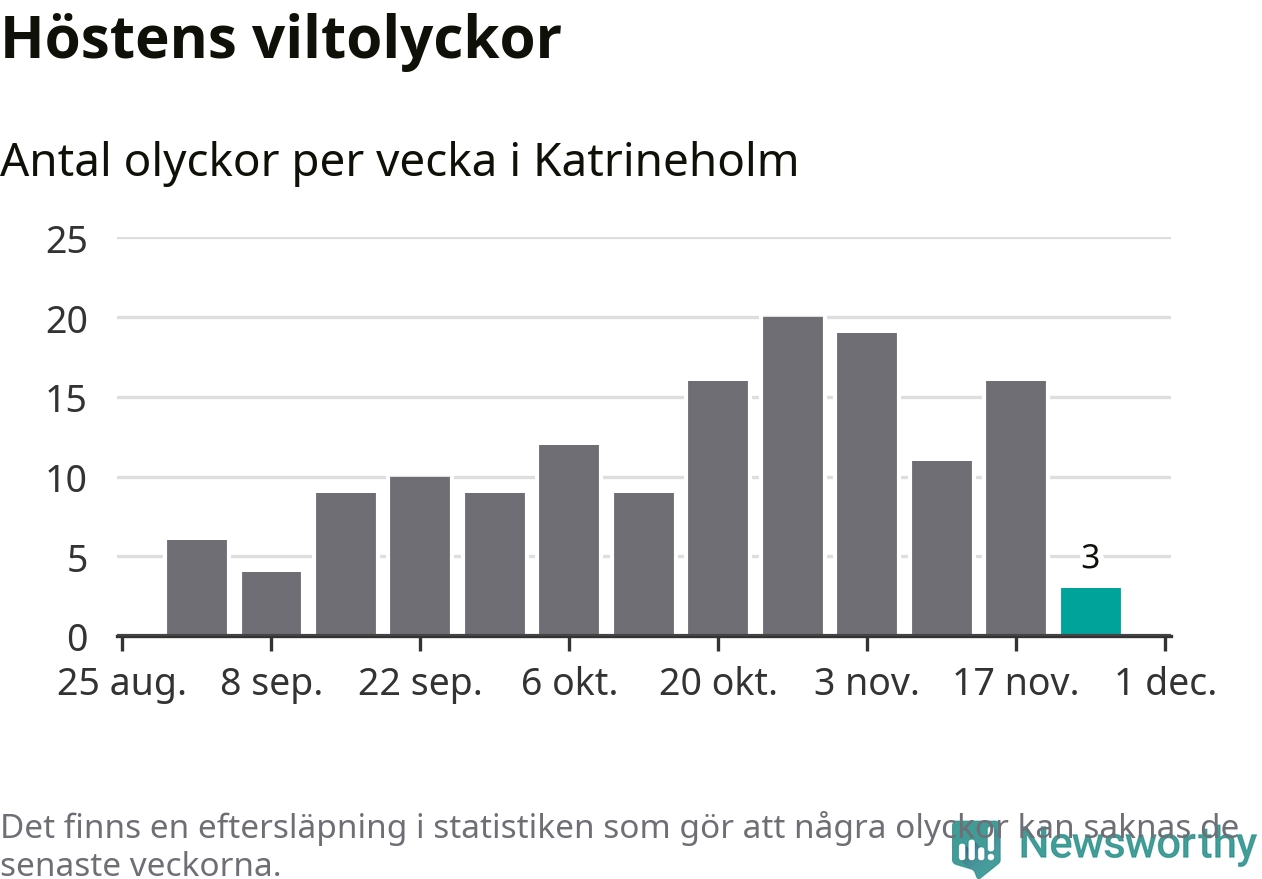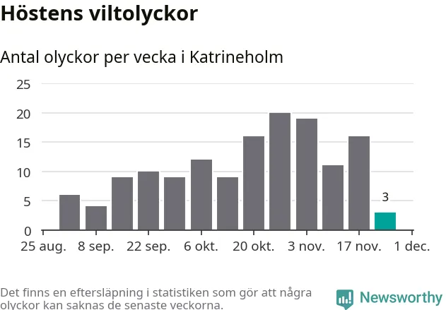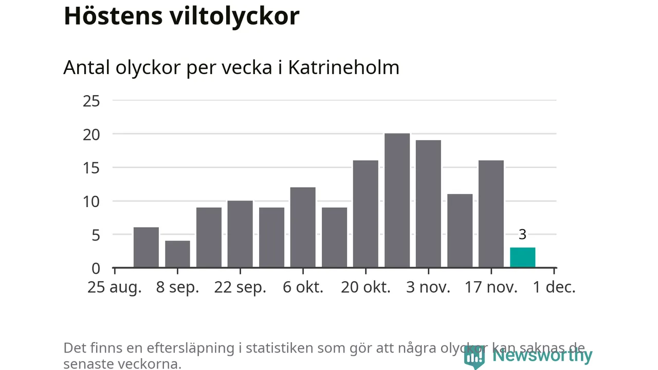 Totalt den här hösten har det inträffat 144 viltolyckor i kommunen. Det är mindre än genomsnittet för motsvarande period (omkring 171) de senaste tio åren.
