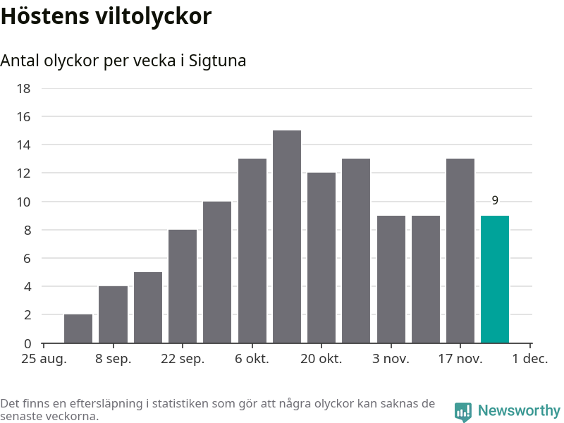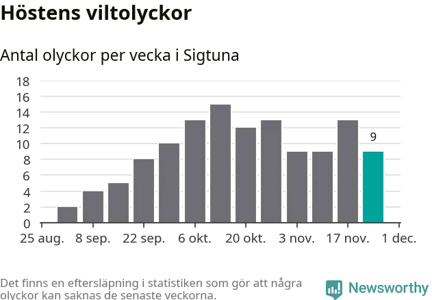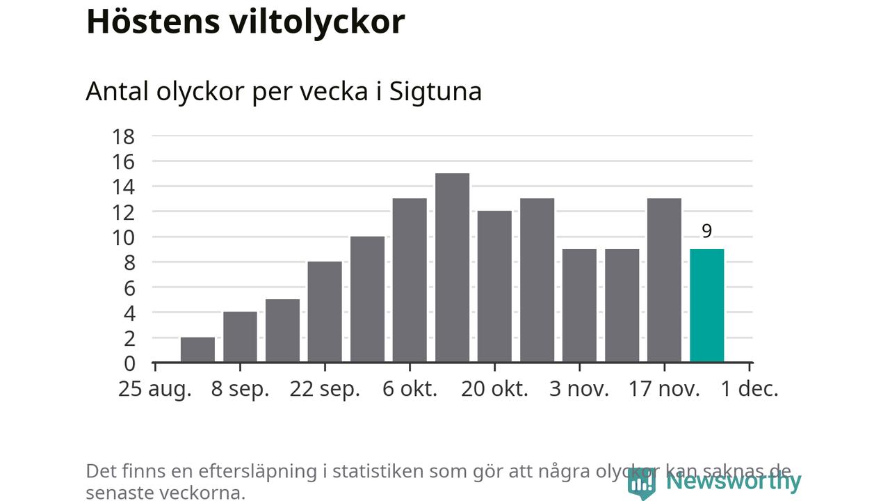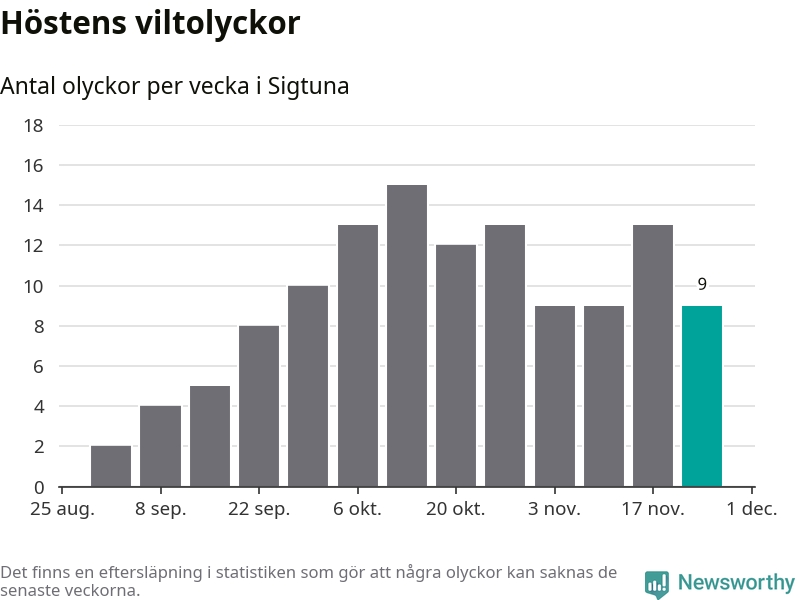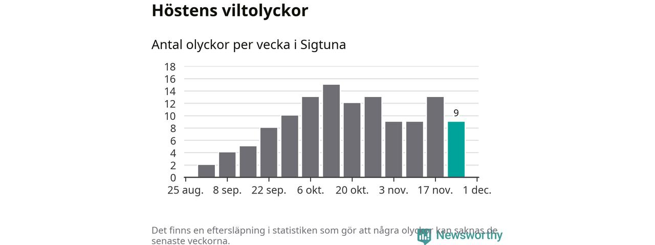 Hittills har nio viltolyckor rapporterats in i Sigtuna kommun från vecka 48. Se listan här.