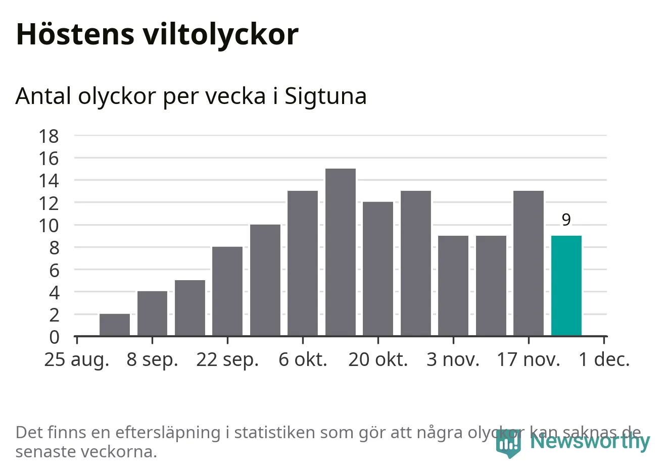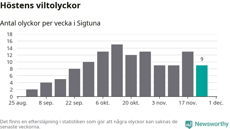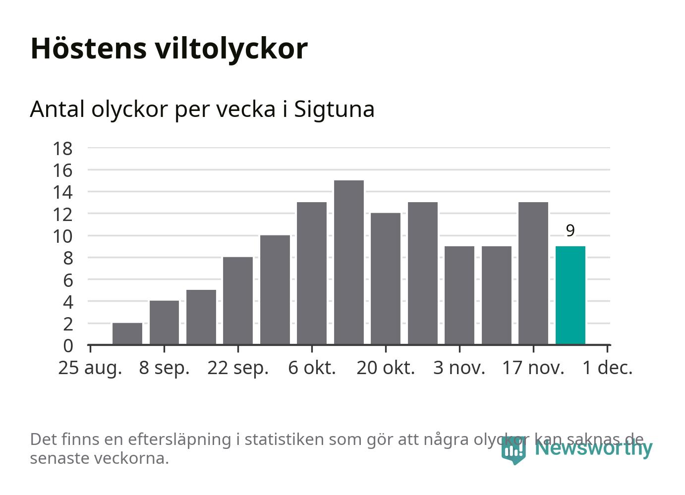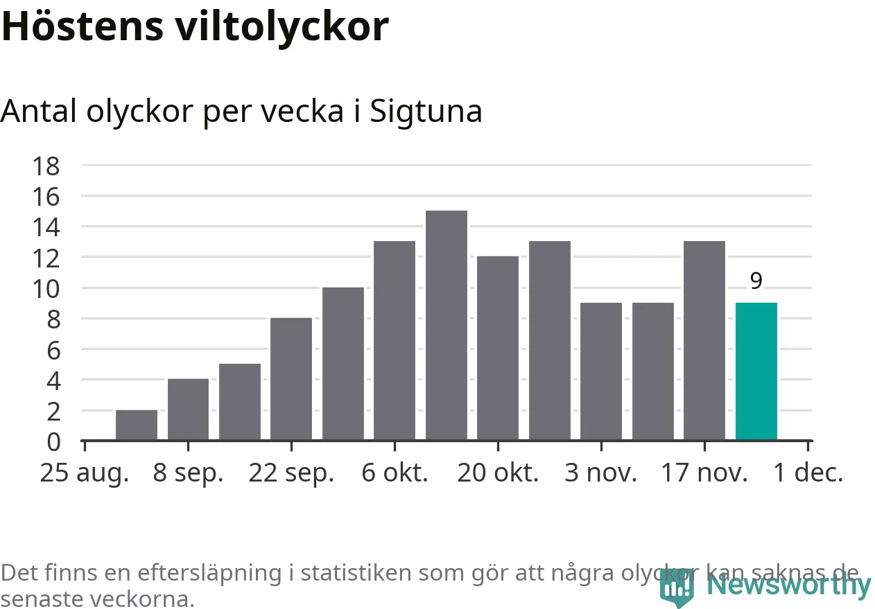Hittills har nio viltolyckor rapporterats in i Sigtuna kommun från vecka 48. Se listan här.