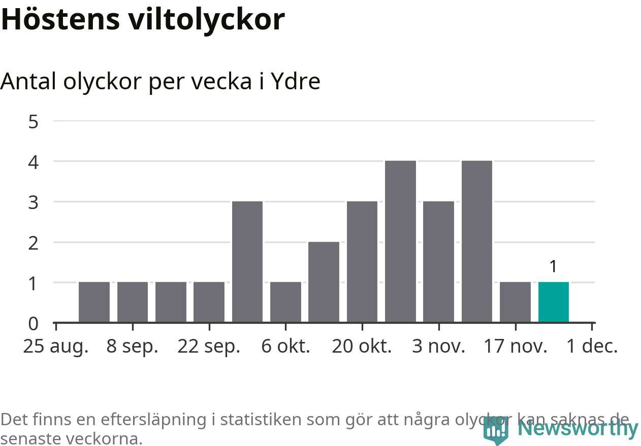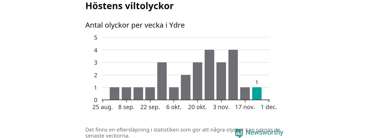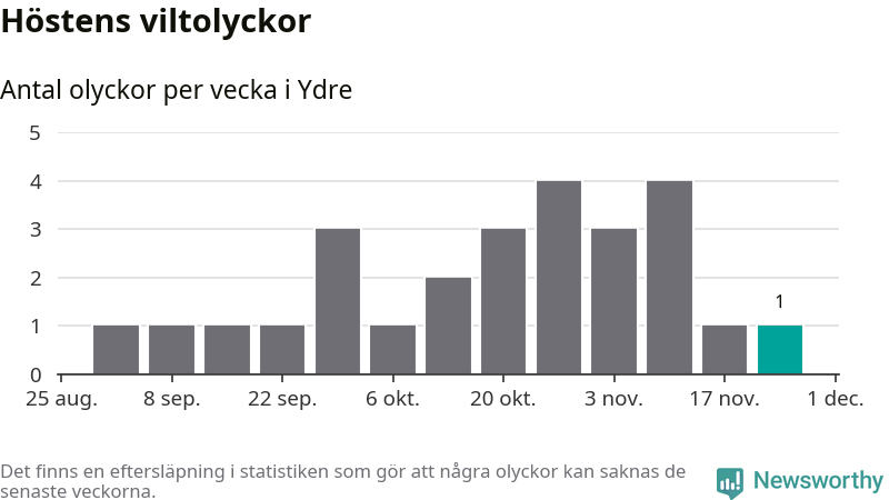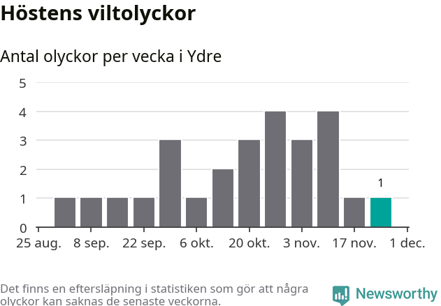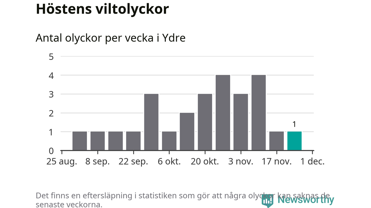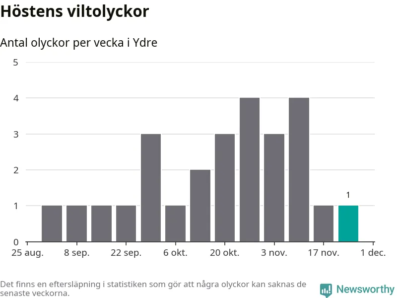 Från förra veckan (vecka 48) har hittills en viltolycka rapporterats in i Ydre kommun.