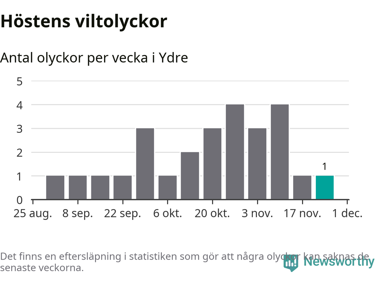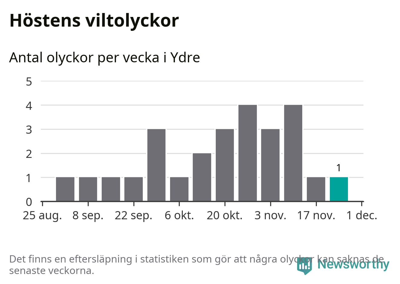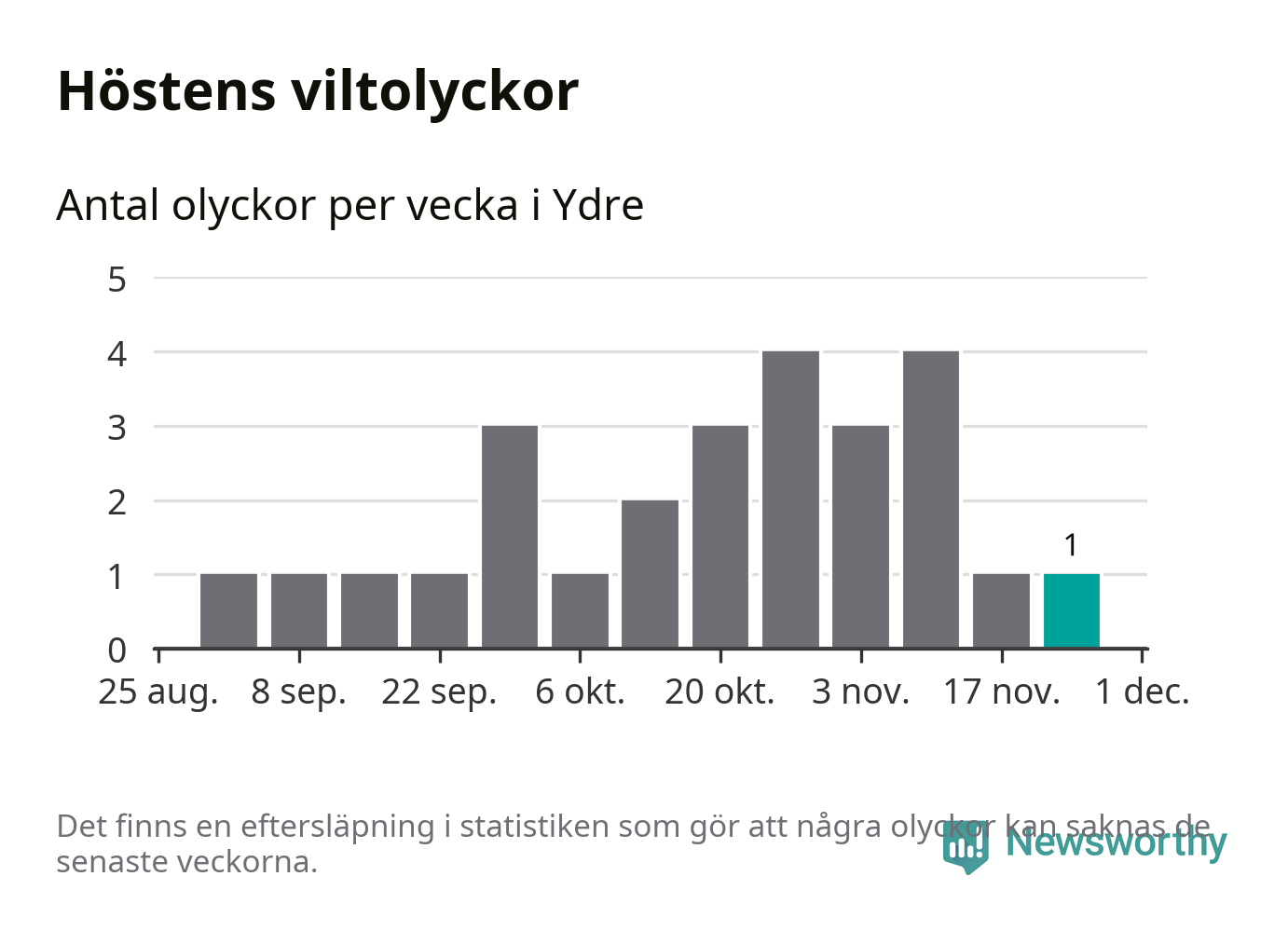 Från förra veckan (vecka 48) har hittills en viltolycka rapporterats in i Ydre kommun.