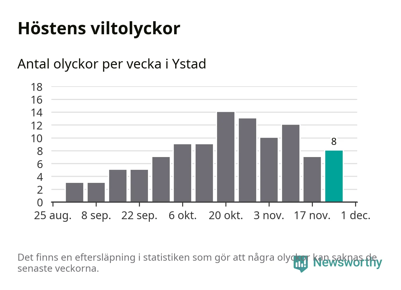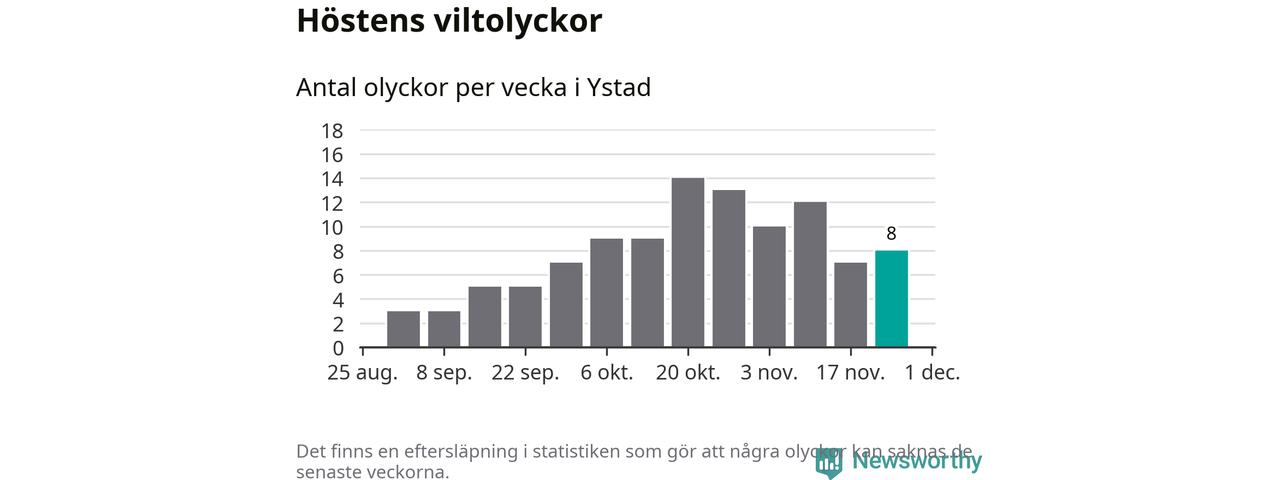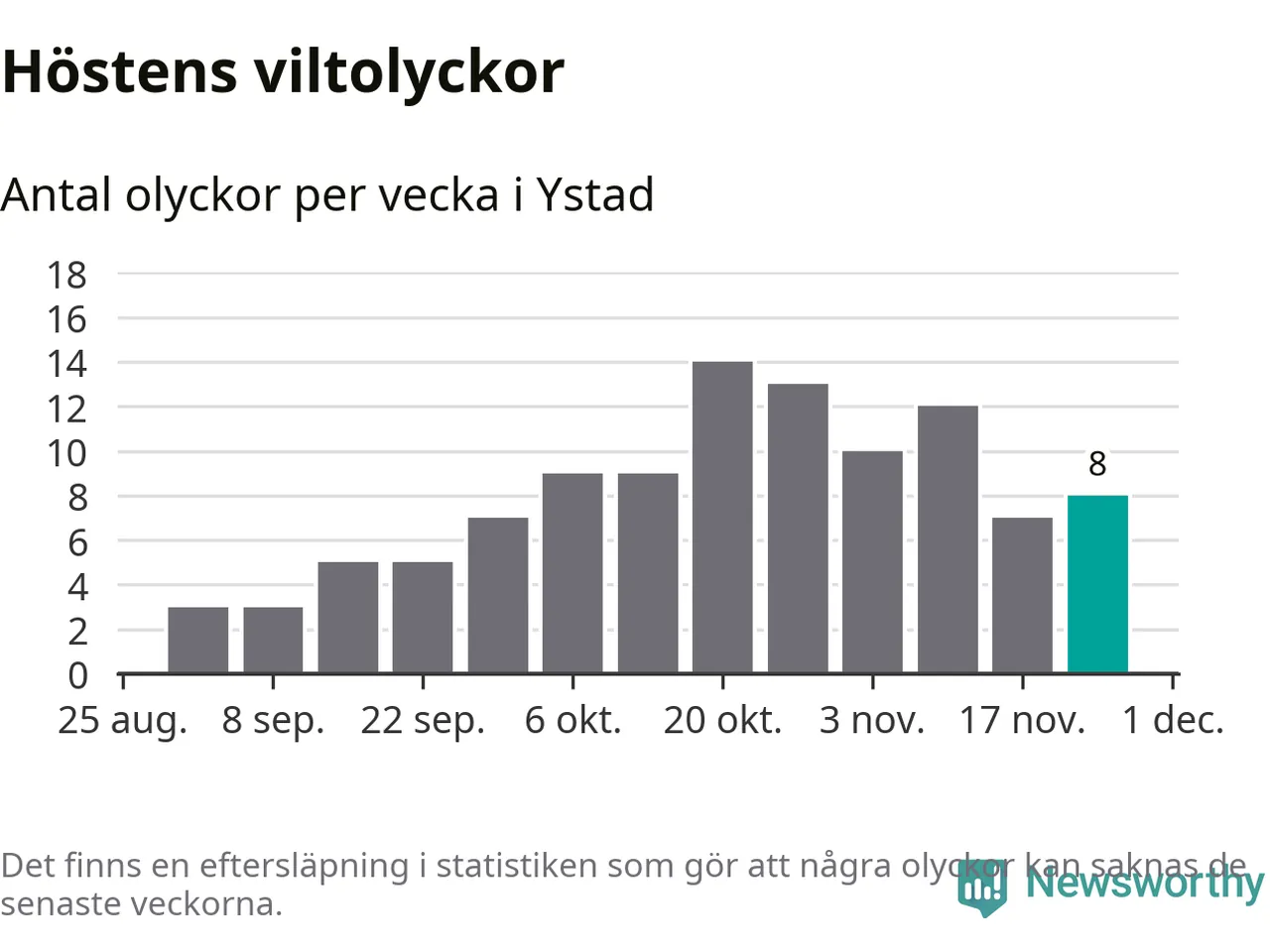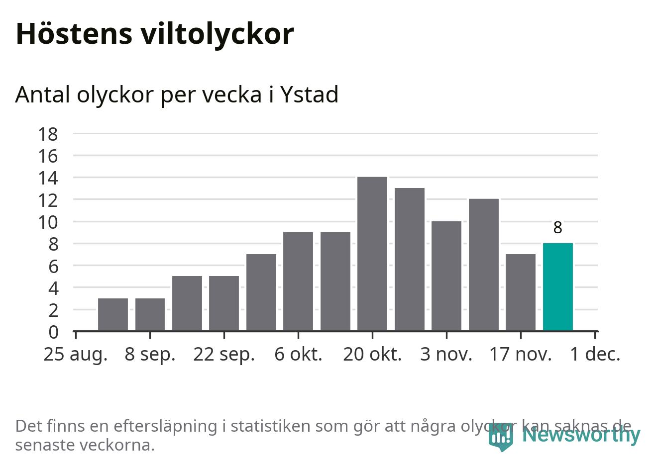 Hittills har åtta viltolyckor rapporterats in i Ystads kommun från vecka 48. Se listan här.