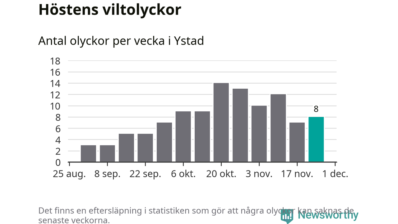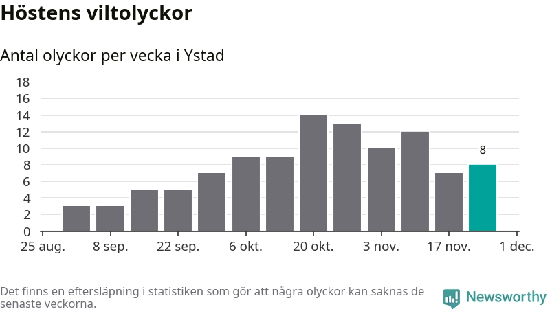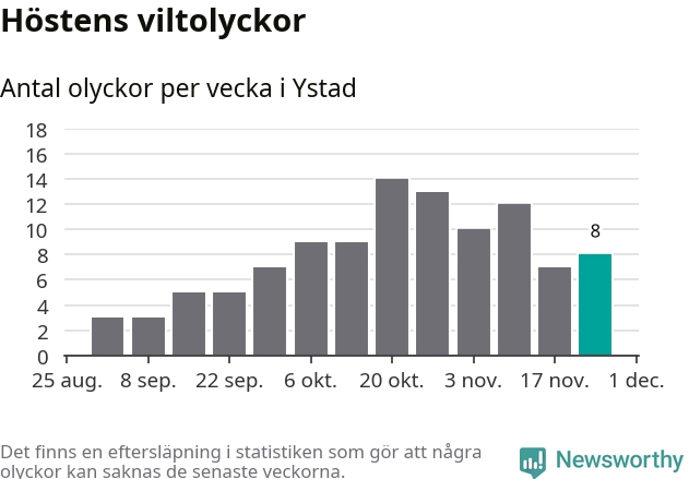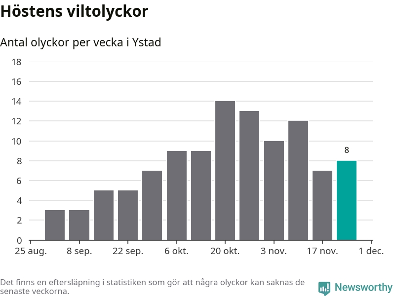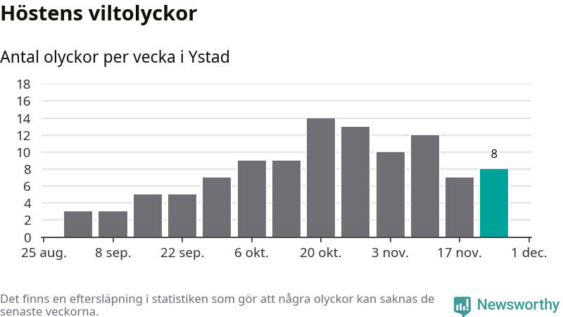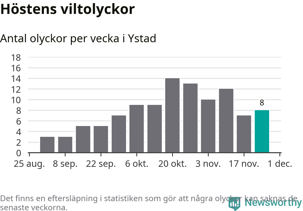 Hittills har åtta viltolyckor rapporterats in i Ystads kommun från vecka 48. Se listan här.
