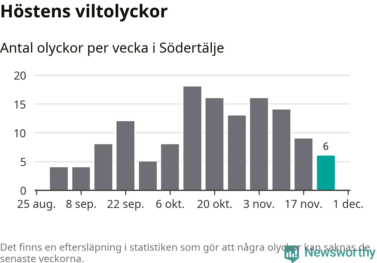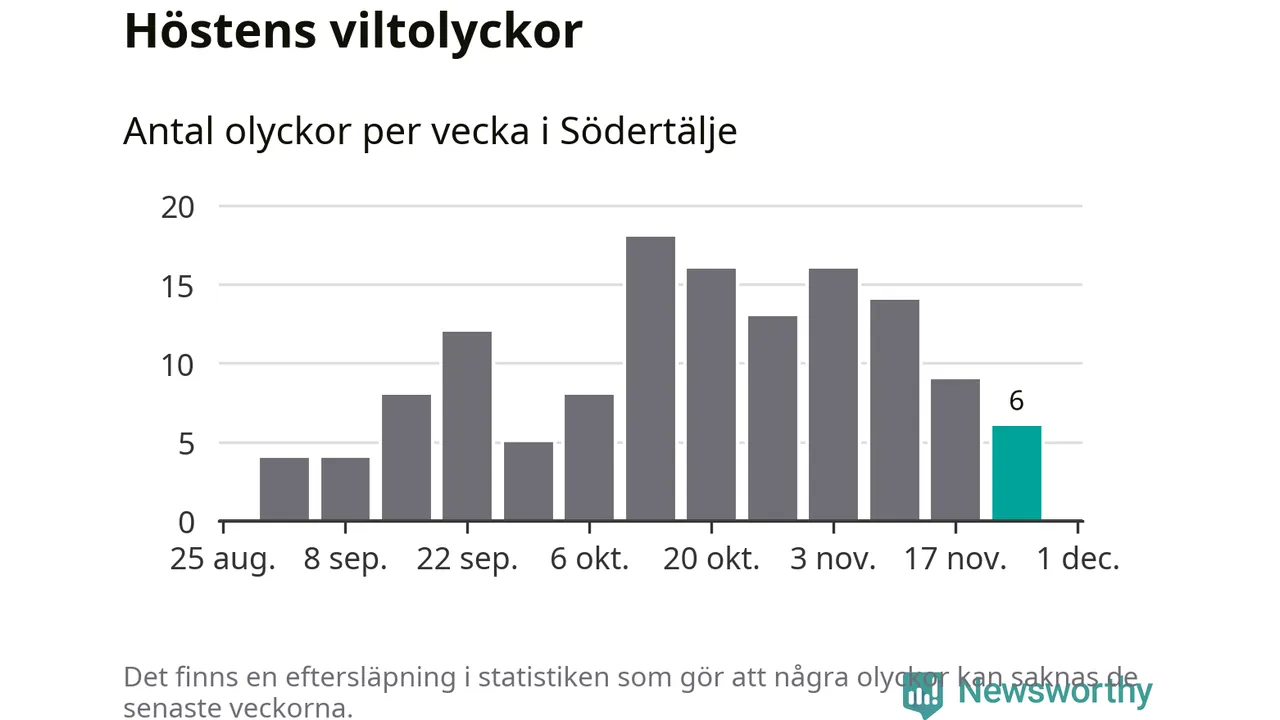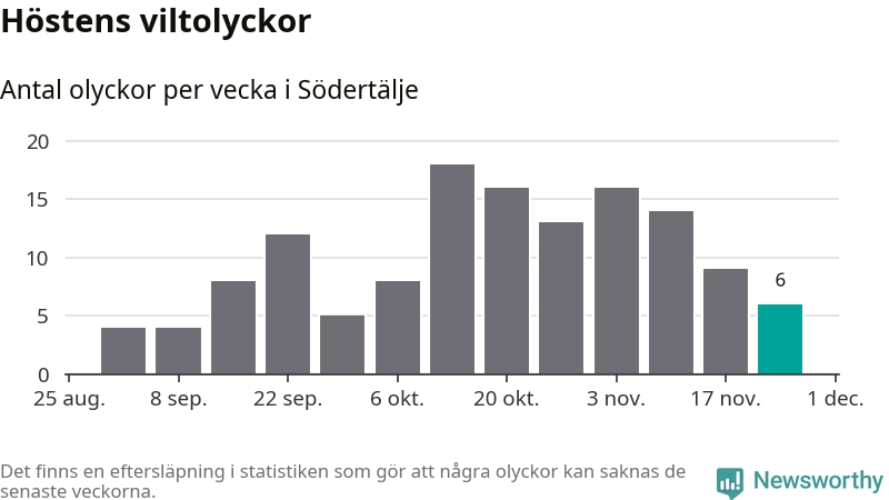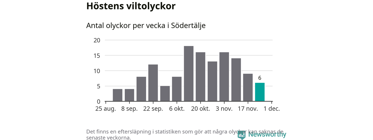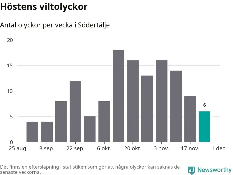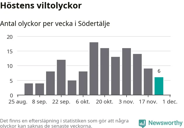 Hittills har sex viltolyckor rapporterats in i Södertälje kommun från vecka 48. Se listan här.