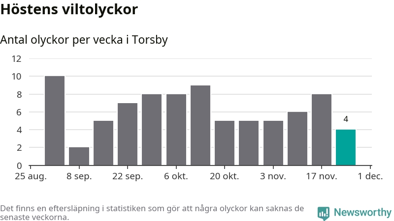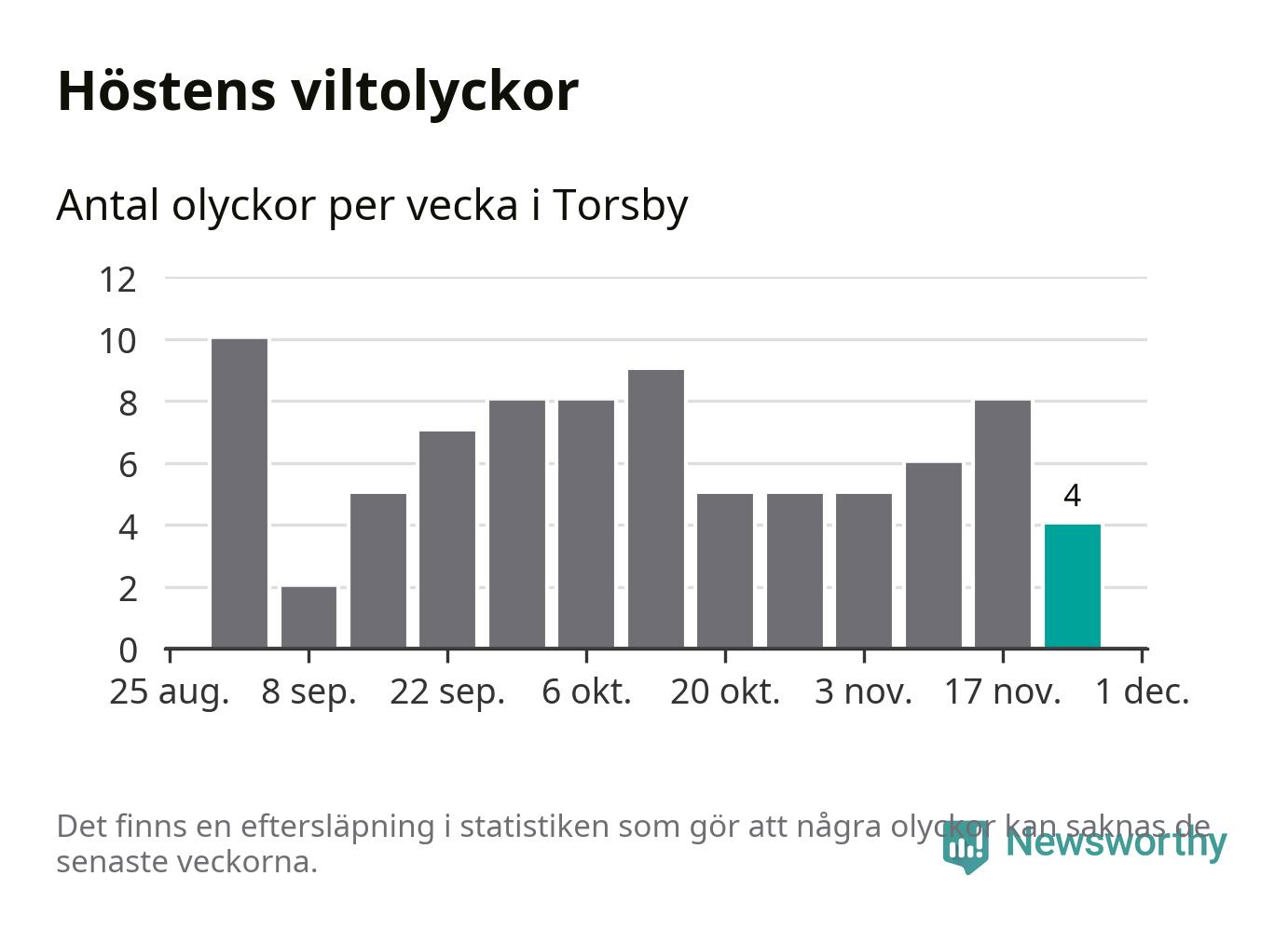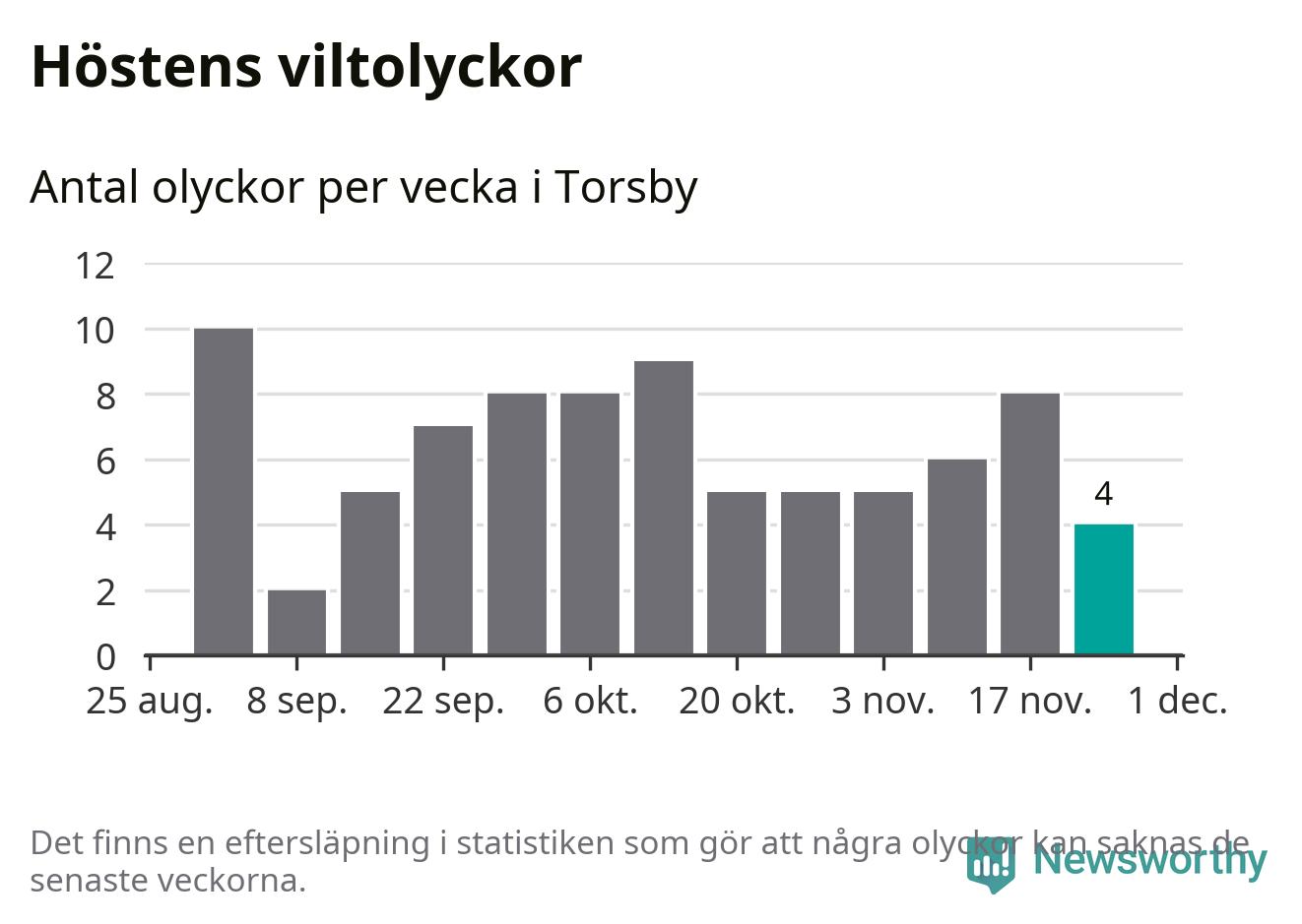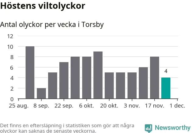 Totalt den här hösten har det inträffat 82 viltolyckor i kommunen. Det är mindre än genomsnittet för motsvarande period (omkring 94) de senaste tio åren.