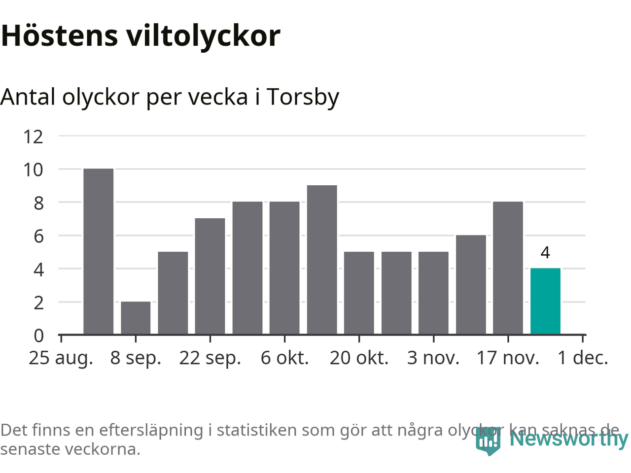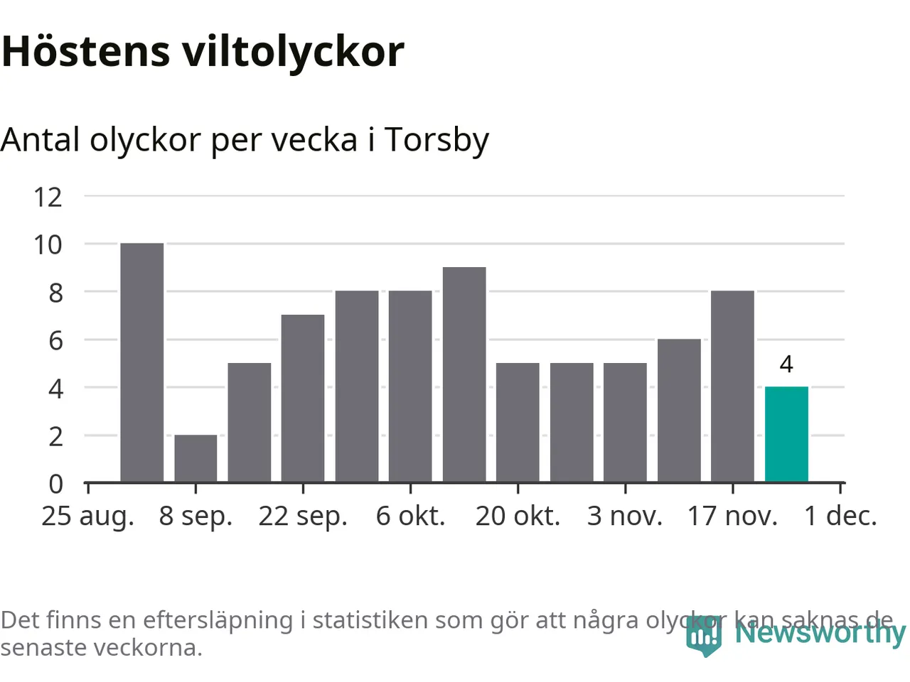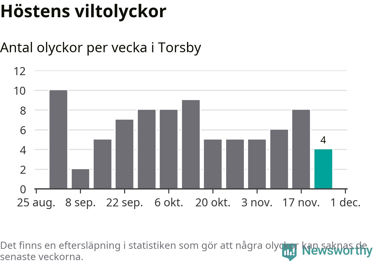 Totalt den här hösten har det inträffat 82 viltolyckor i kommunen. Det är mindre än genomsnittet för motsvarande period (omkring 94) de senaste tio åren.