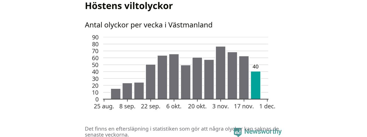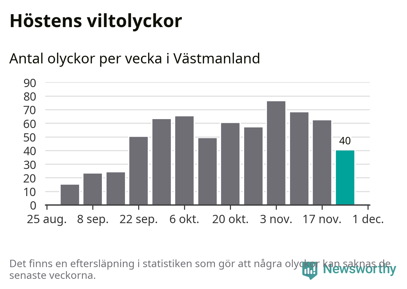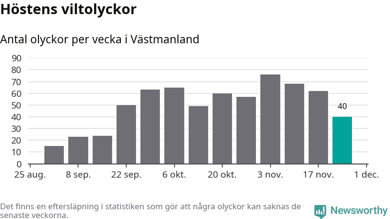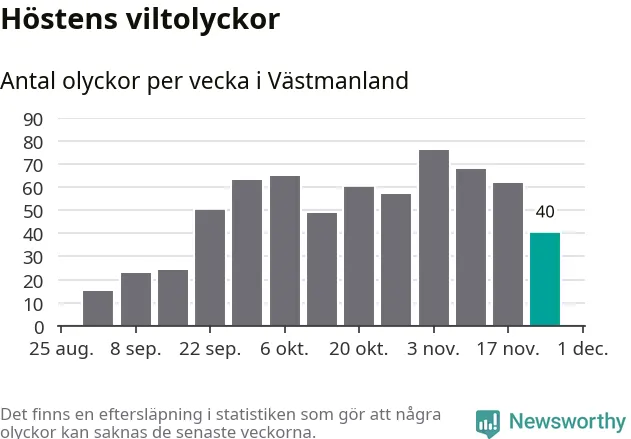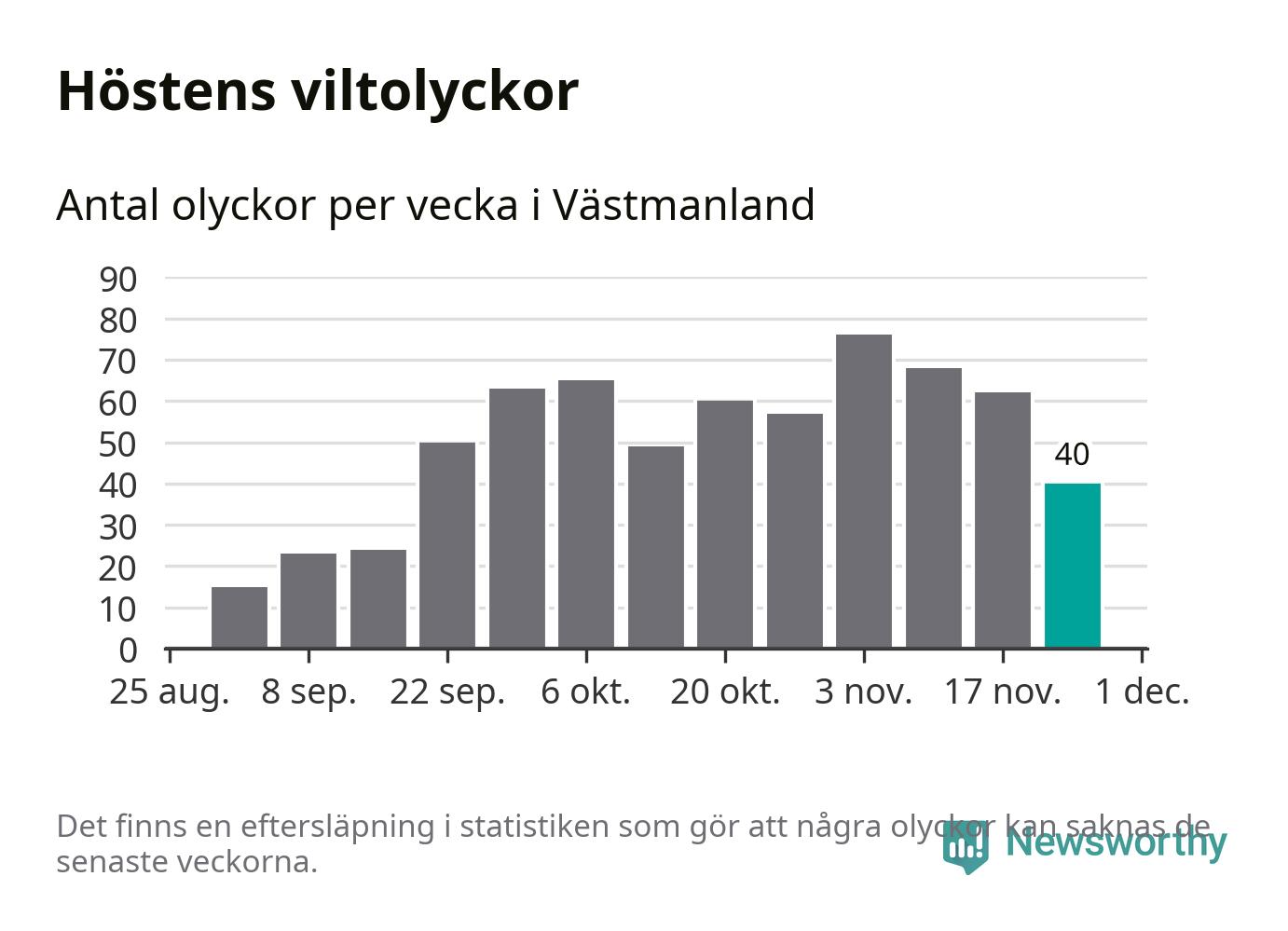 Hittills har 40 viltolyckor rapporterats in i Västmanlands län från vecka 48. Se listan här.