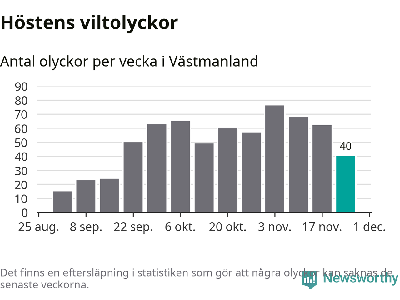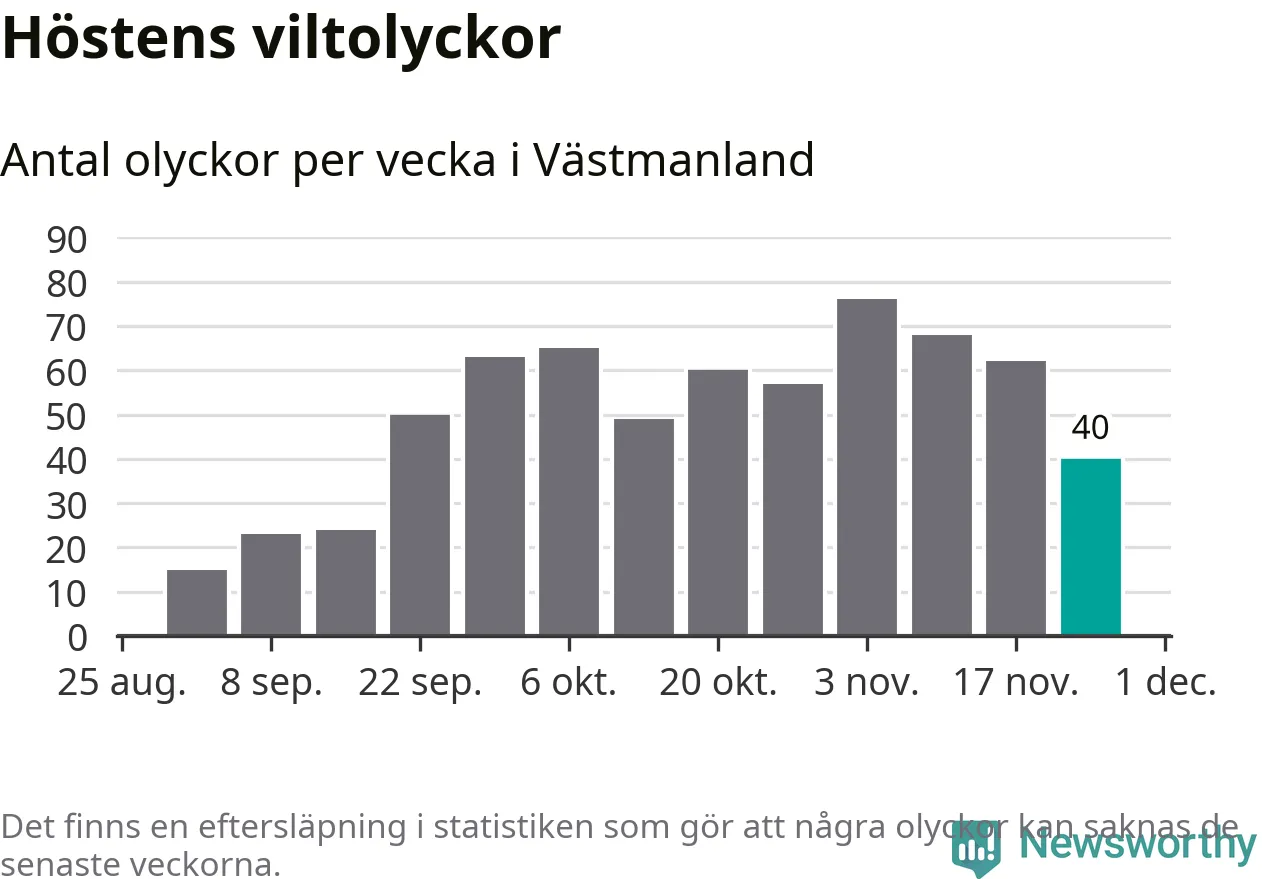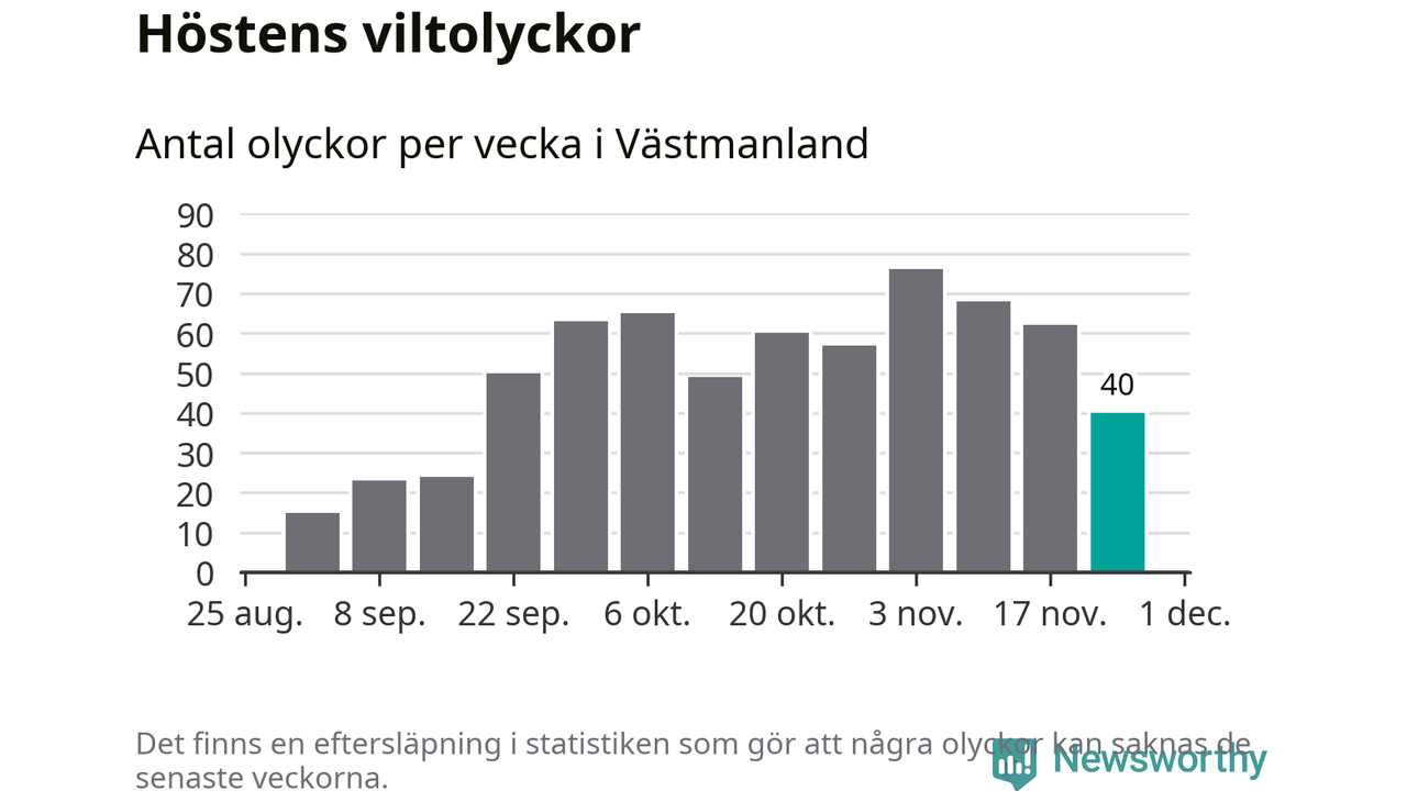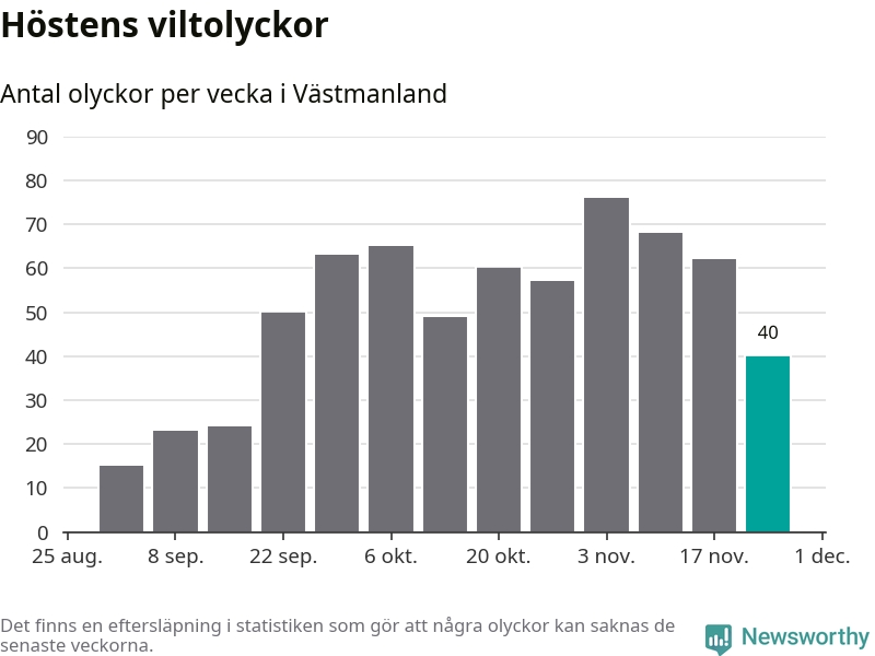 Hittills har 40 viltolyckor rapporterats in i Västmanlands län från vecka 48. Se listan här.