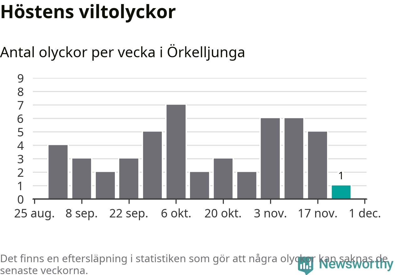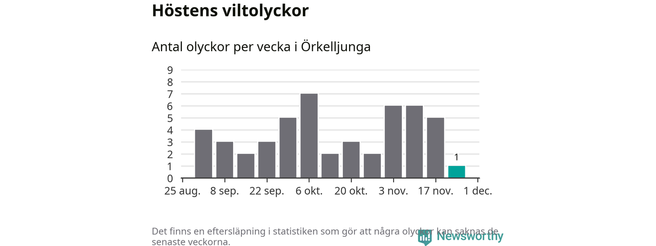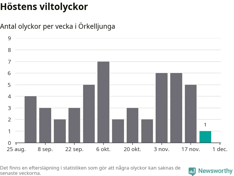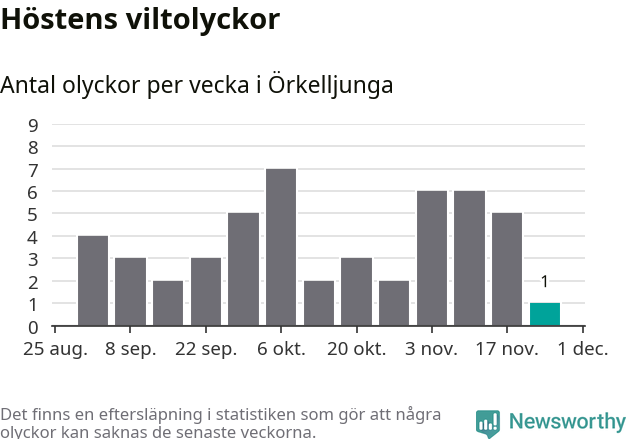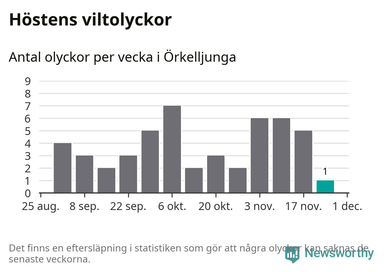 Från förra veckan (vecka 48) har hittills en viltolycka rapporterats in i Örkelljunga kommun.