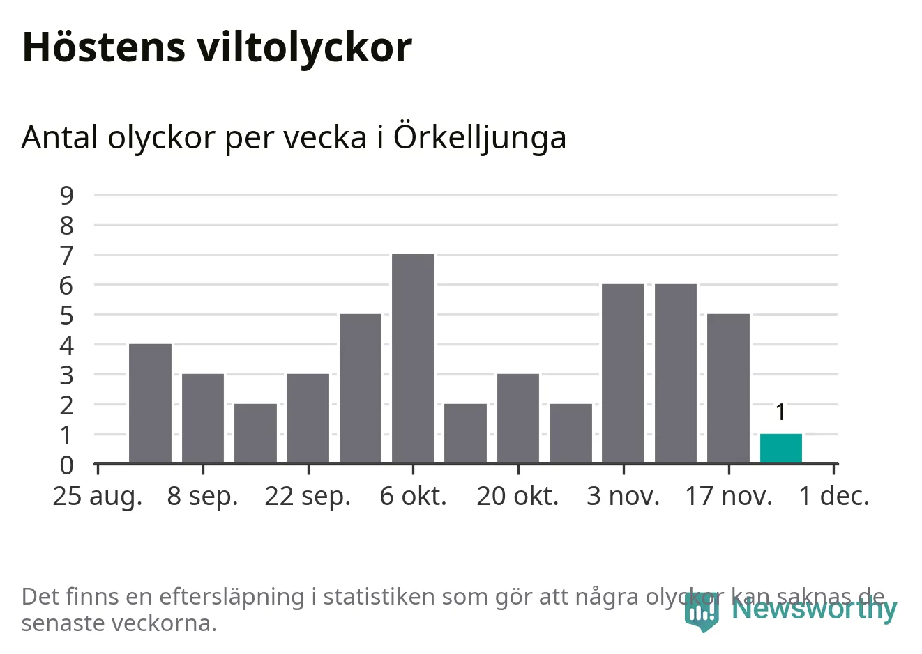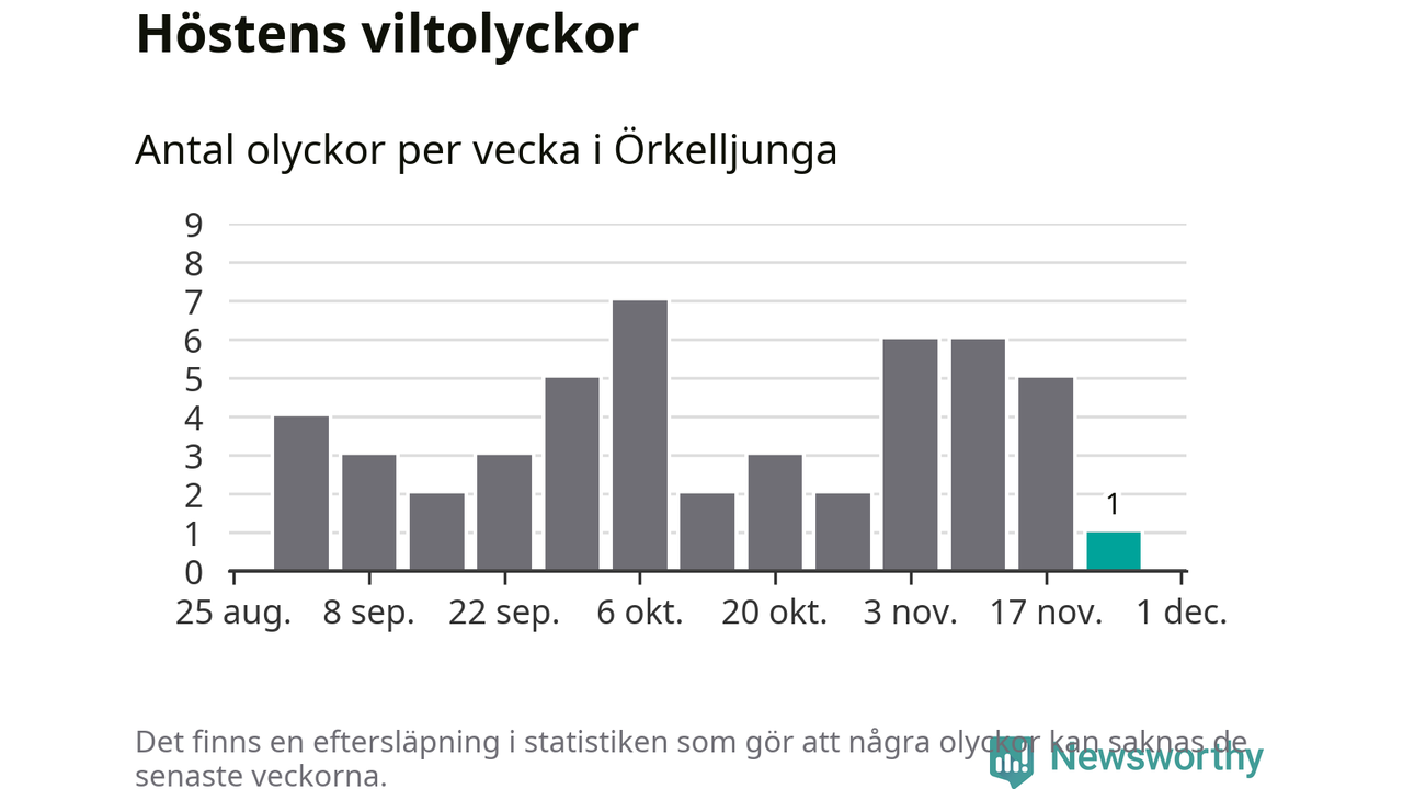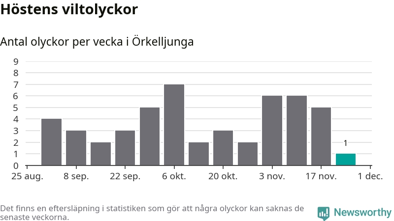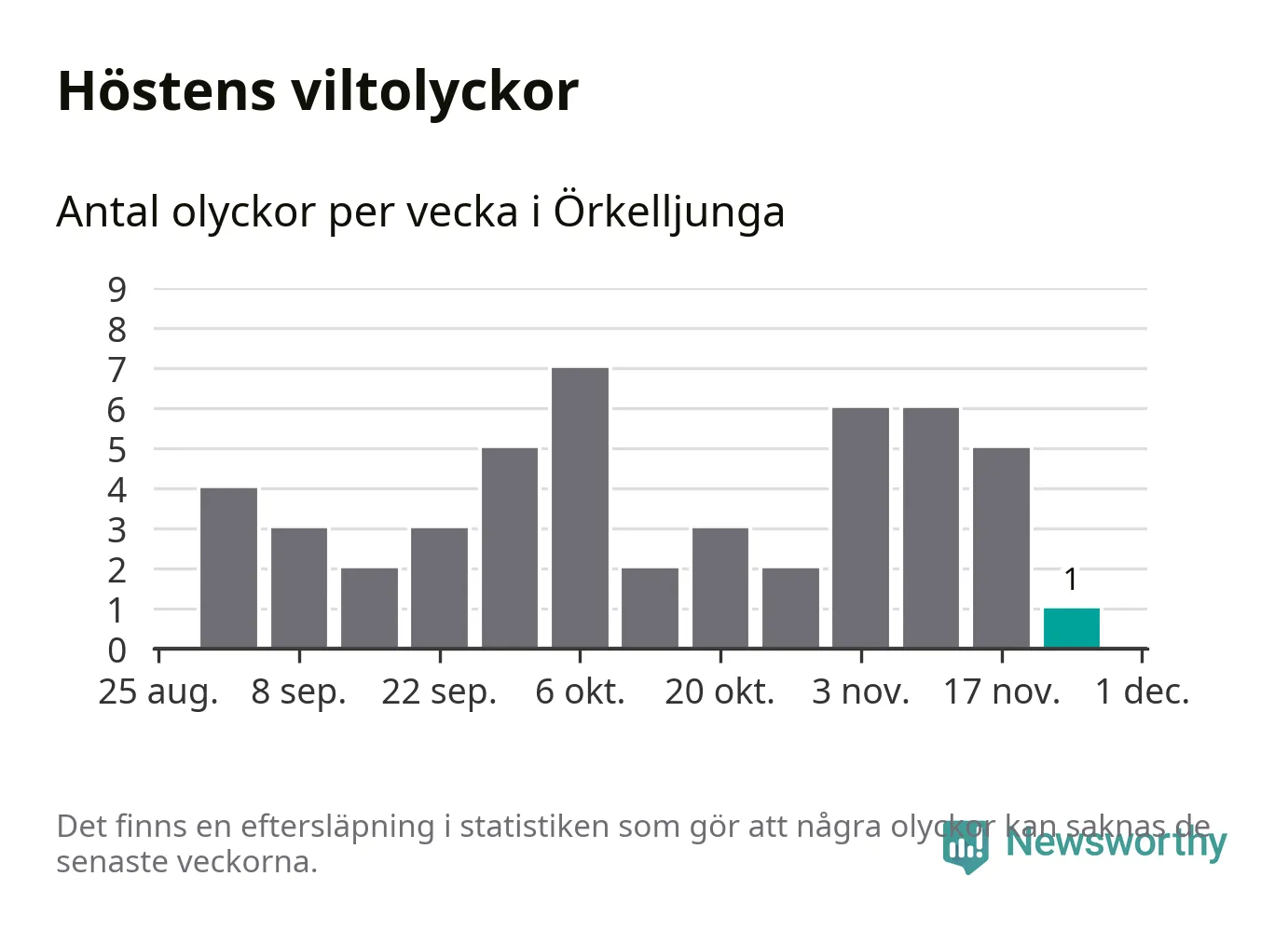 Från förra veckan (vecka 48) har hittills en viltolycka rapporterats in i Örkelljunga kommun.