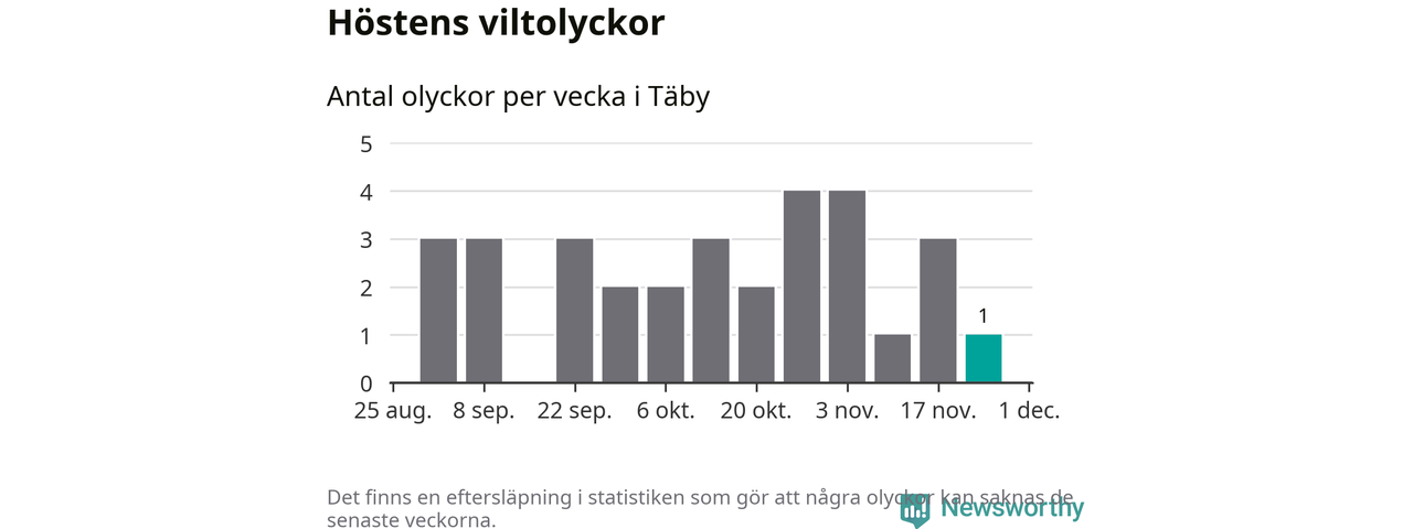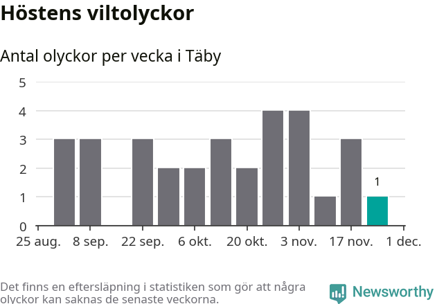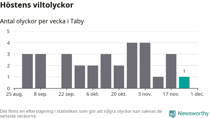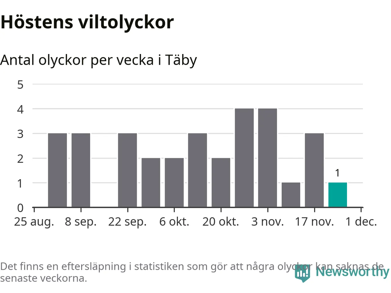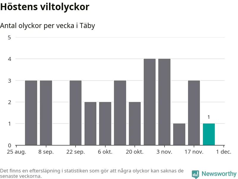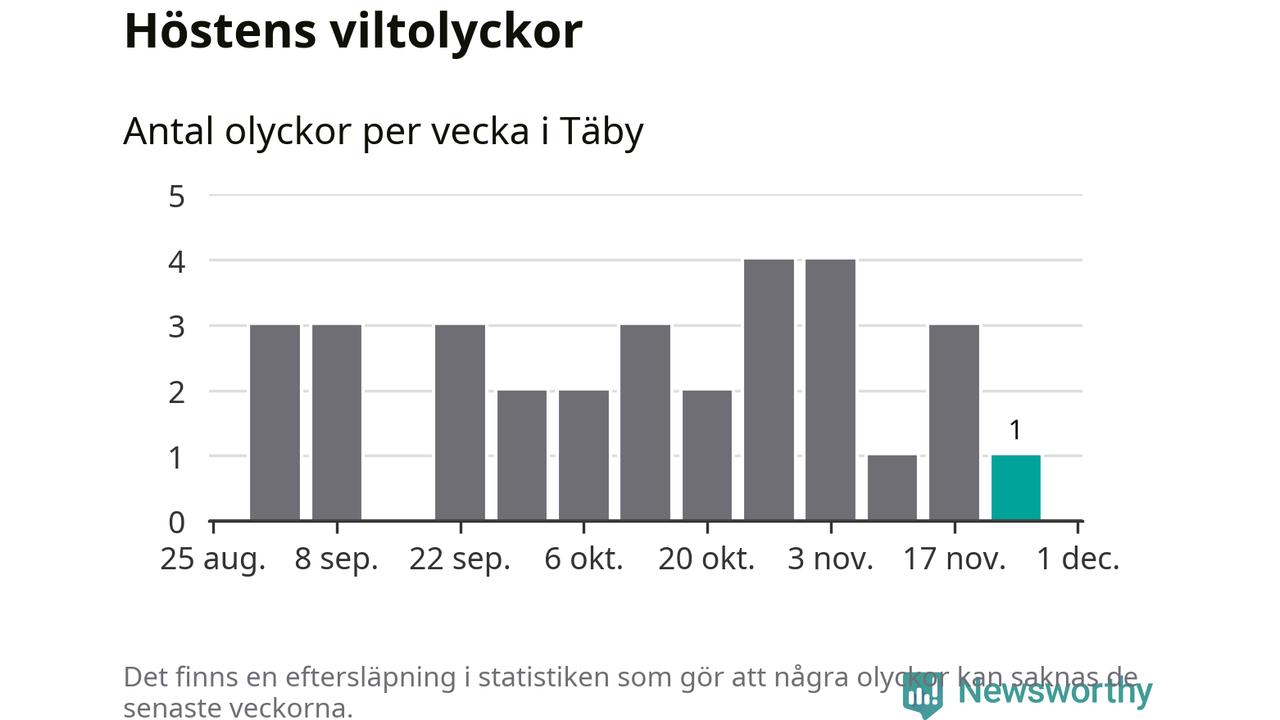 Från förra veckan (vecka 48) har hittills en viltolycka rapporterats in i Täby kommun.