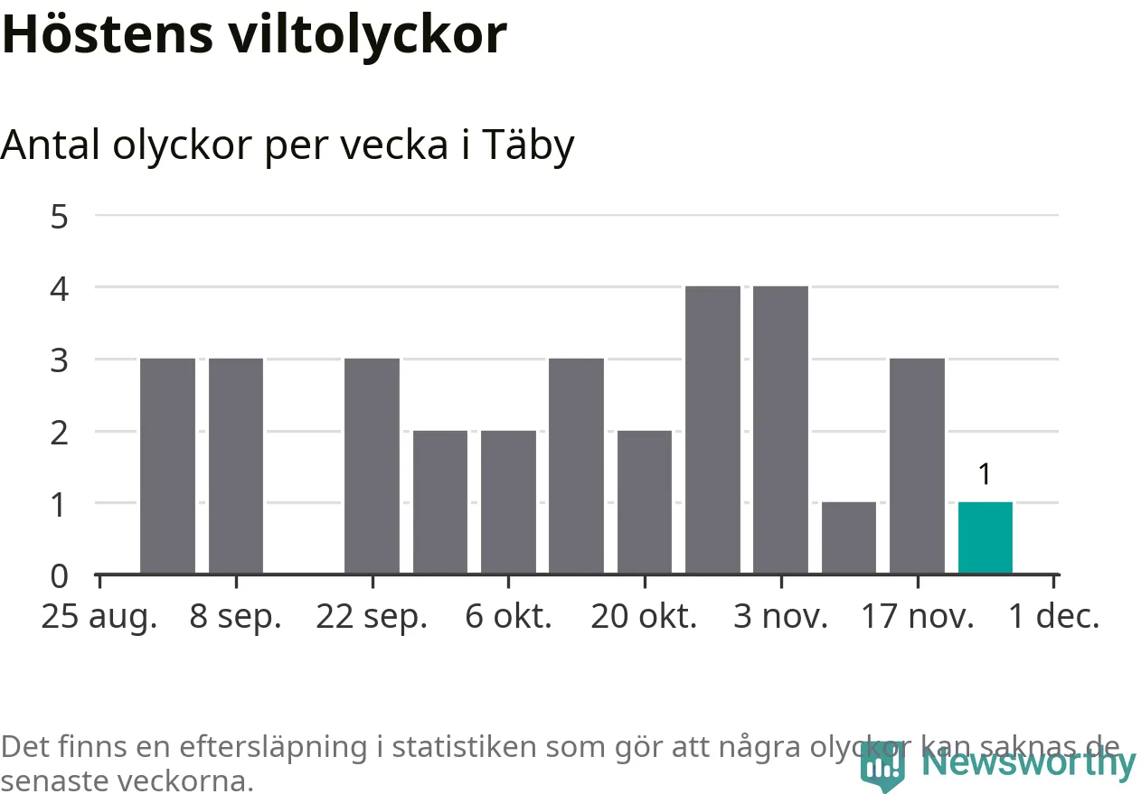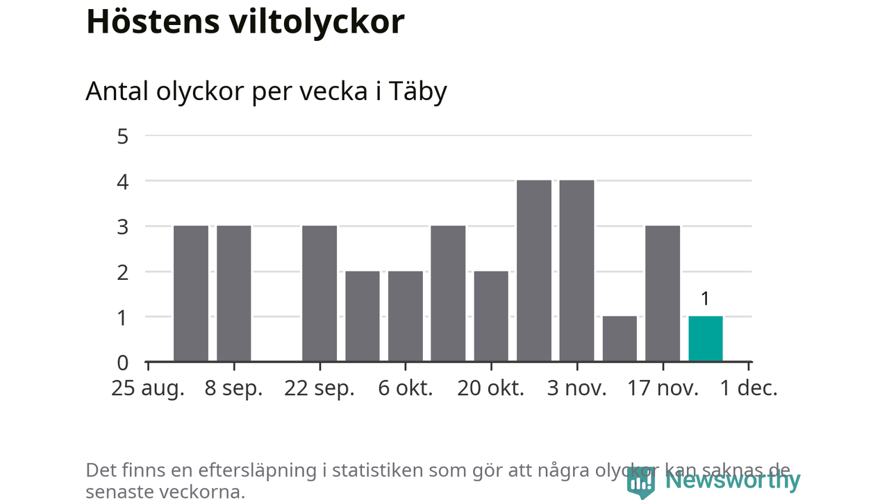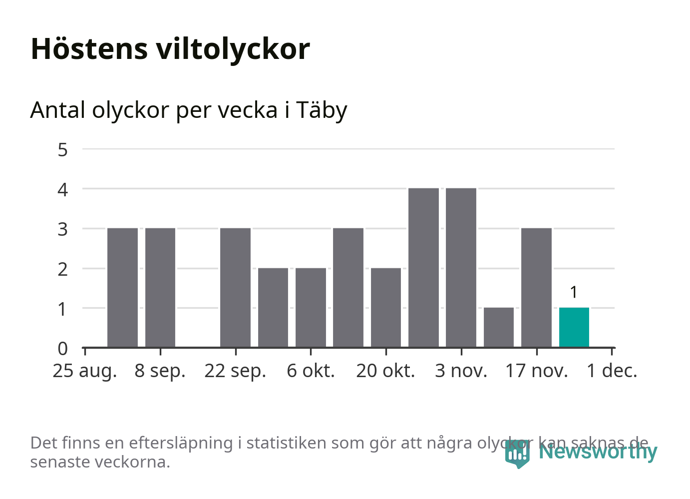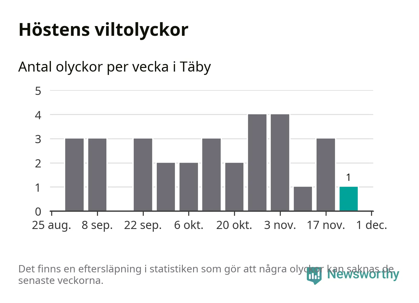 Från förra veckan (vecka 48) har hittills en viltolycka rapporterats in i Täby kommun.