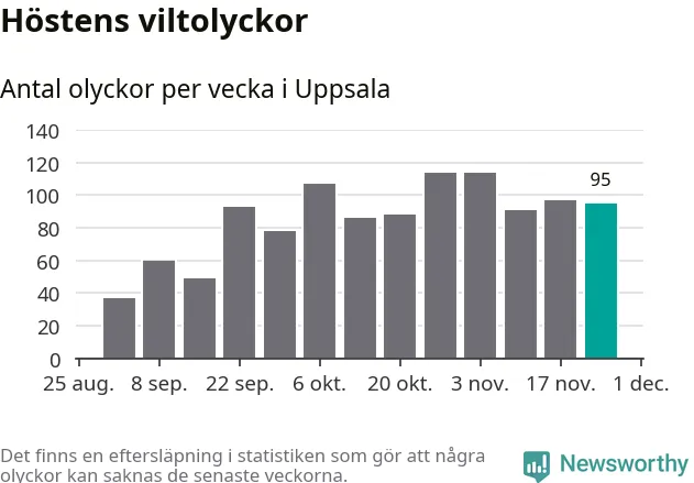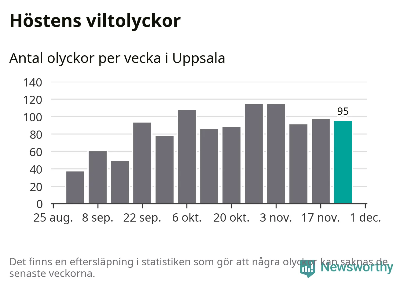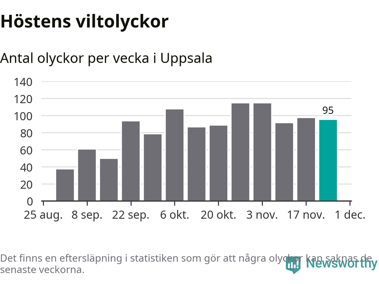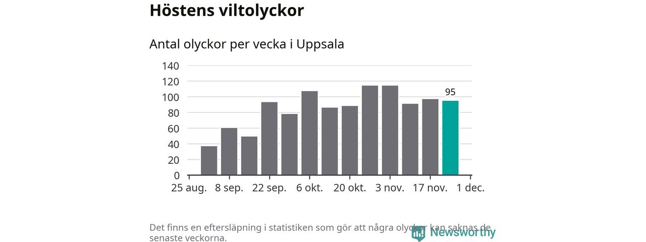 Hittills har 95 viltolyckor rapporterats in i Uppsala län från vecka 48. Se listan här.