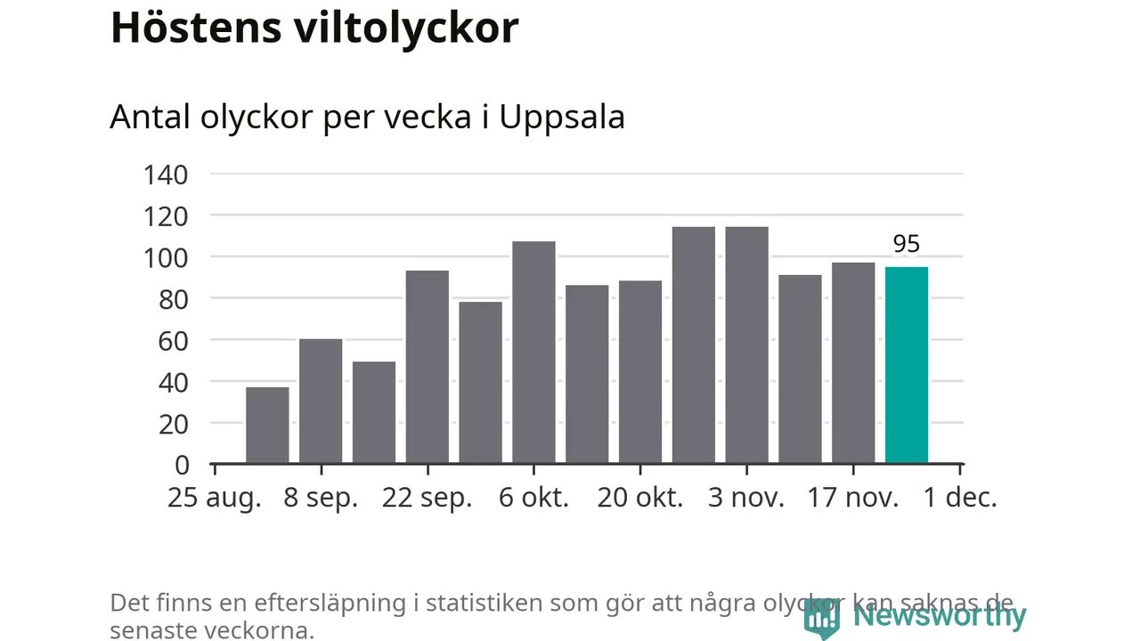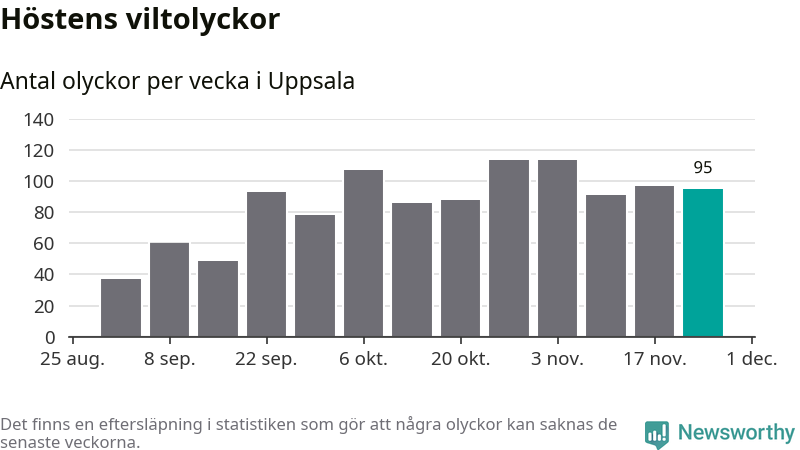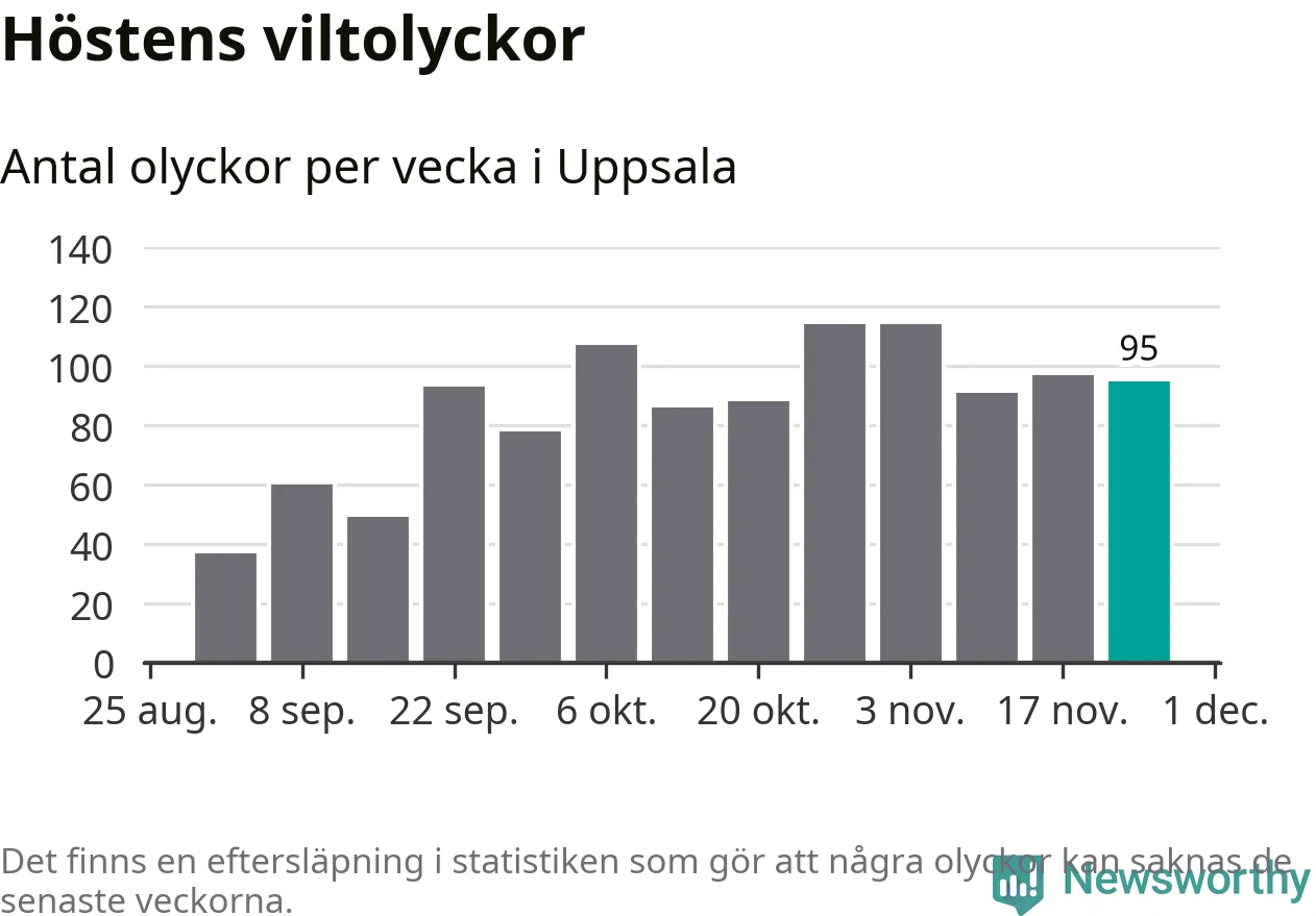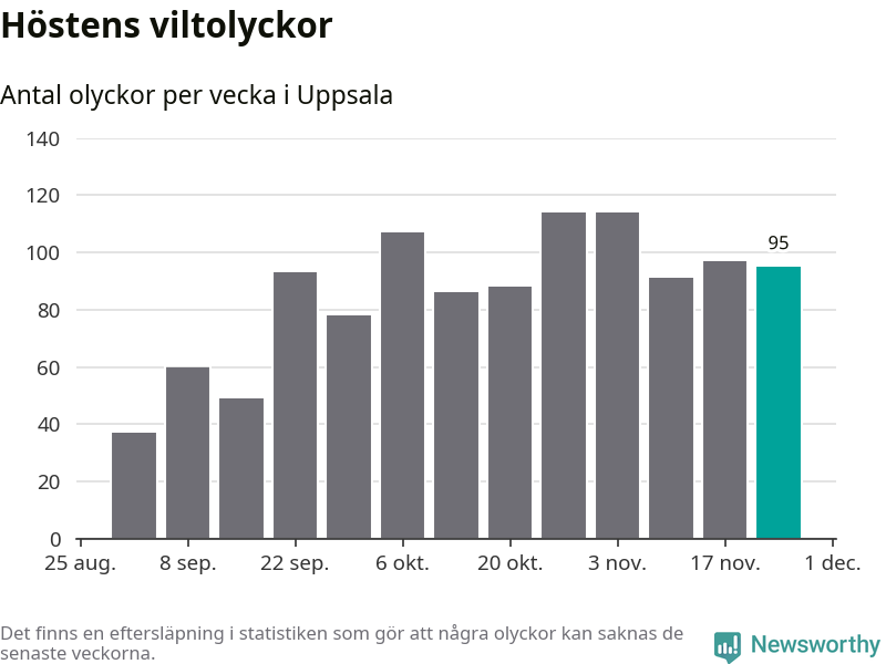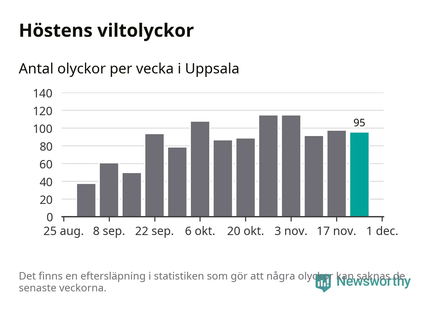 Hittills har 95 viltolyckor rapporterats in i Uppsala län från vecka 48. Se listan här.