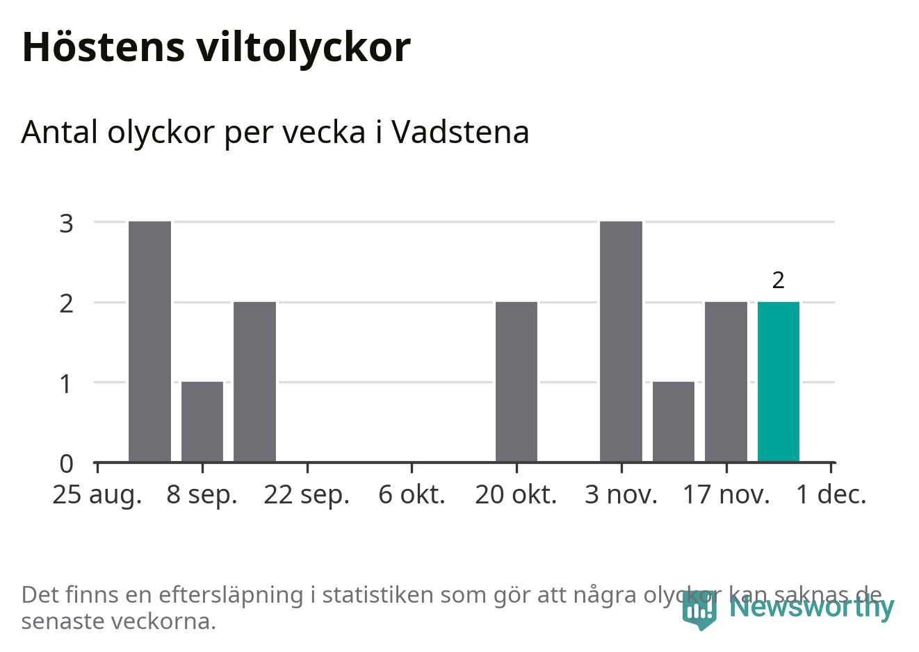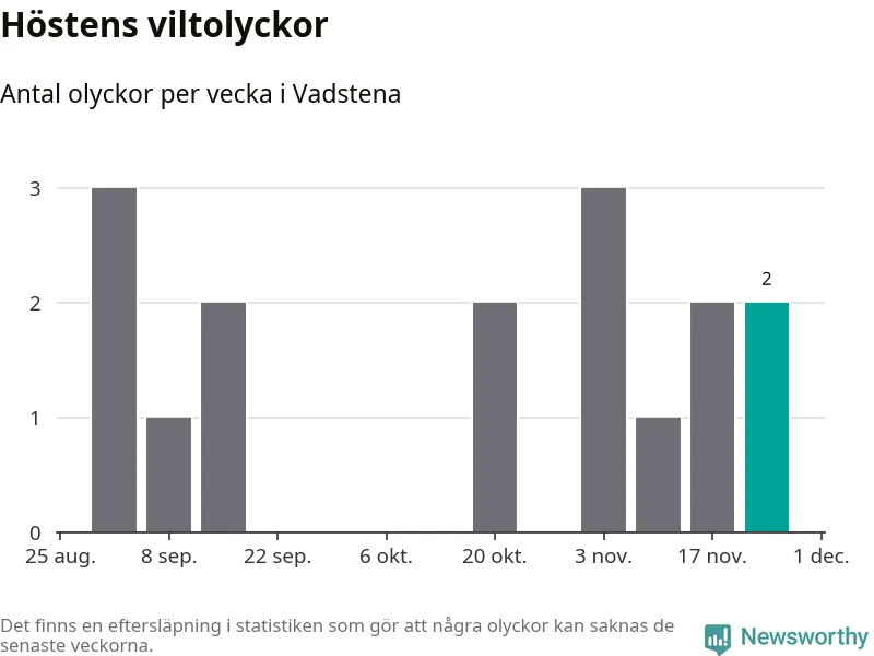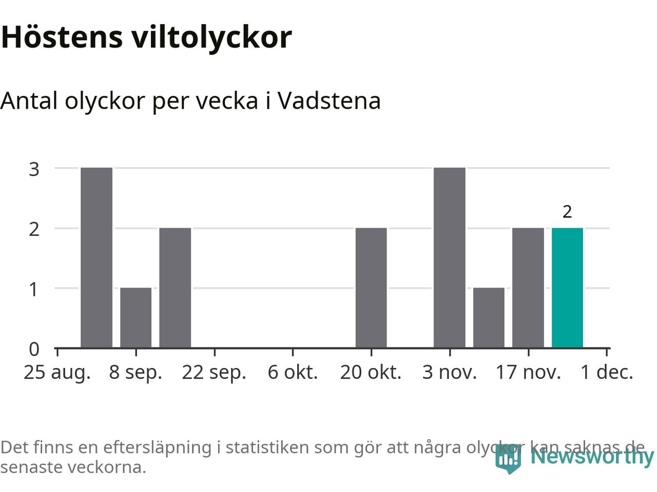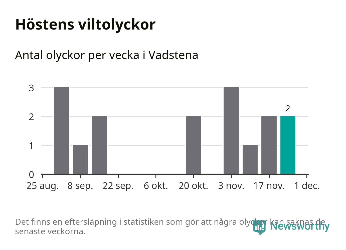 Hittills har två viltolyckor rapporterats in i Vadstena kommun från vecka 48. Se listan här.
