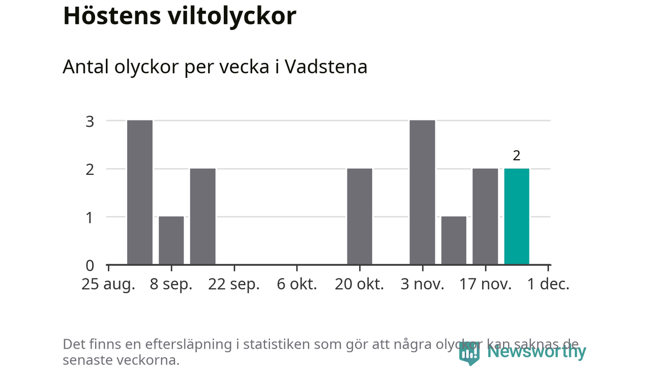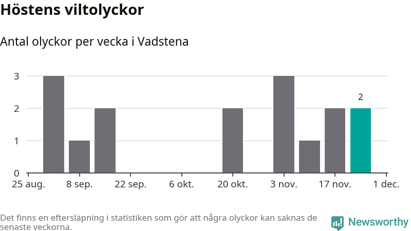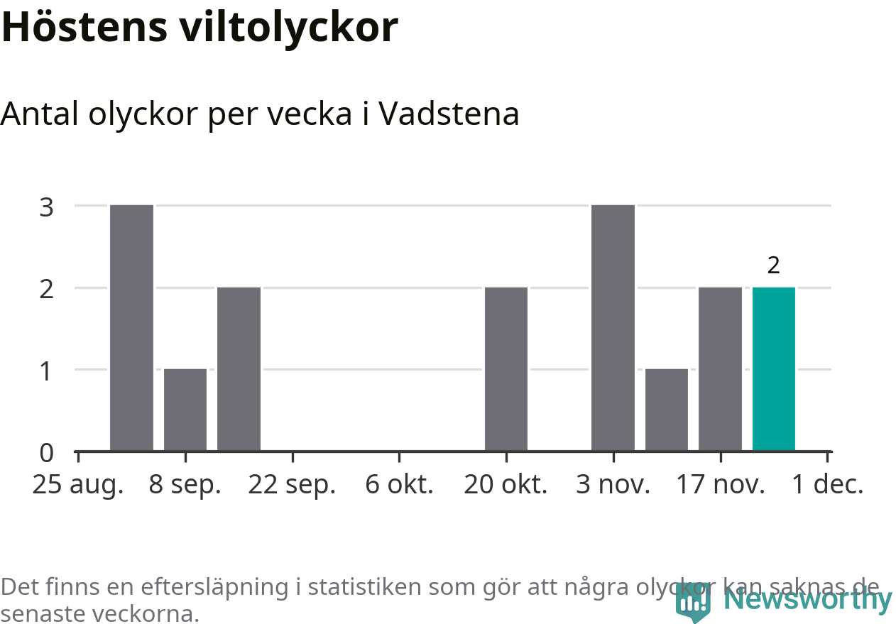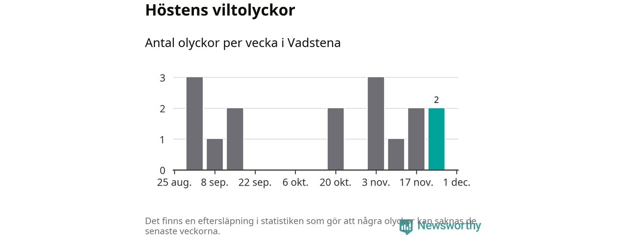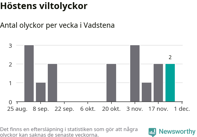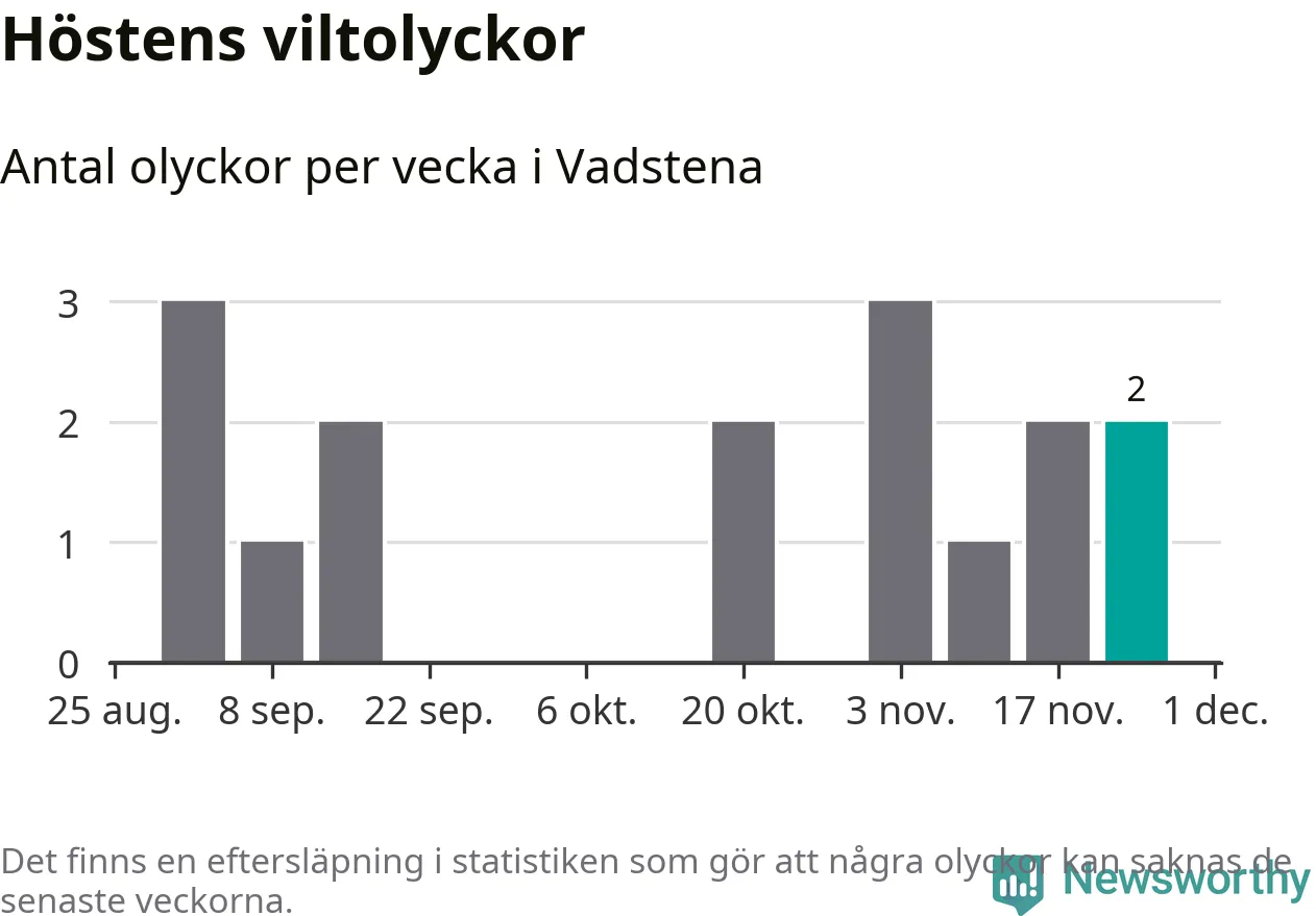 Hittills har två viltolyckor rapporterats in i Vadstena kommun från vecka 48. Se listan här.