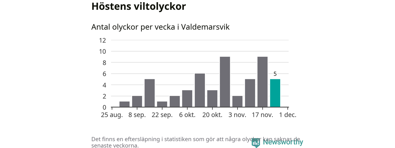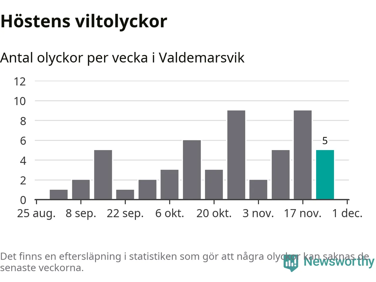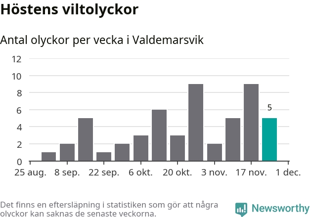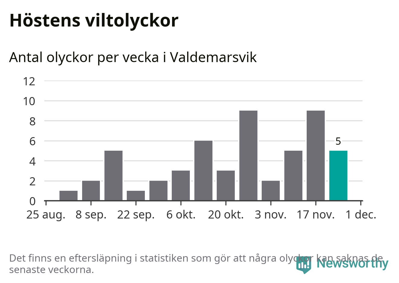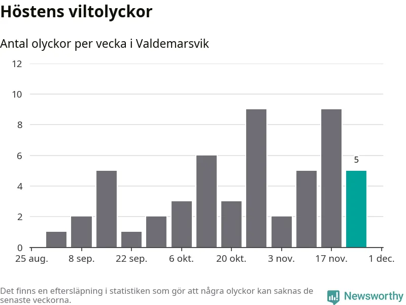 Hittills har fem viltolyckor rapporterats in i Valdemarsviks kommun från vecka 48. Se listan här.