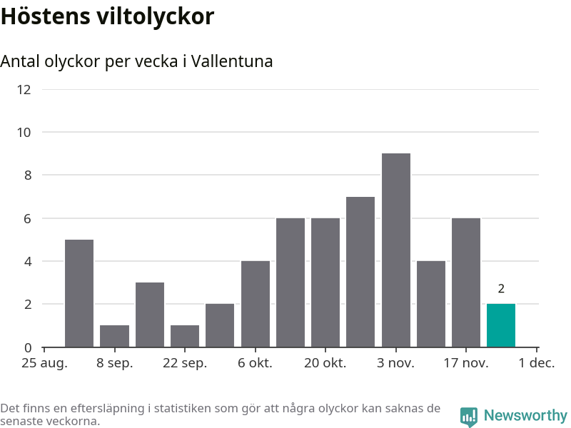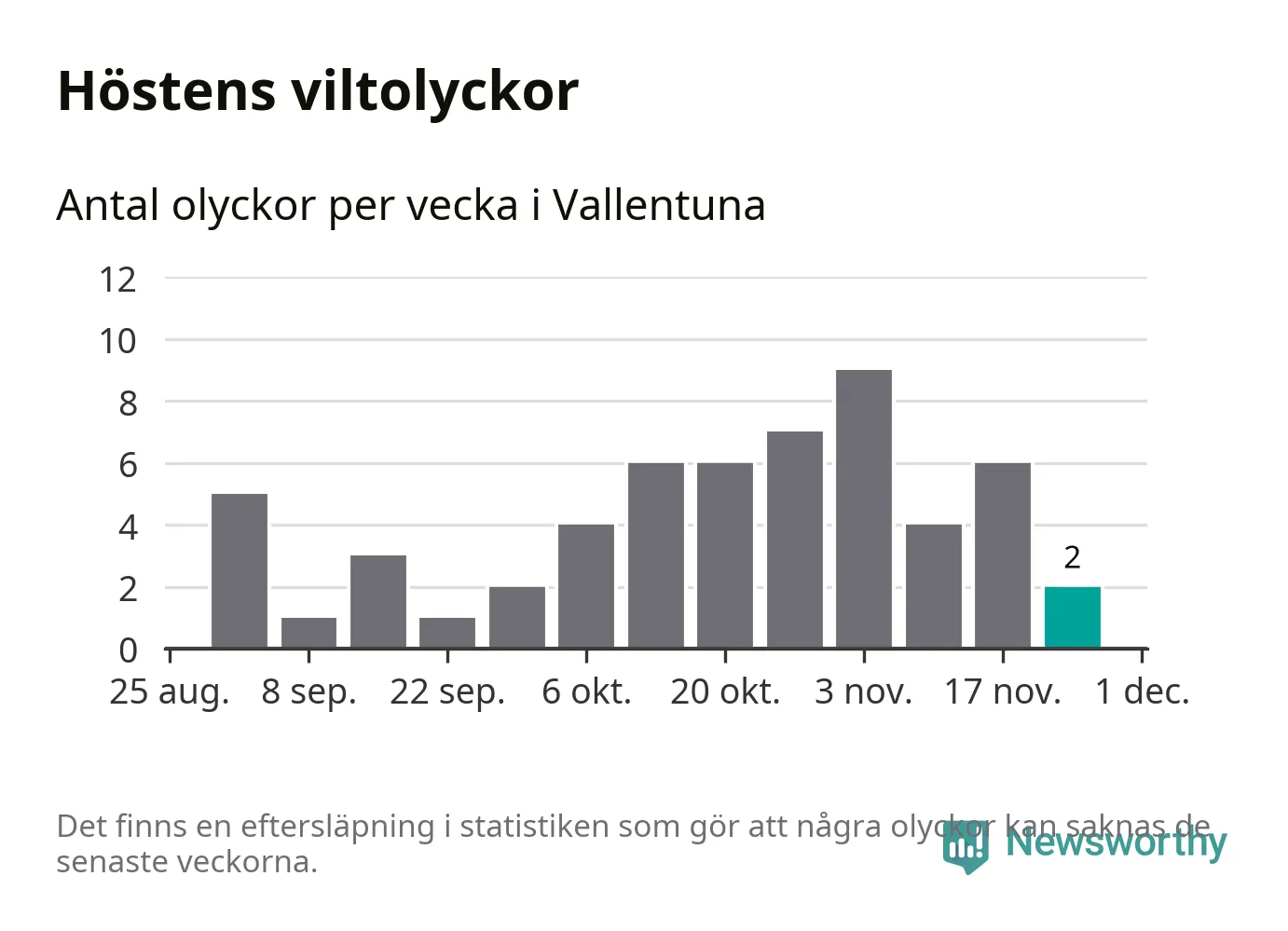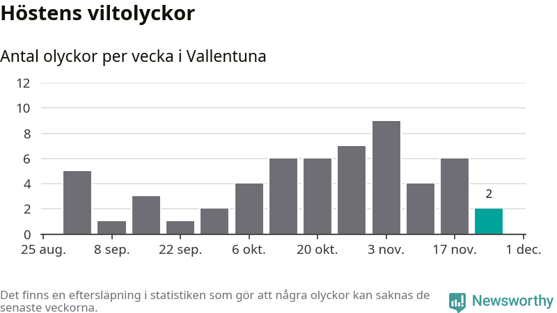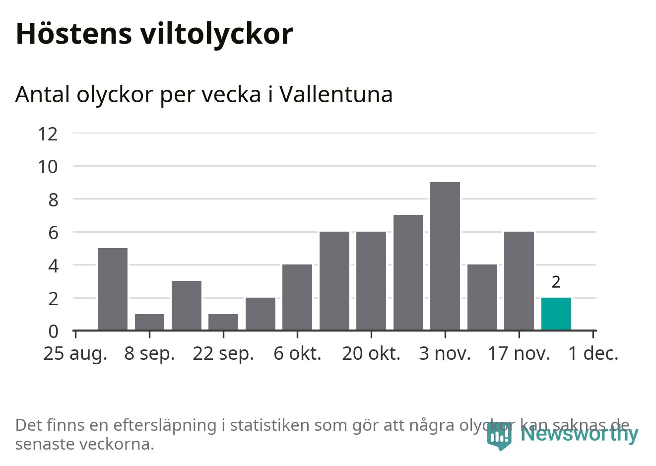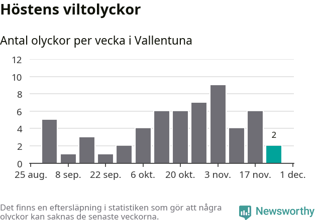 Hittills har två viltolyckor rapporterats in i Vallentuna kommun från vecka 48. Se listan här.