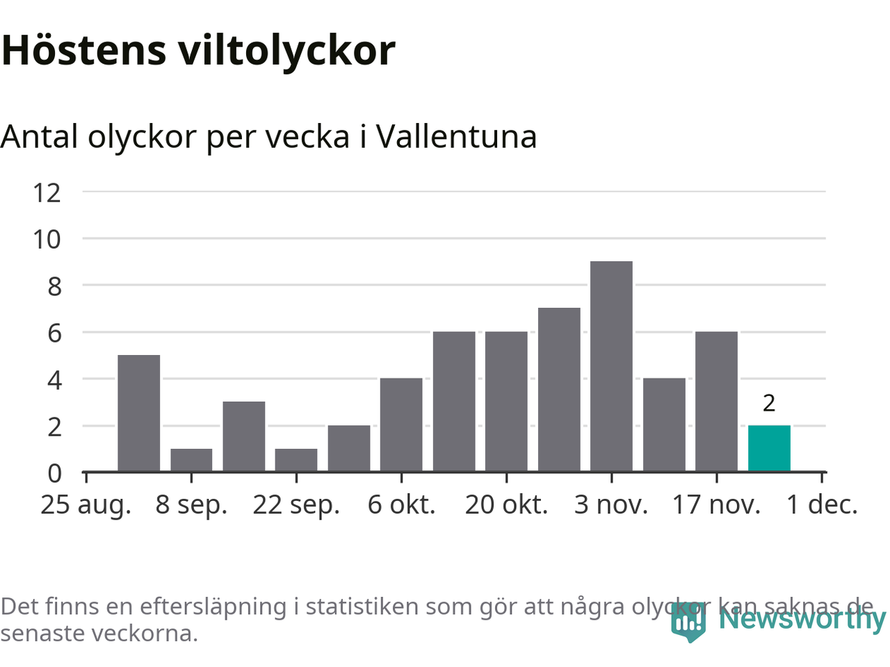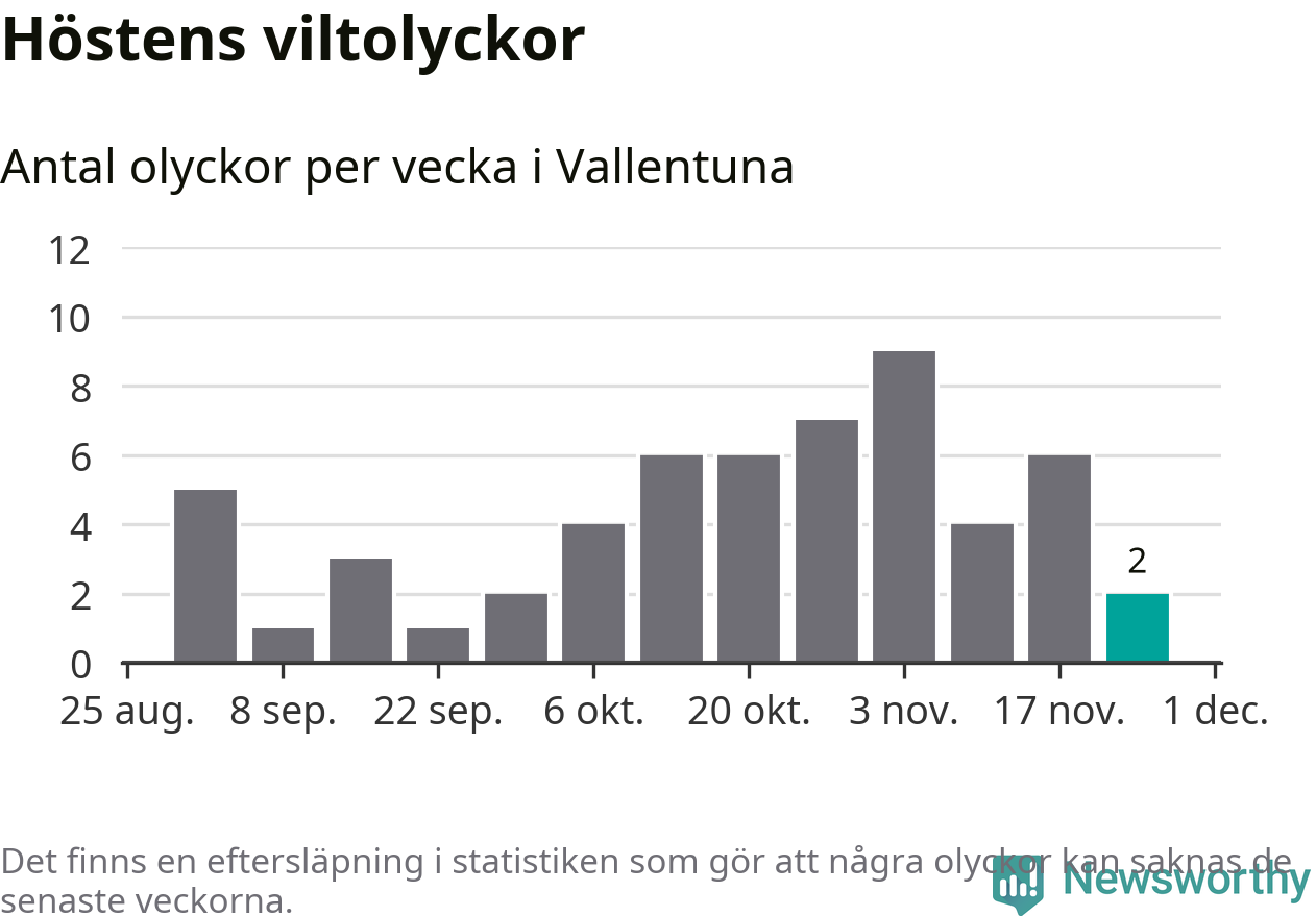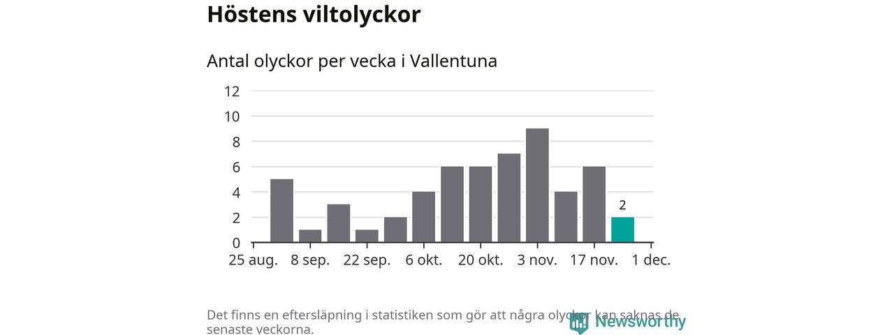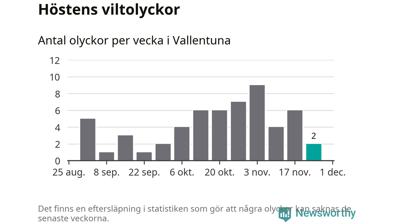 Hittills har två viltolyckor rapporterats in i Vallentuna kommun från vecka 48. Se listan här.