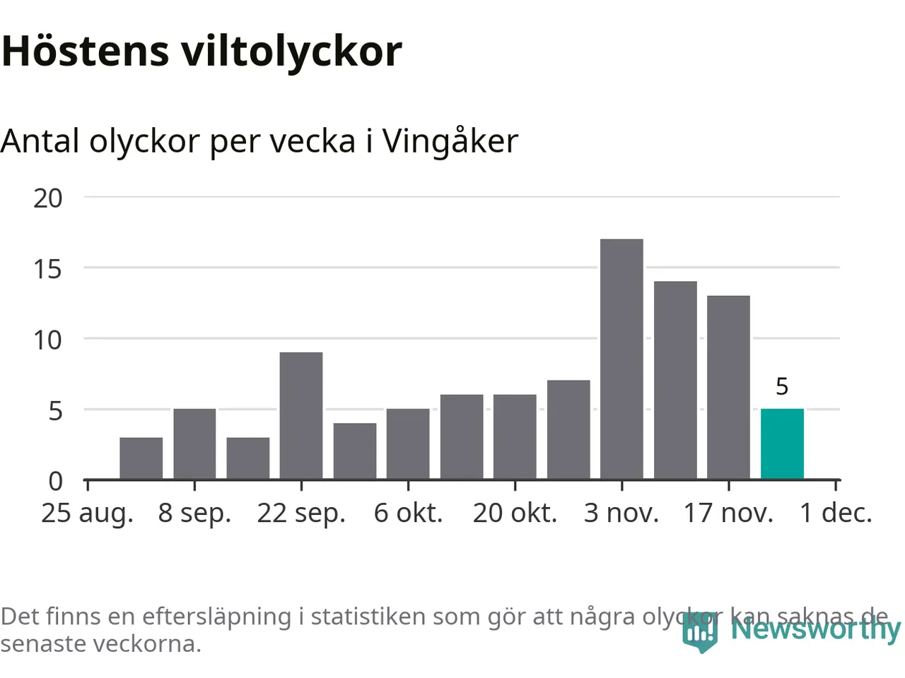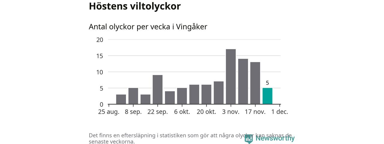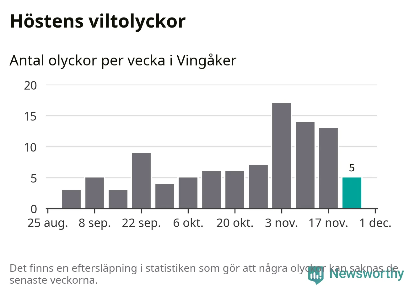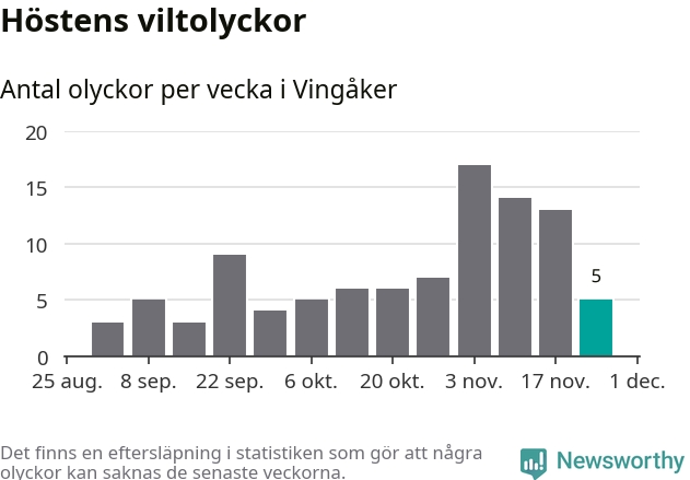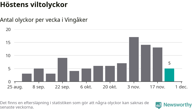 Hittills har fem viltolyckor rapporterats in i Vingåkers kommun från vecka 48. Se listan här.