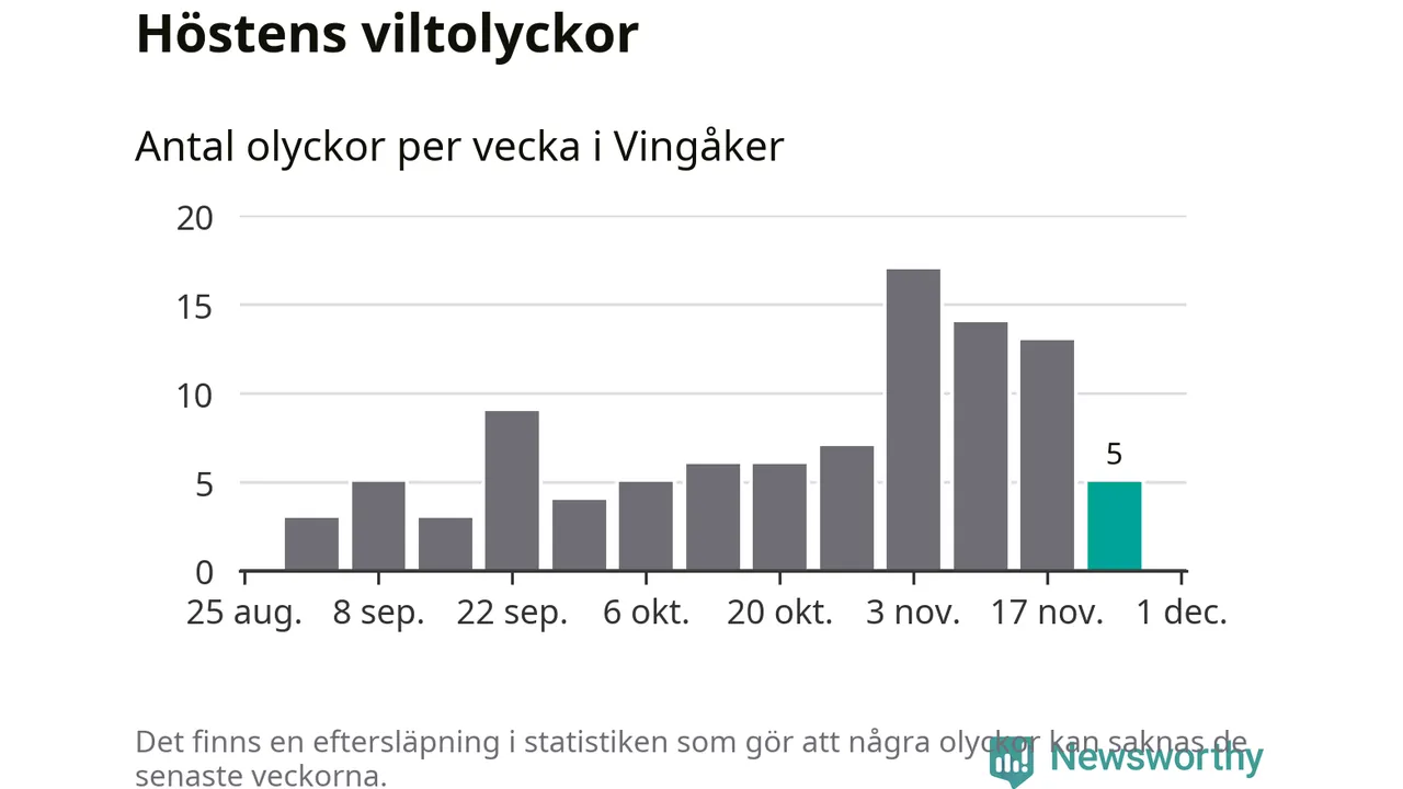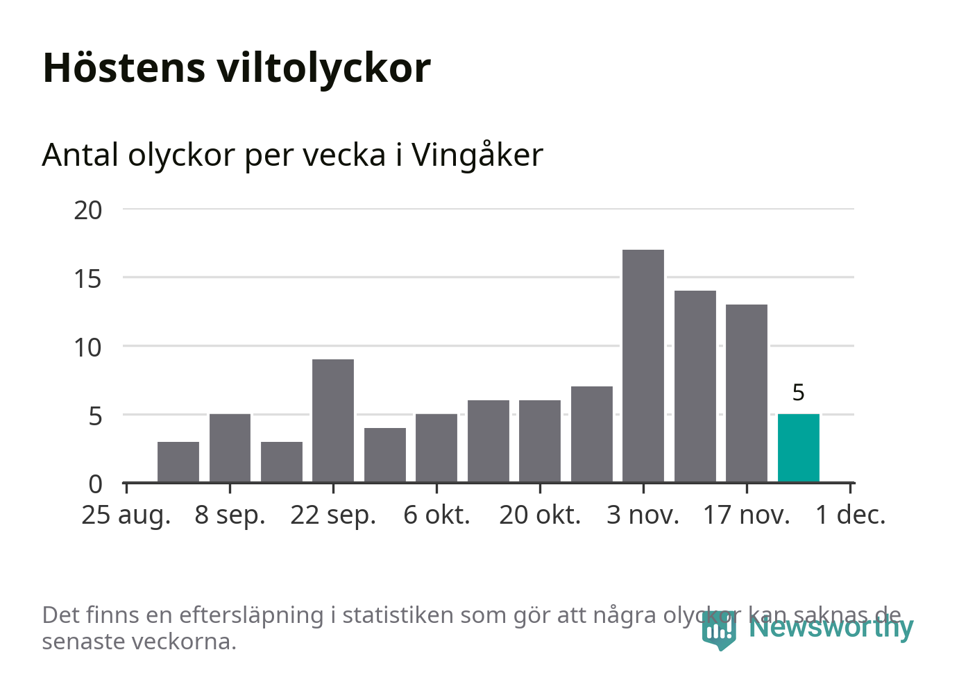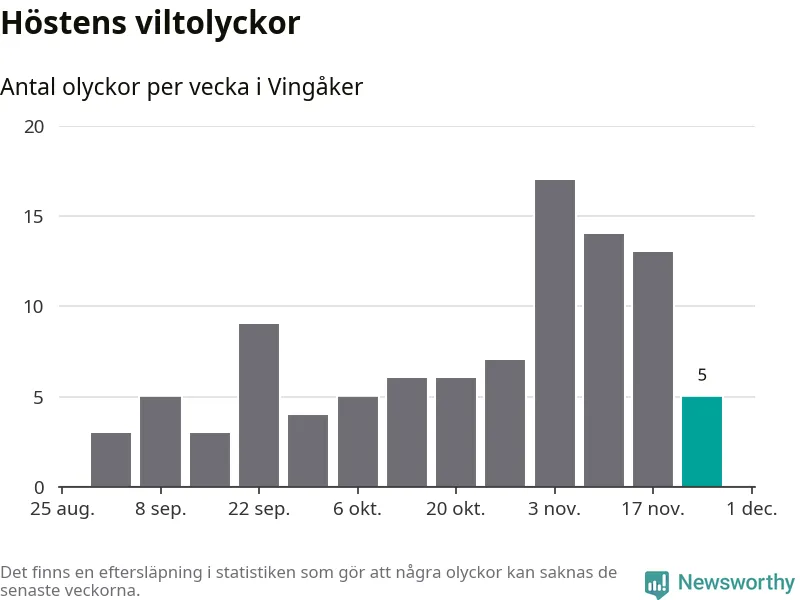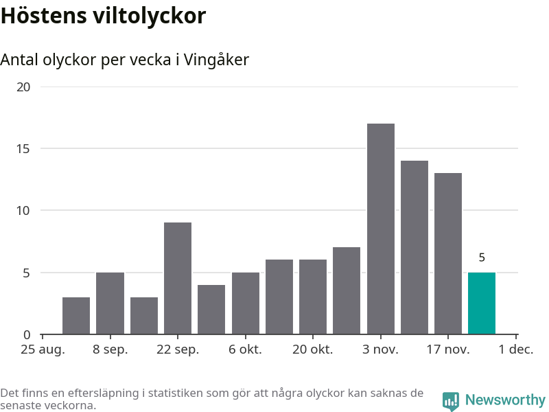 Hittills har fem viltolyckor rapporterats in i Vingåkers kommun från vecka 48. Se listan här.