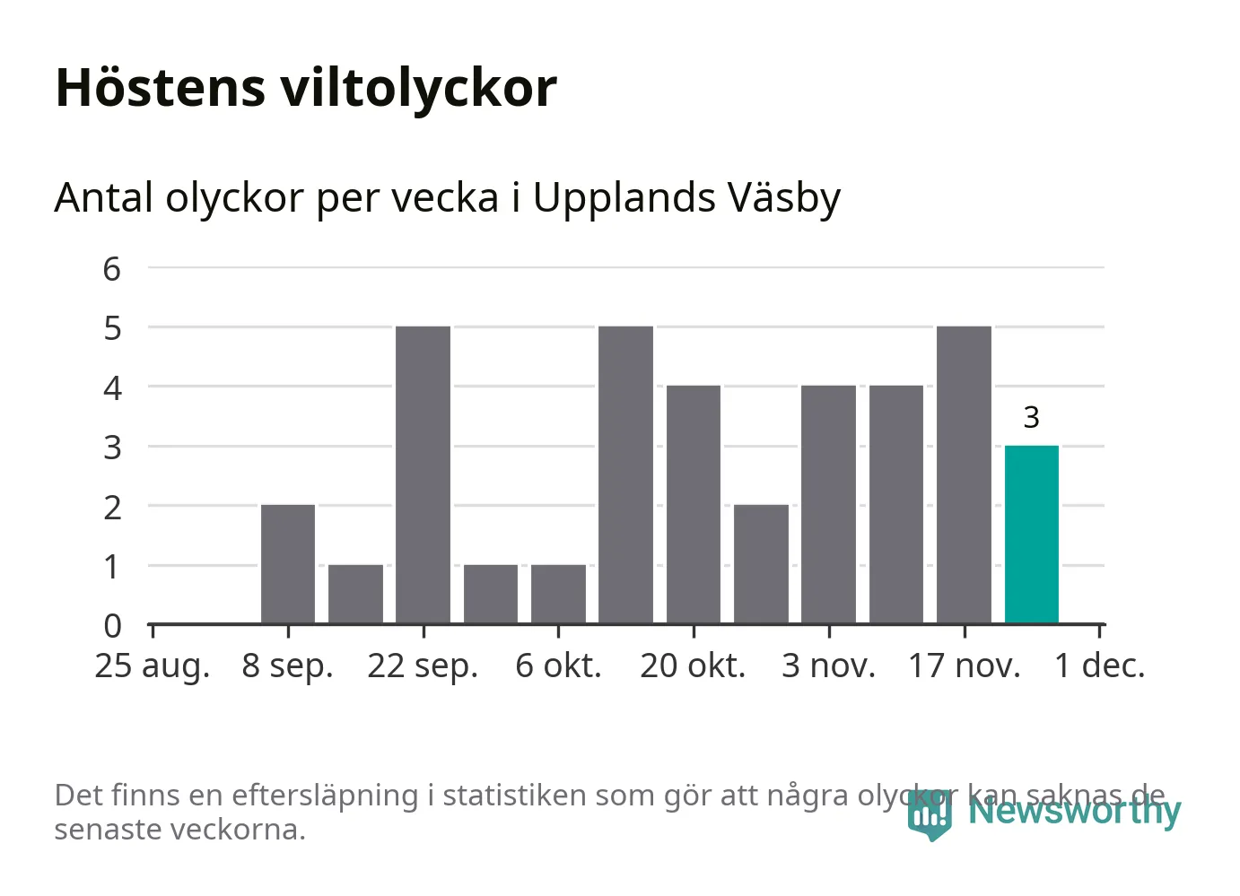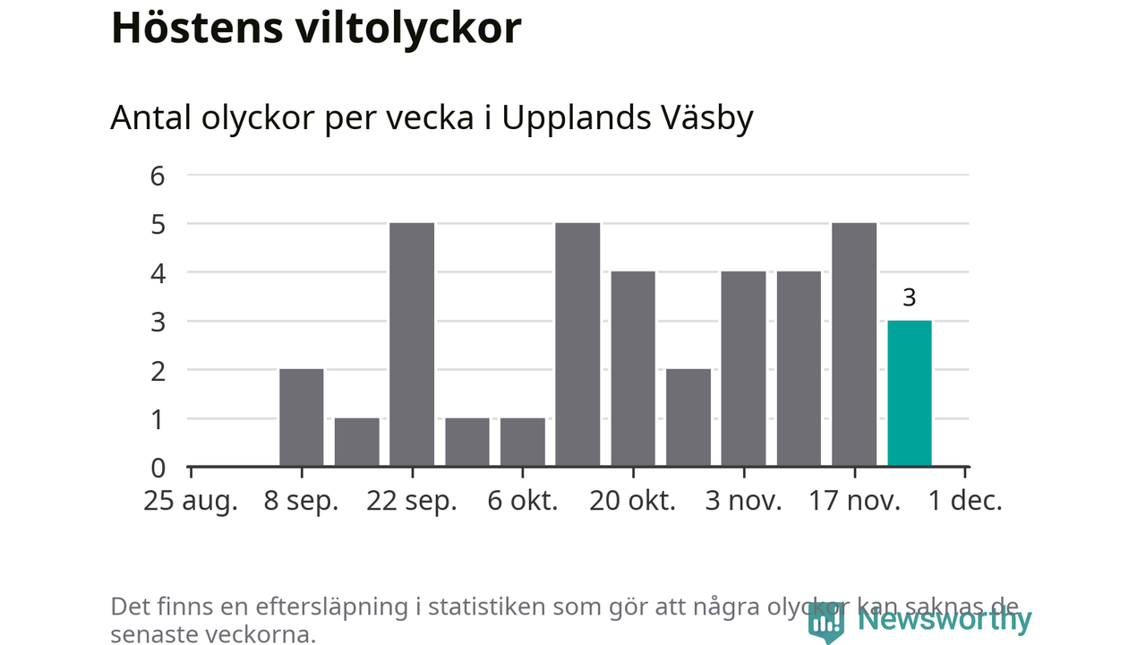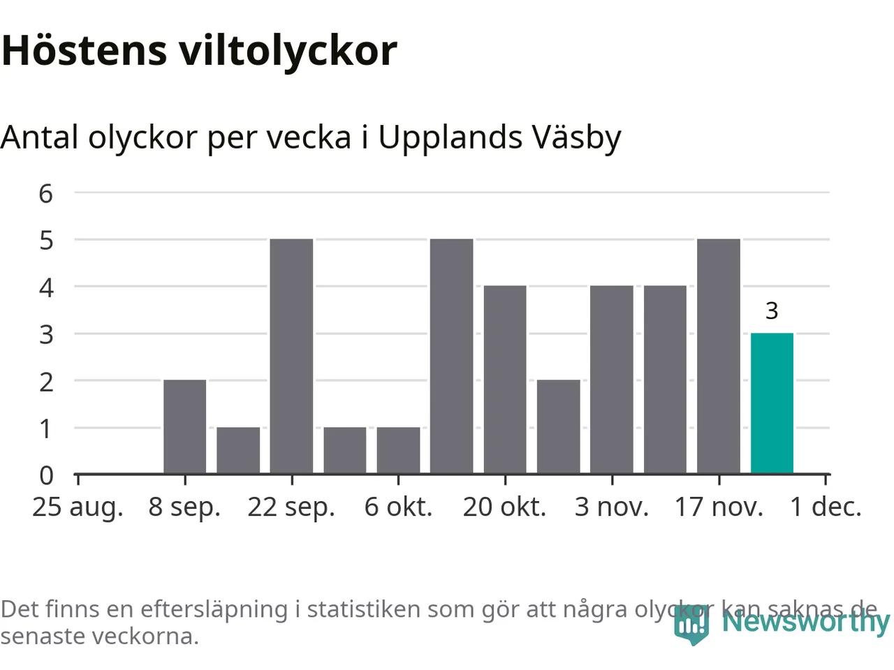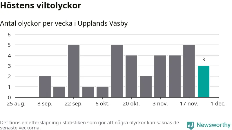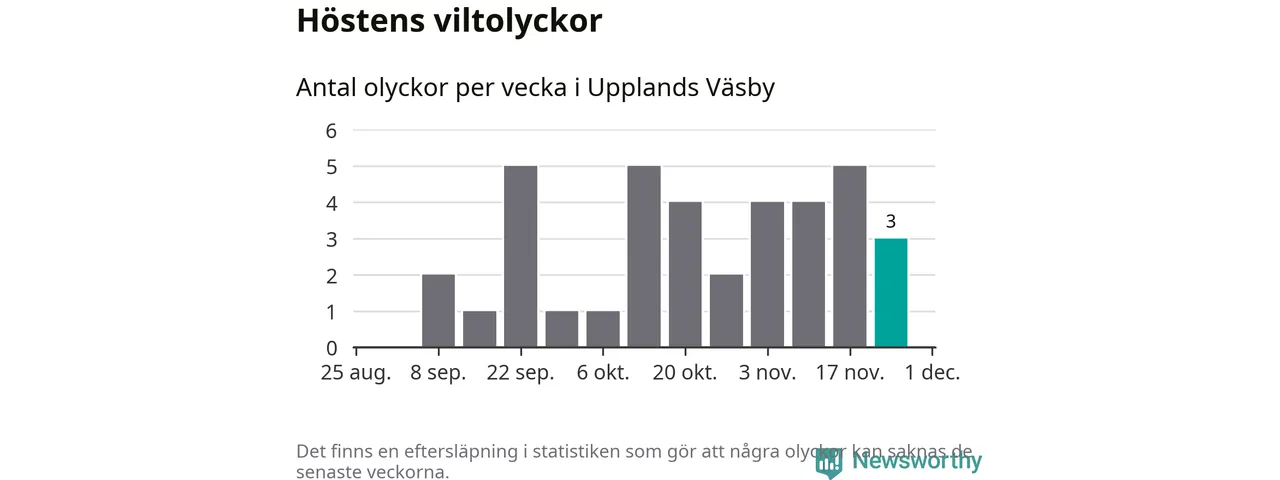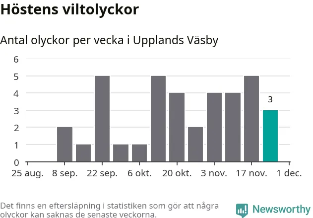 Hittills har tre viltolyckor rapporterats in i Upplands Väsby kommun från vecka 48. Se listan här.