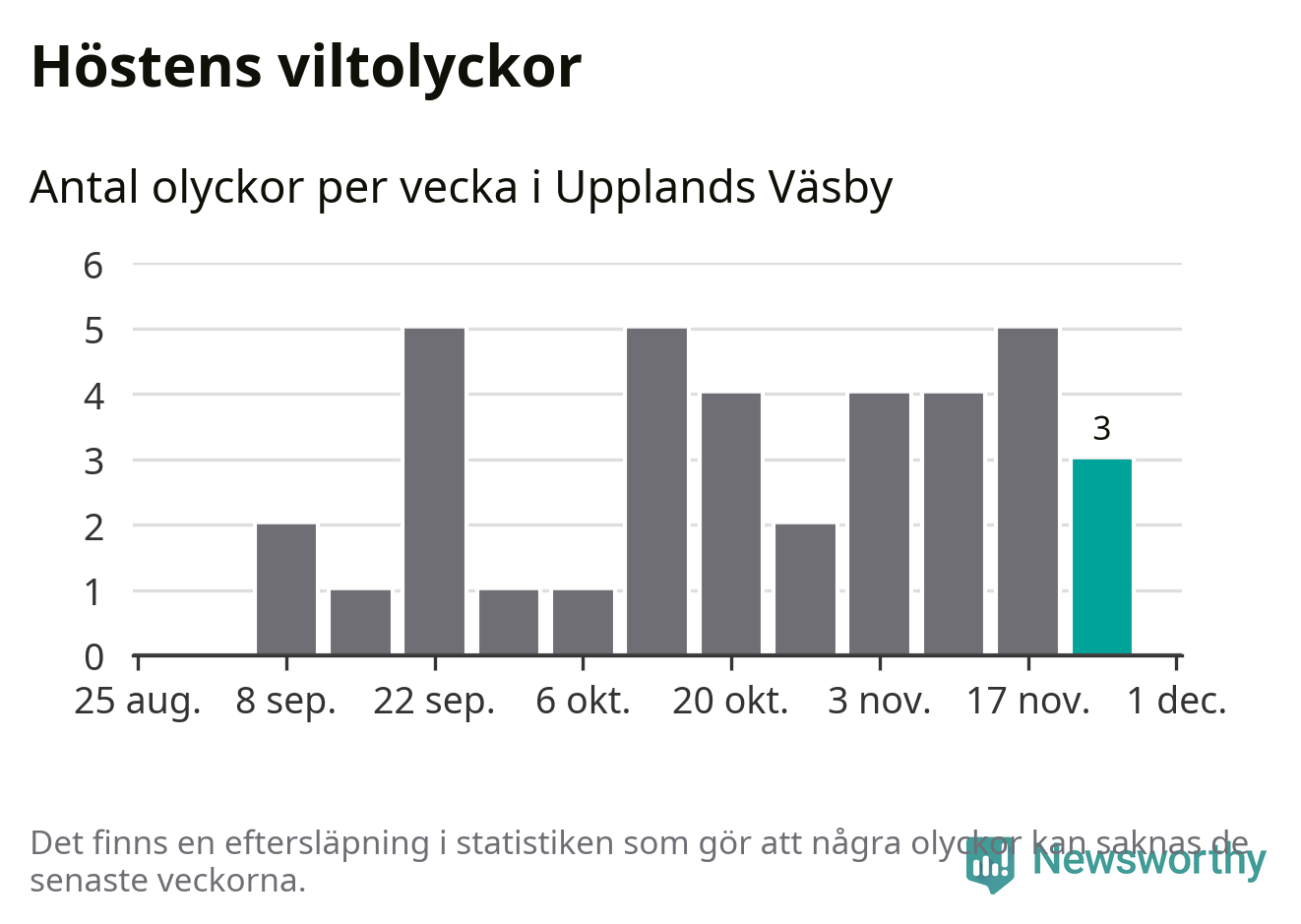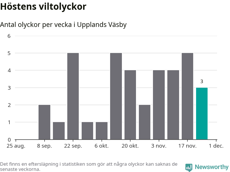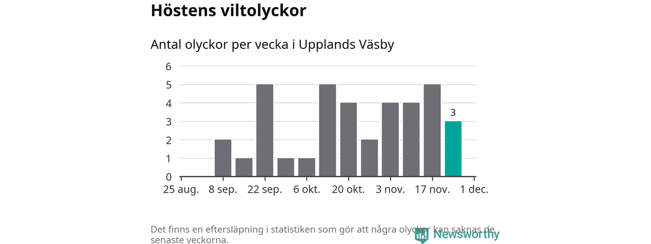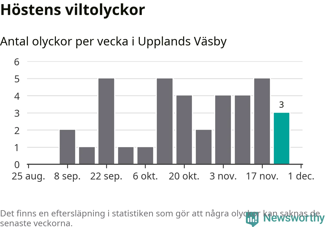 Hittills har tre viltolyckor rapporterats in i Upplands Väsby kommun från vecka 48. Se listan här.