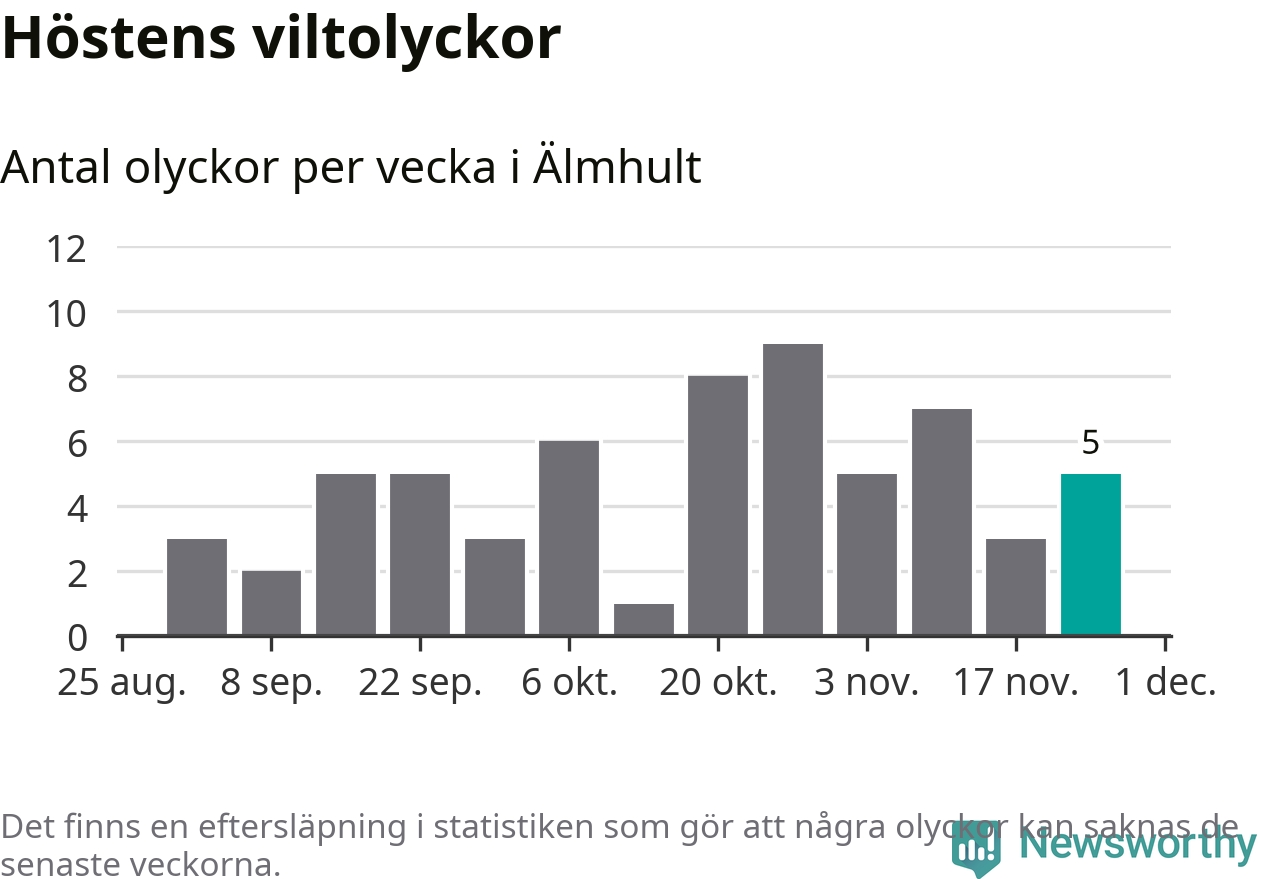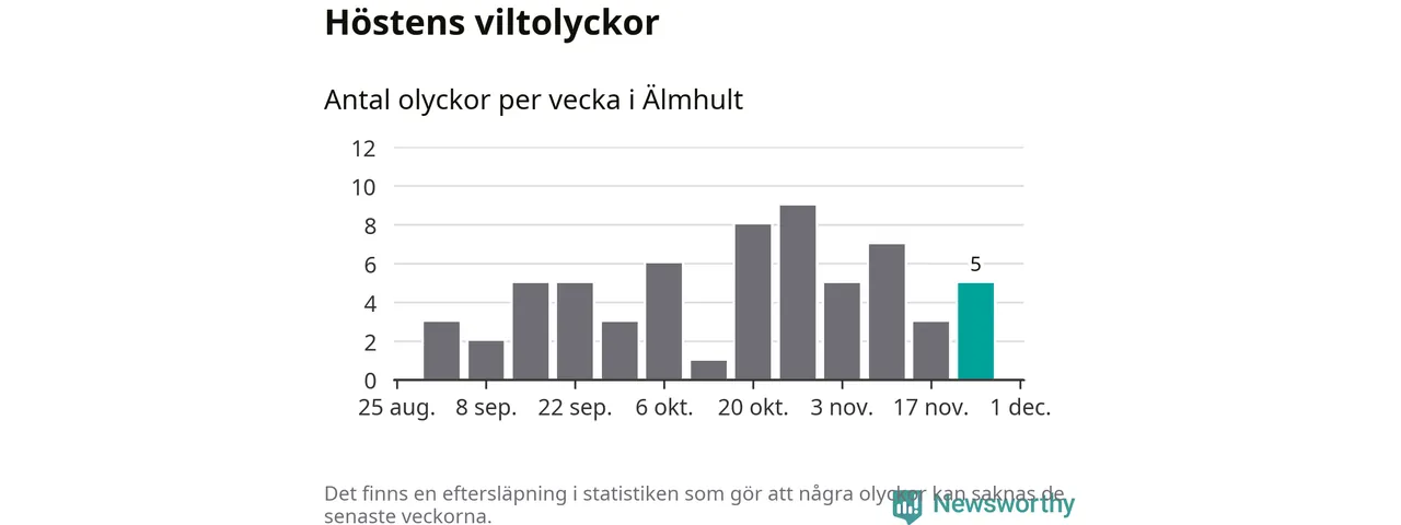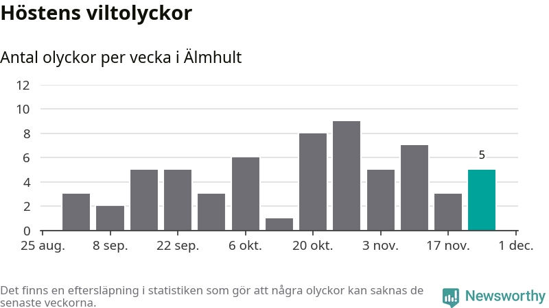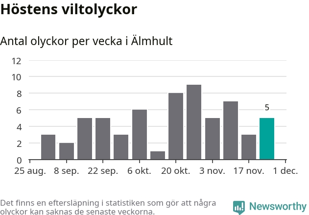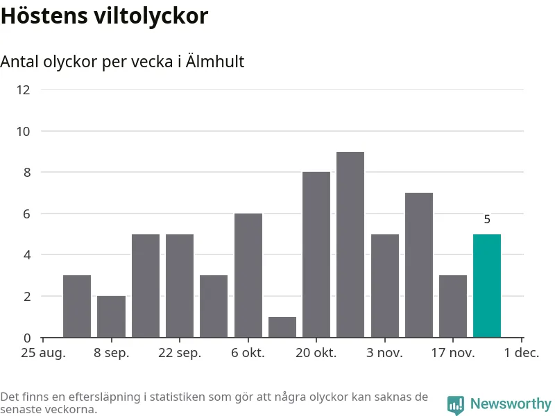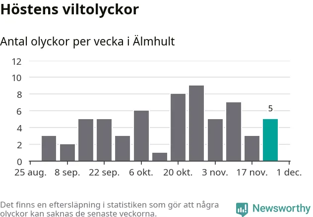 Hittills har fem viltolyckor rapporterats in i Älmhults kommun från vecka 48. Se listan här.