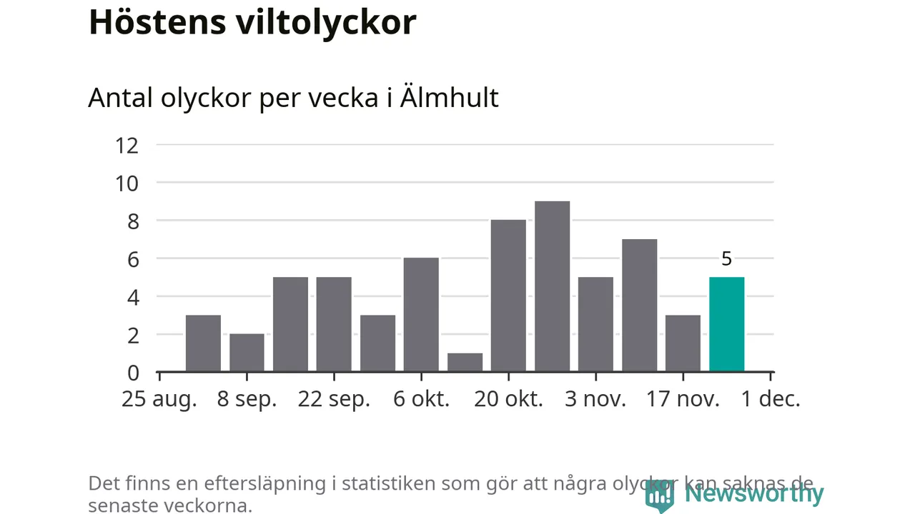 Totalt den här hösten har det inträffat 62 viltolyckor i kommunen. Det är mindre än genomsnittet för motsvarande period (omkring 80) de senaste tio åren.