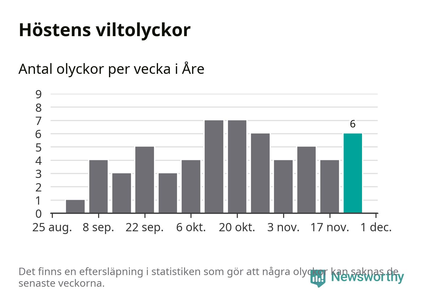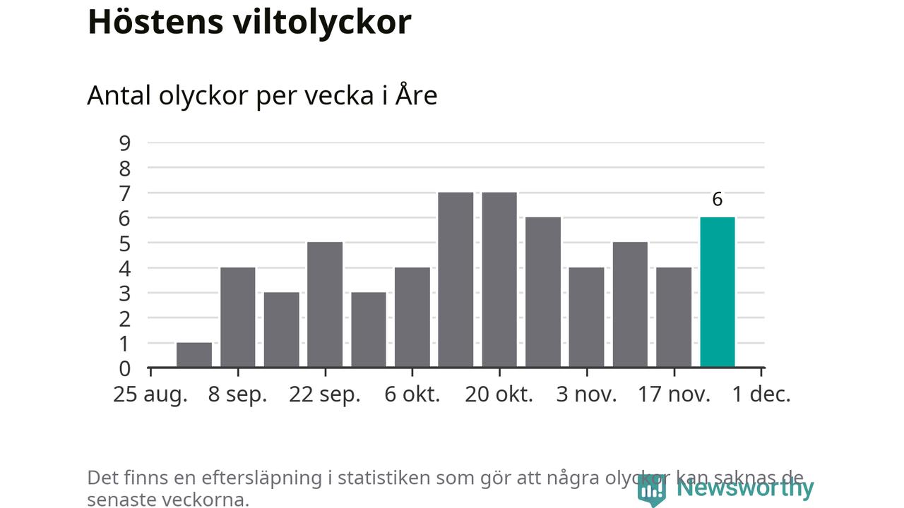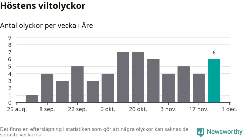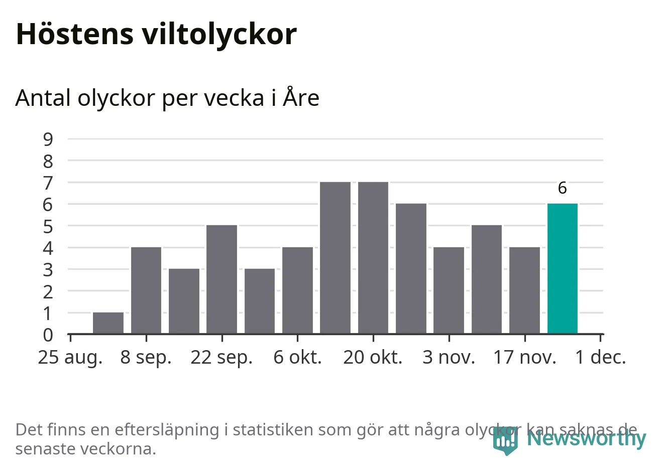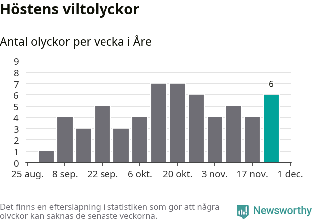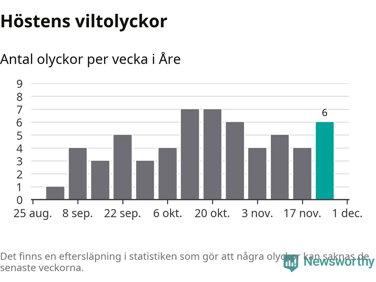 Hittills har sex viltolyckor rapporterats in i Åre kommun från vecka 48. Se listan här.