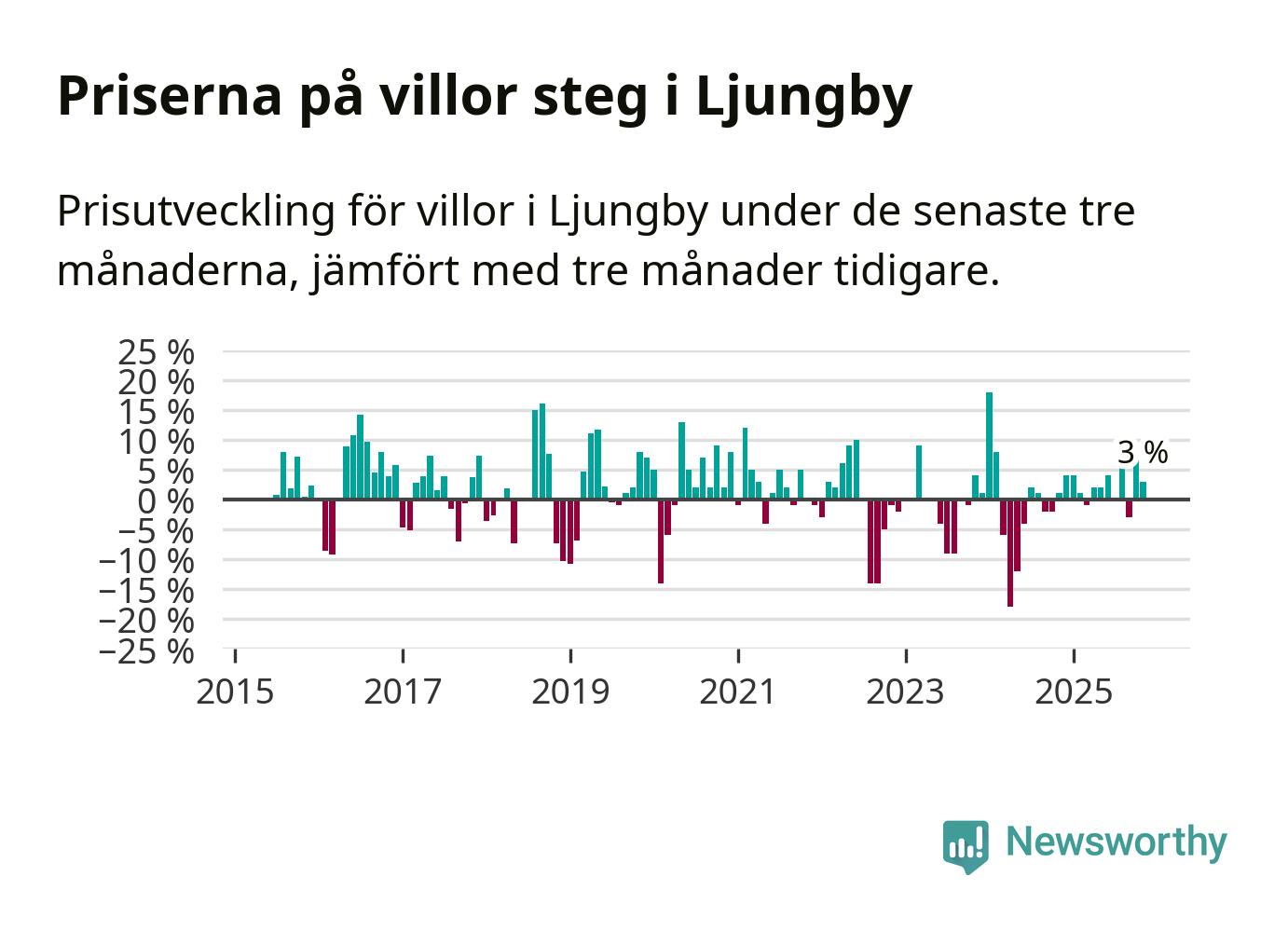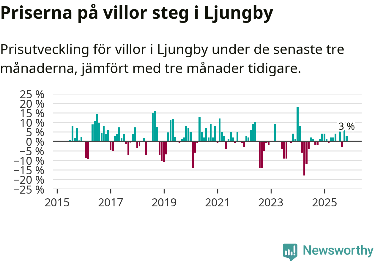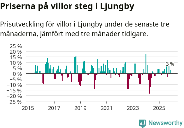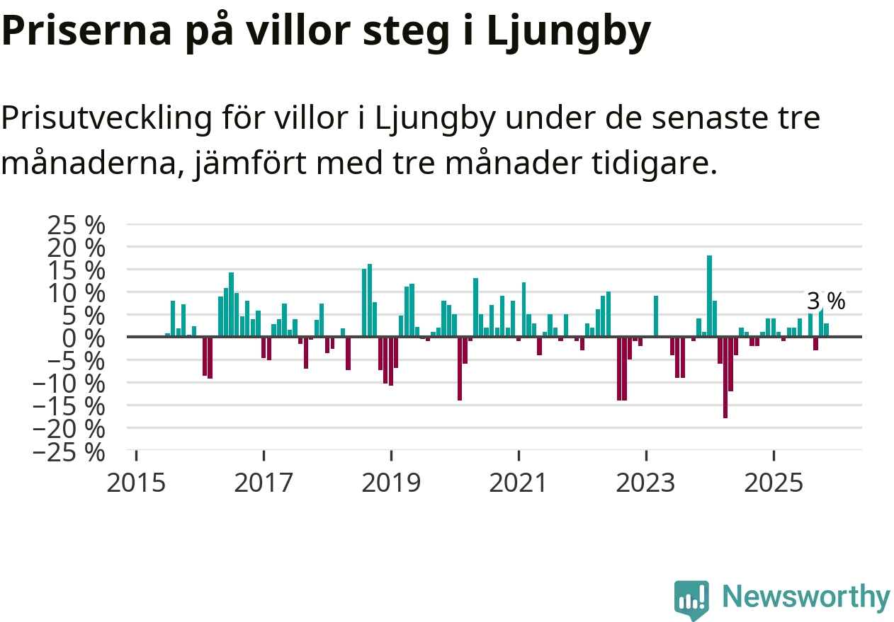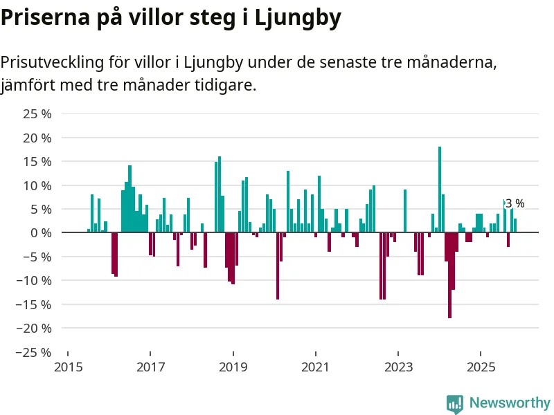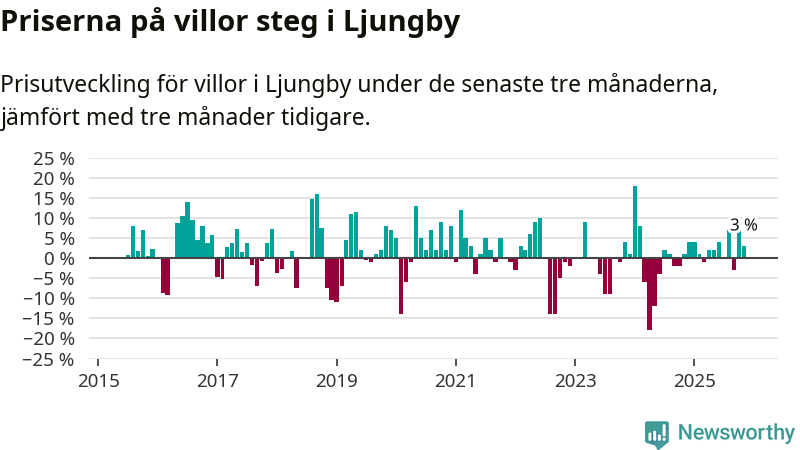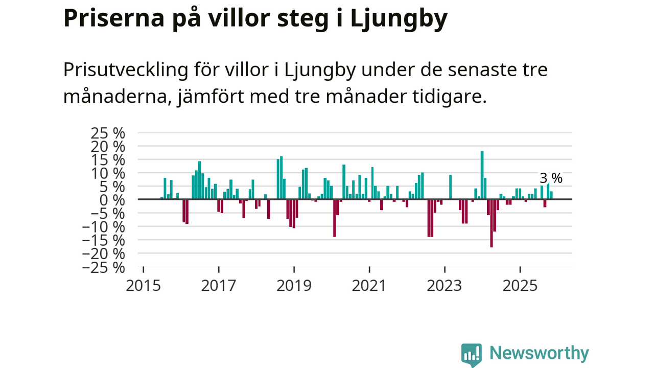 Villapriserna har gått upp i Ljungby kommun. Medelpriset på försäljningarna under de senaste tre månaderna visar på en uppgång med 3 procent.