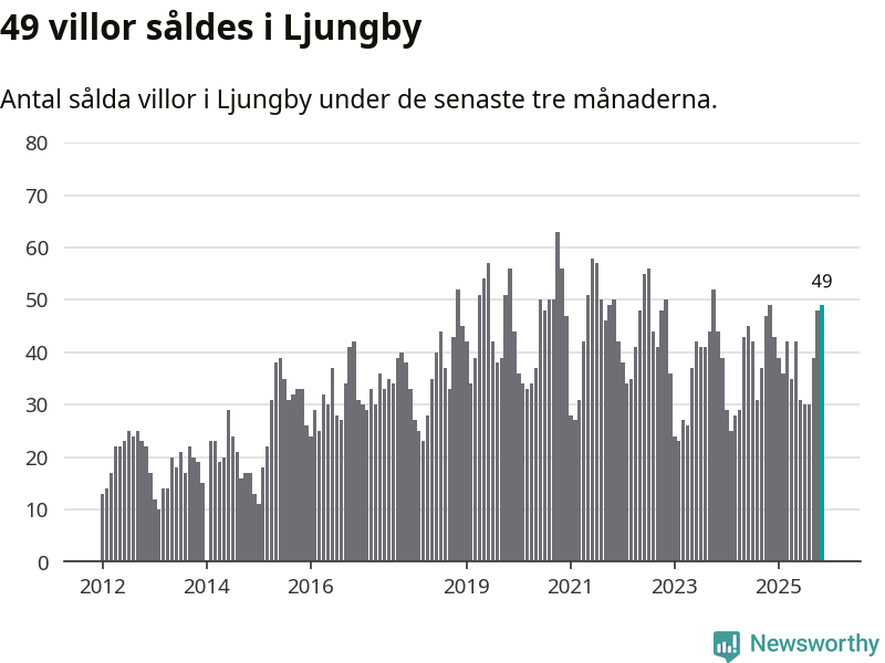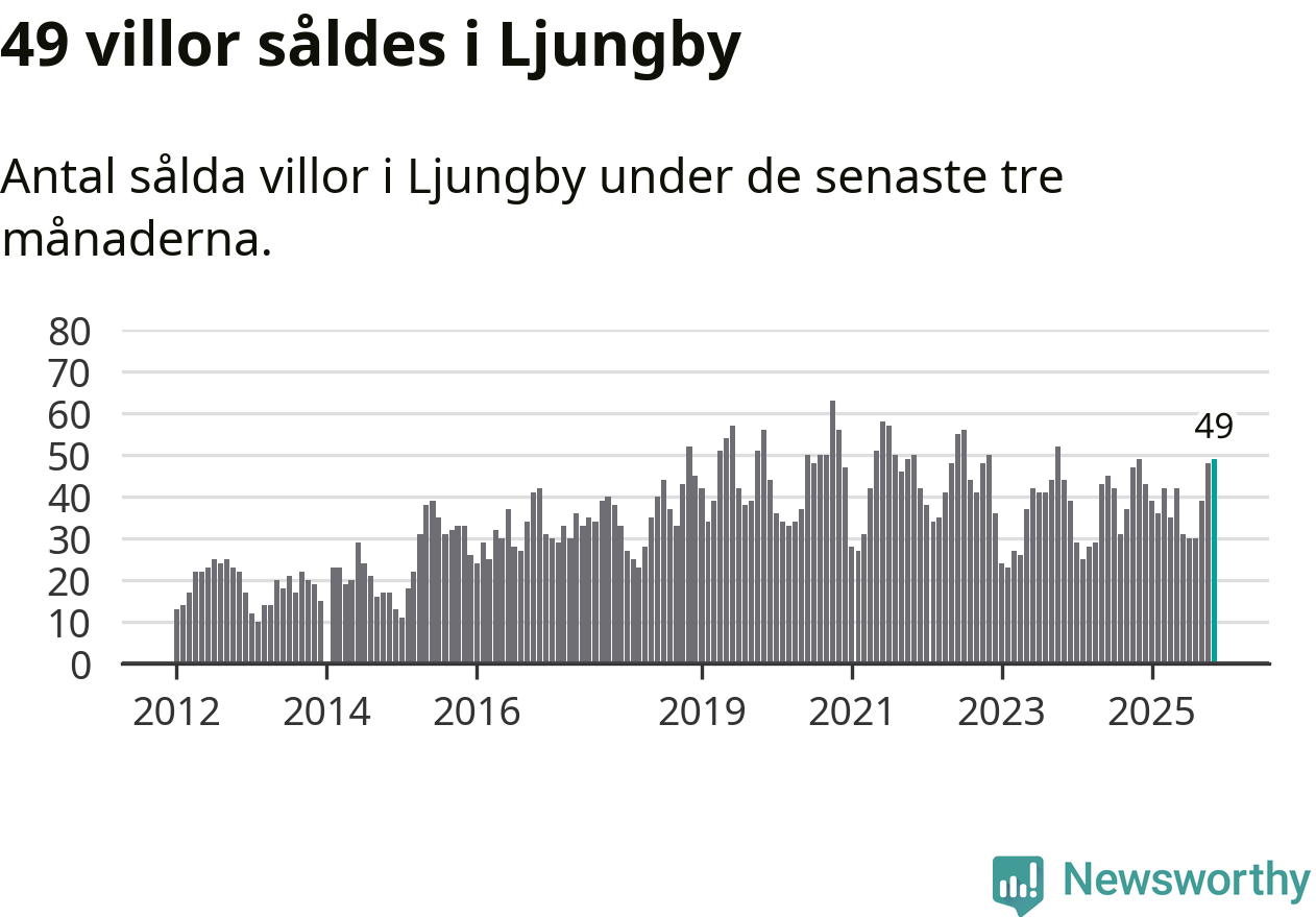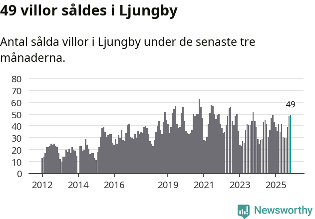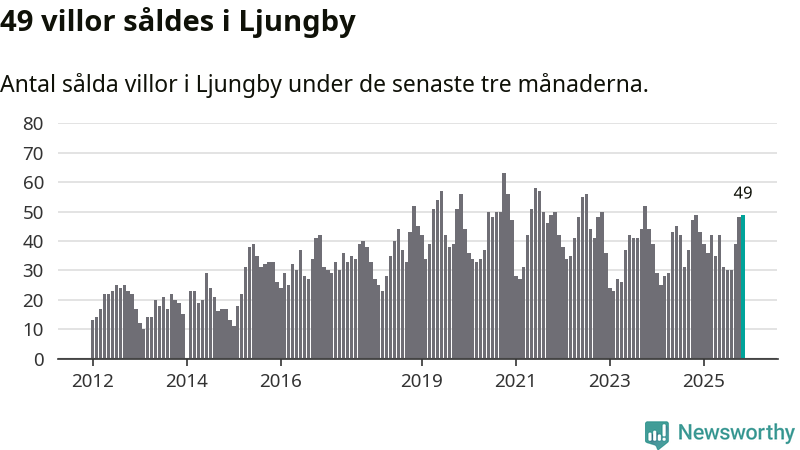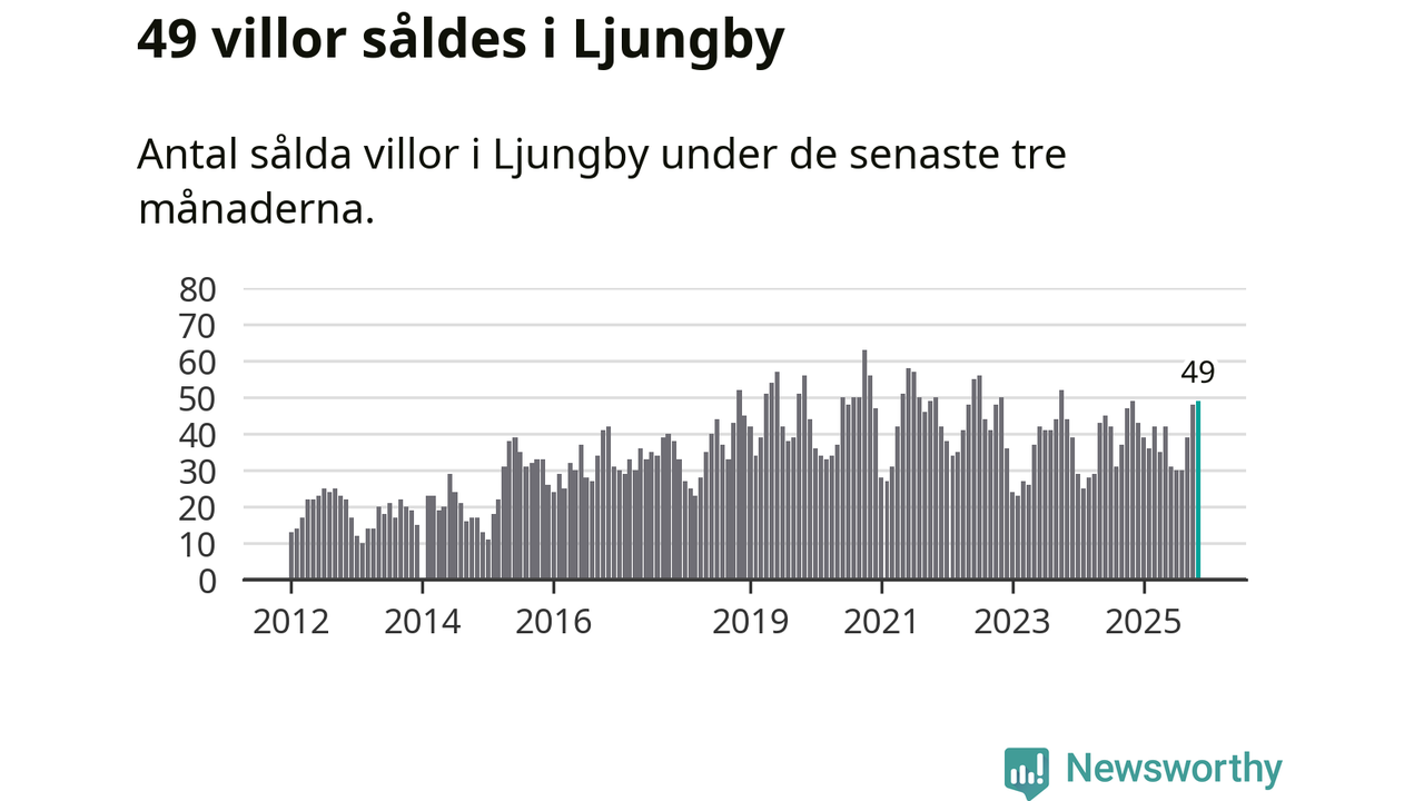 Sammanlagt såldes 49 villor i Ljungby kommun mellan september och november till ett genomsnittligt pris på 2,3 miljoner kronor. I fjol gjordes 49 affärer vid den här tiden på året.