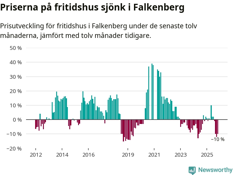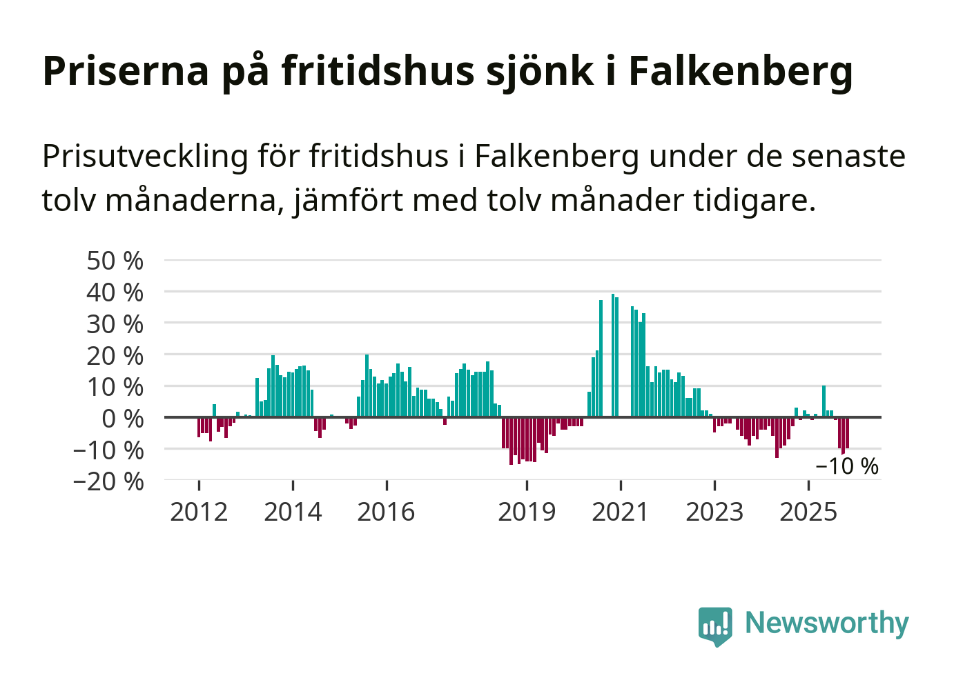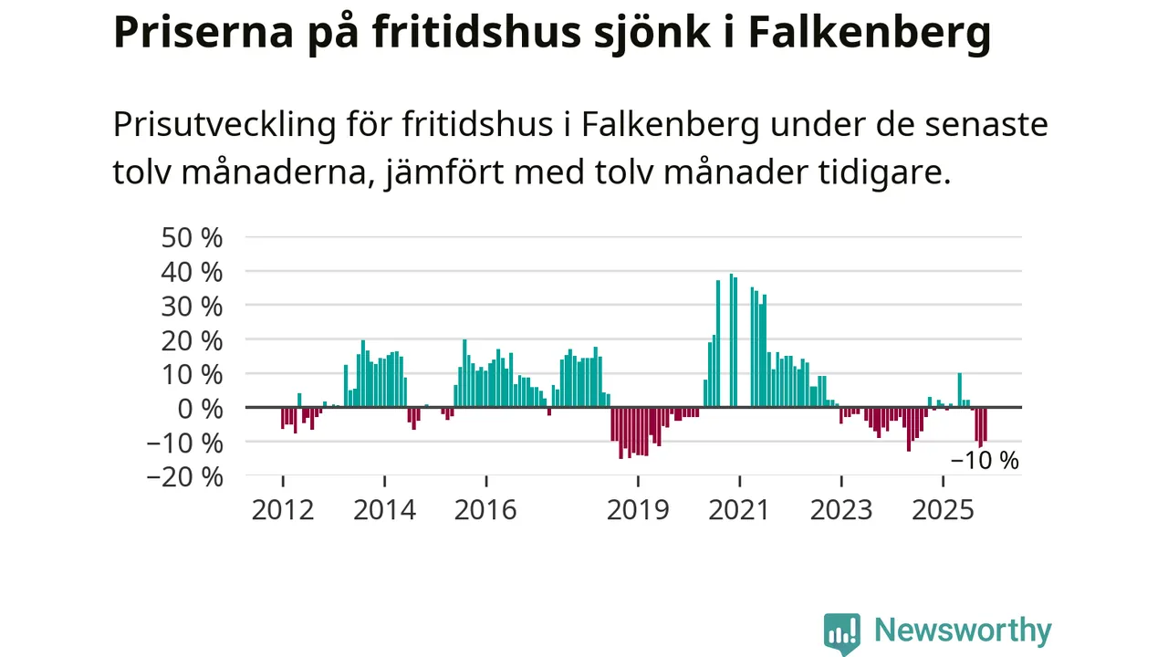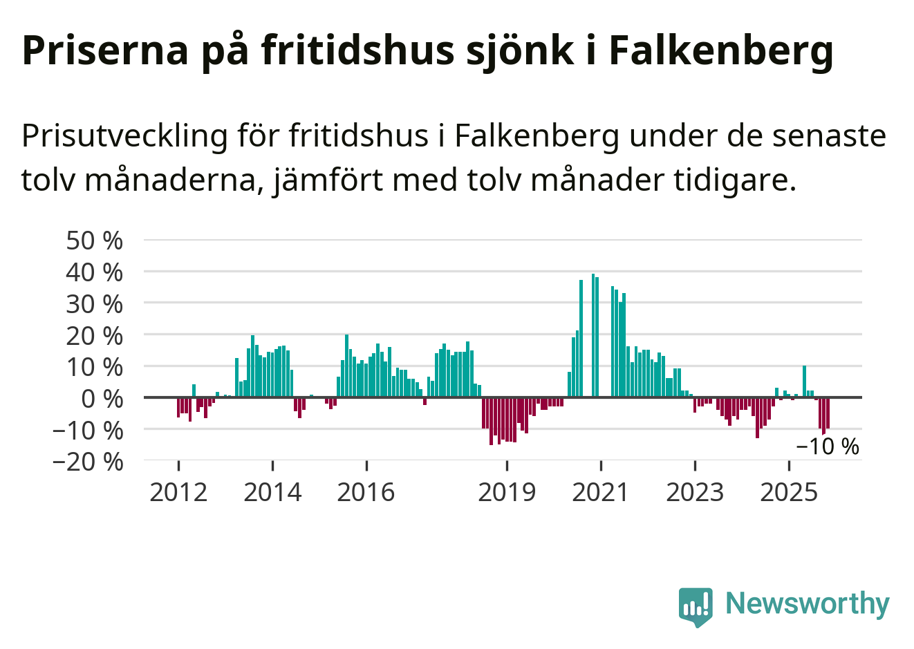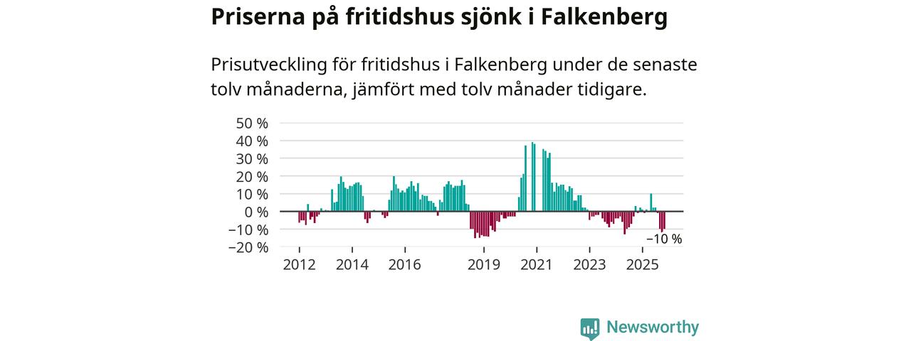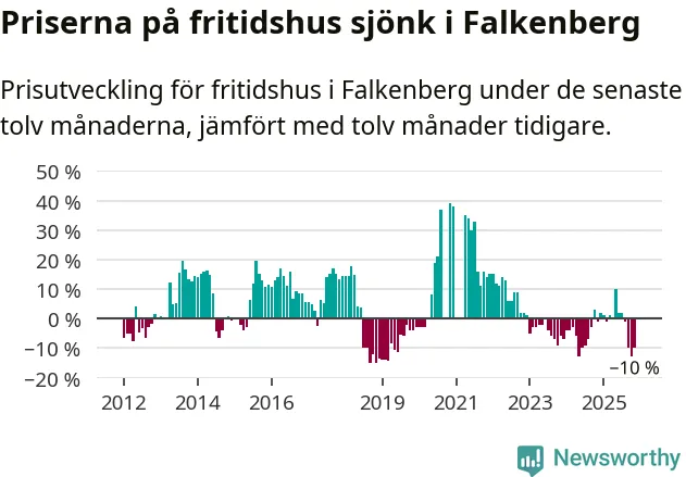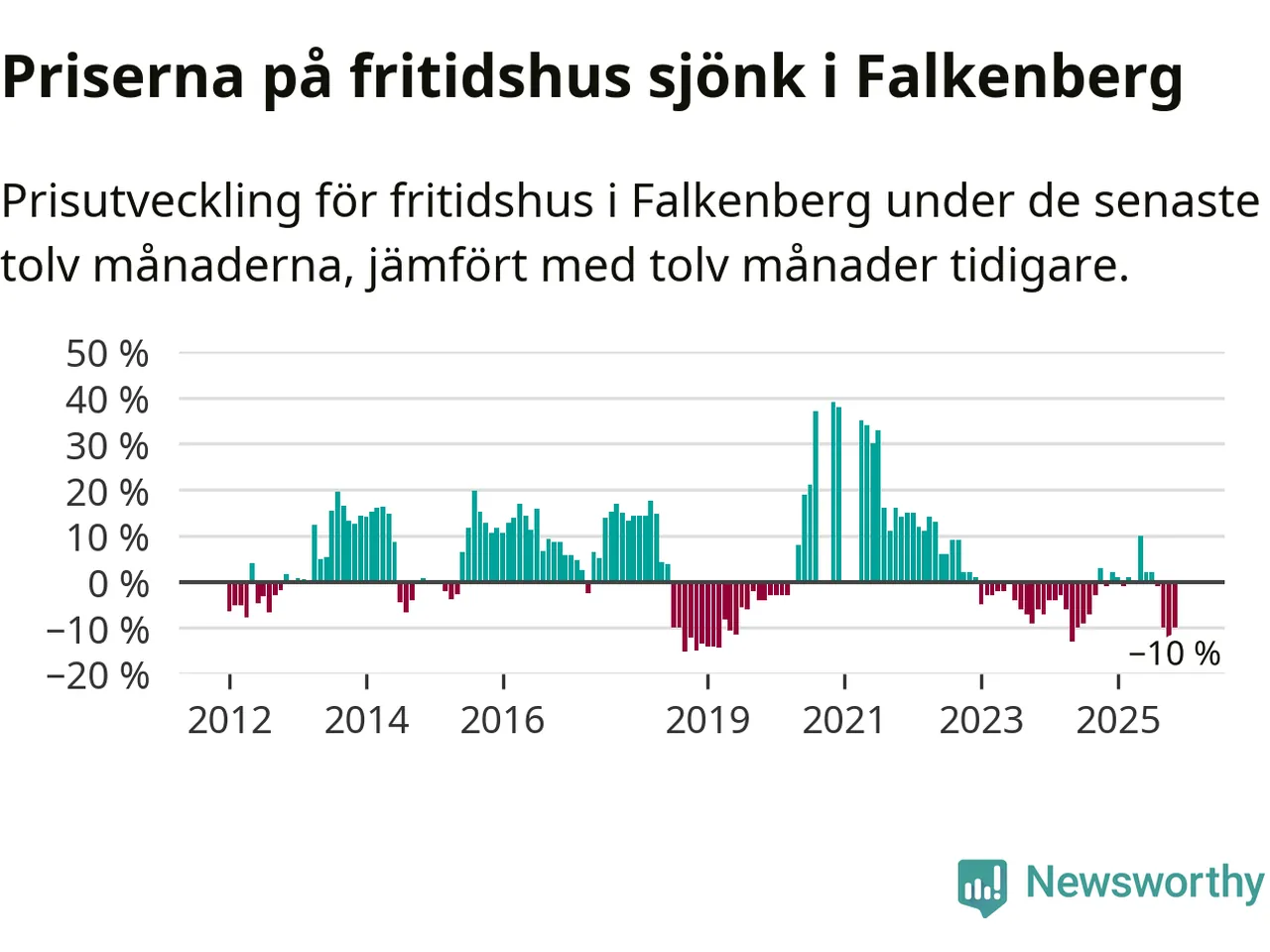 Priserna på fritidshus har gått ner i Falkenbergs kommun. Medelpriset på försäljningarna under de senaste tolv månaderna visar på en nedgång med 10 procent.
