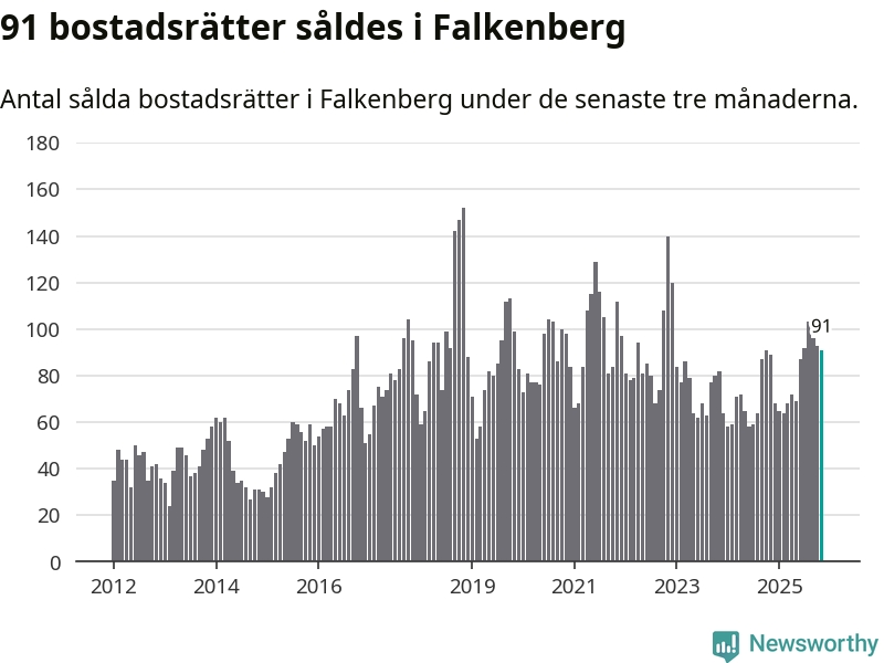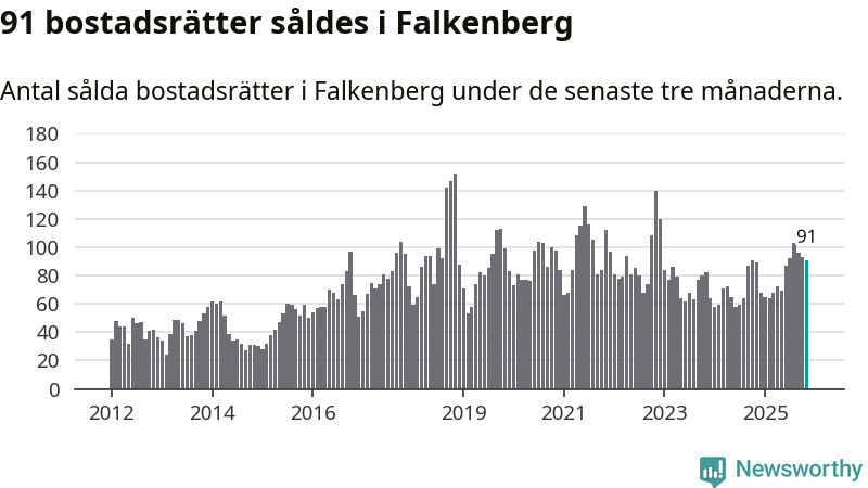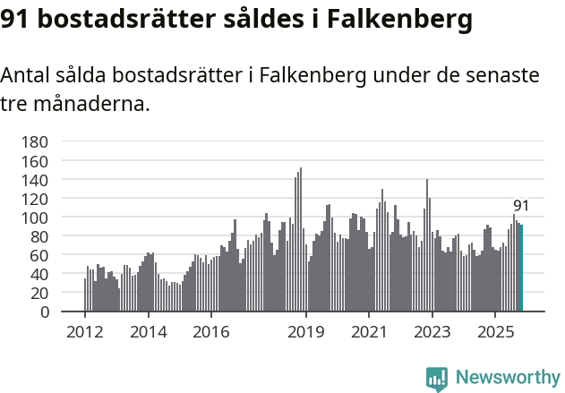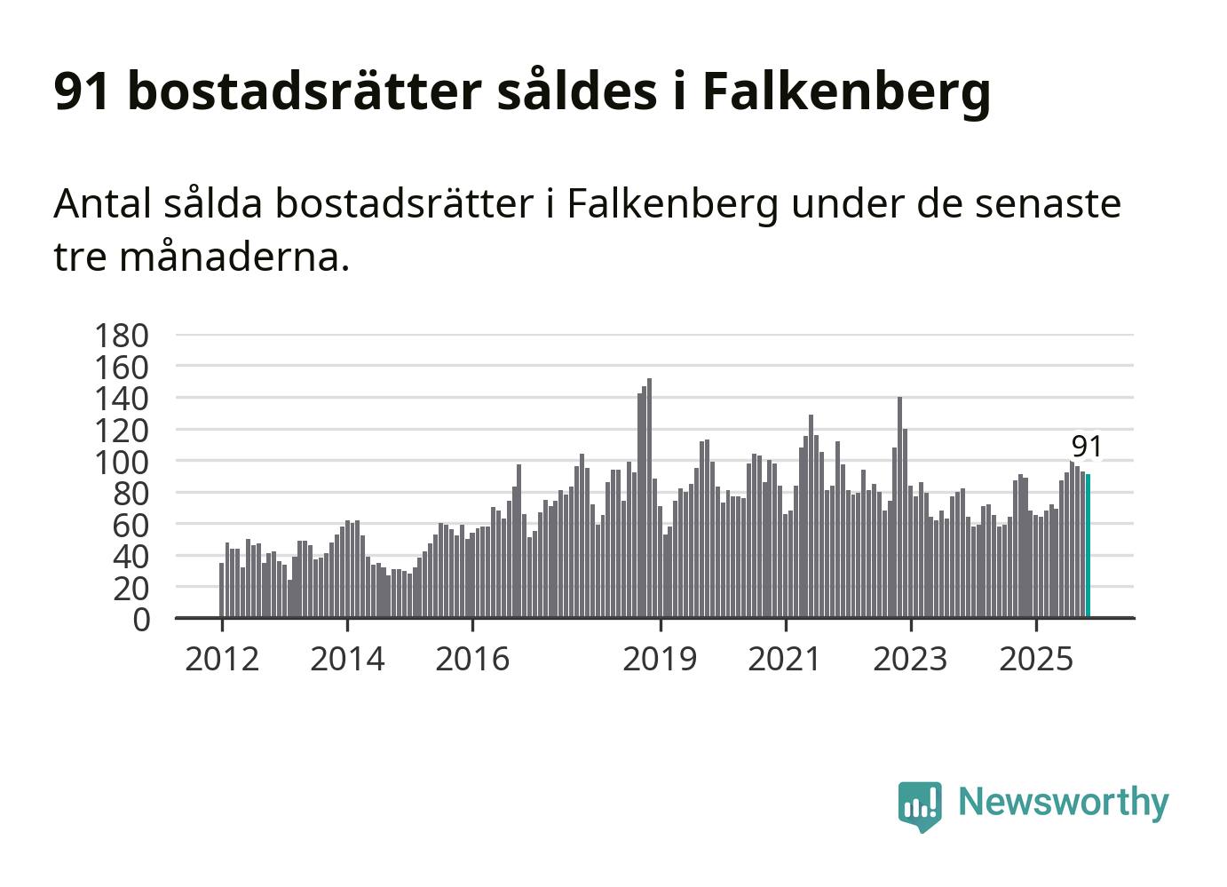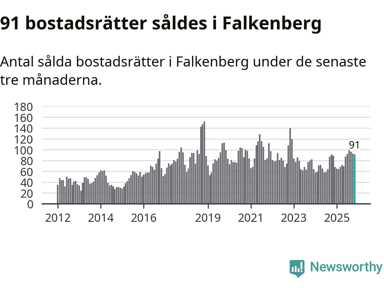 Sammanlagt såldes 91 bostadsrätter i Falkenbergs kommun mellan september och november till ett genomsnittligt pris på 1,9 miljoner kronor. I fjol gjordes 89 affärer vid den här tiden på året.