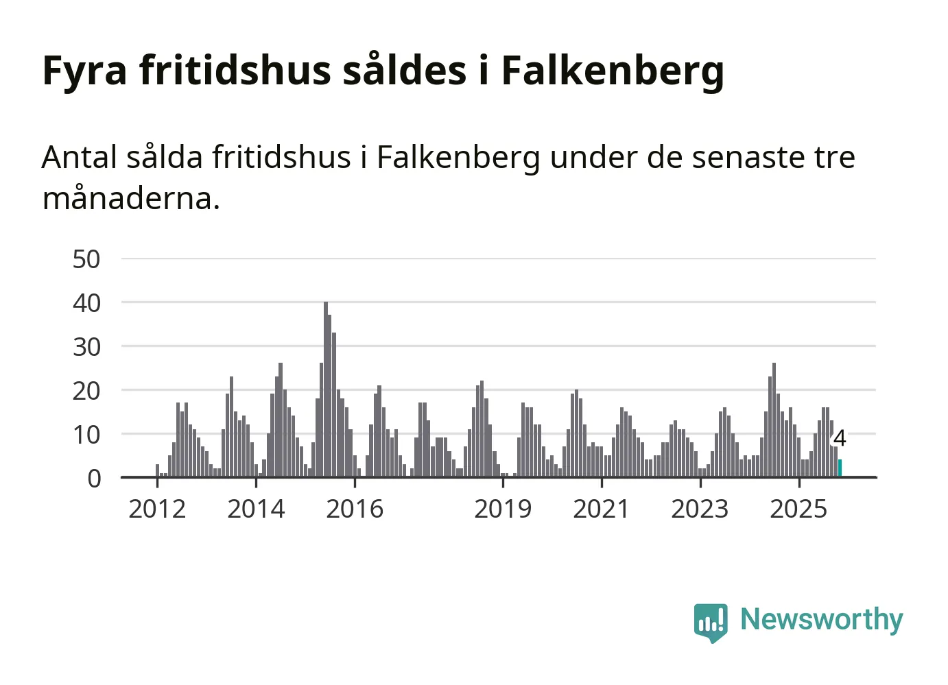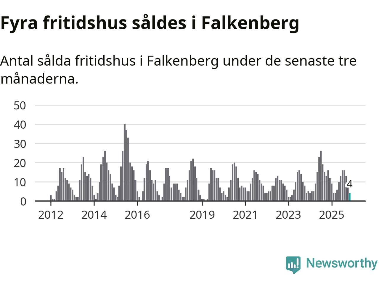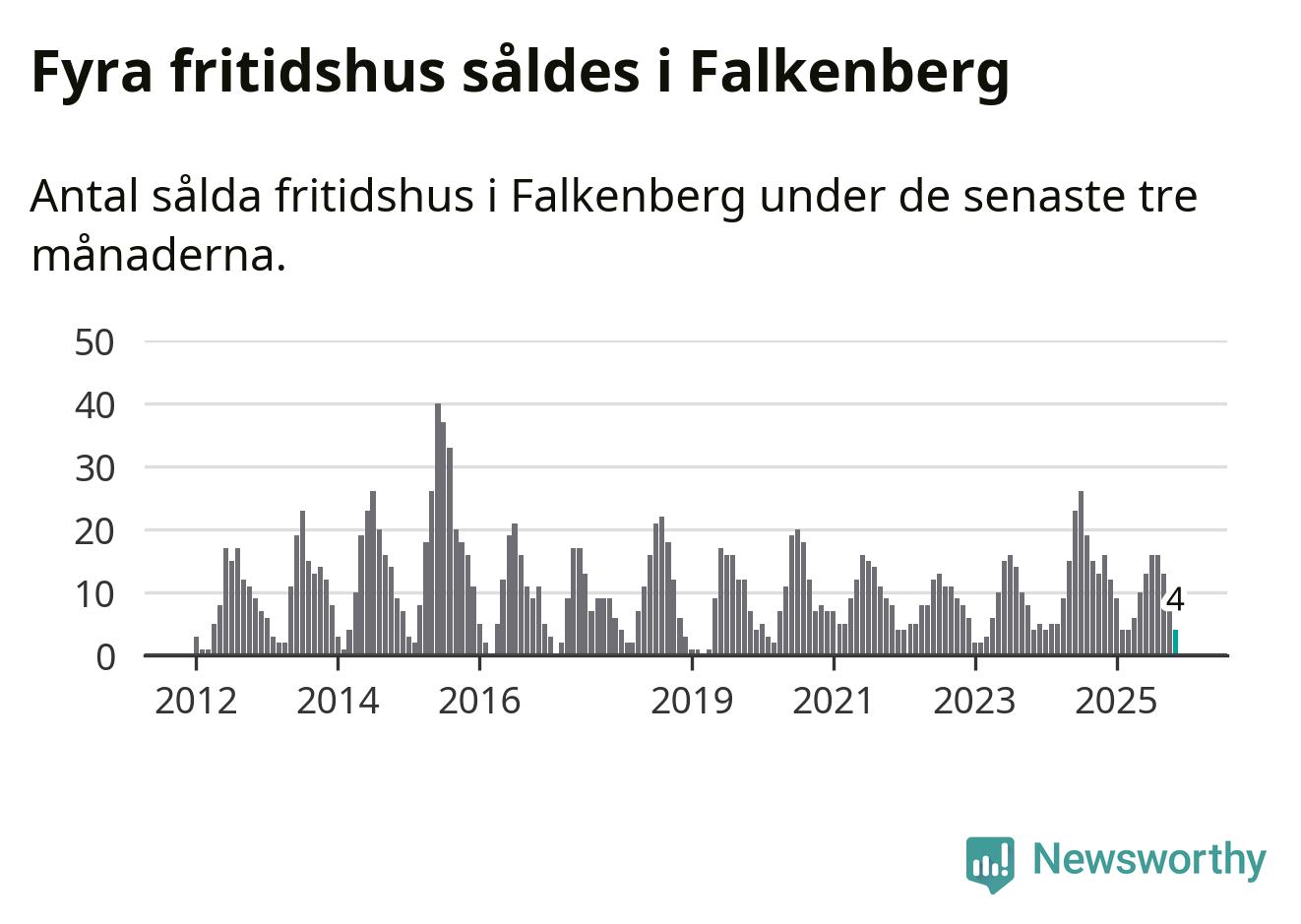 Sammanlagt såldes fyra fritidshus i Falkenbergs kommun mellan september och november till ett genomsnittligt pris på 3,4 miljoner kronor. I fjol gjordes 16 affärer vid den här tiden på året.