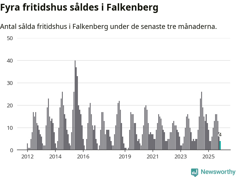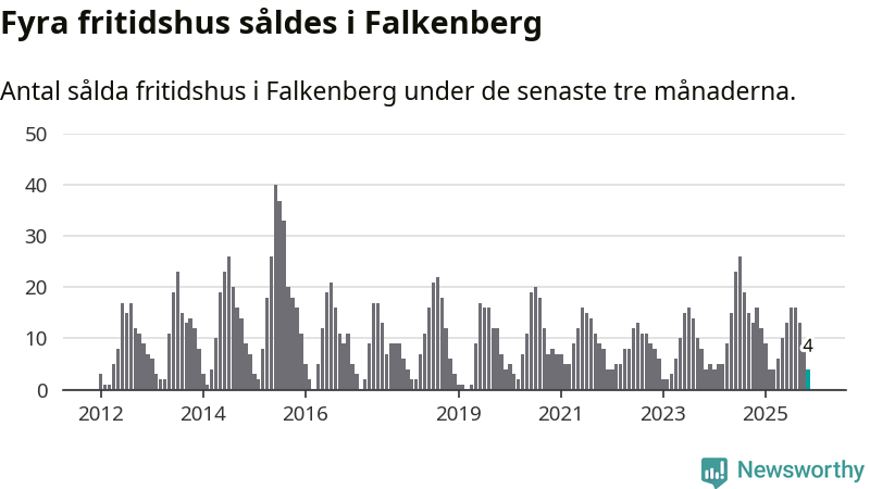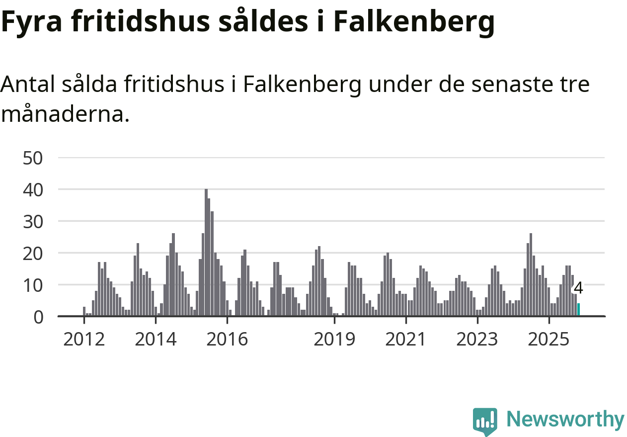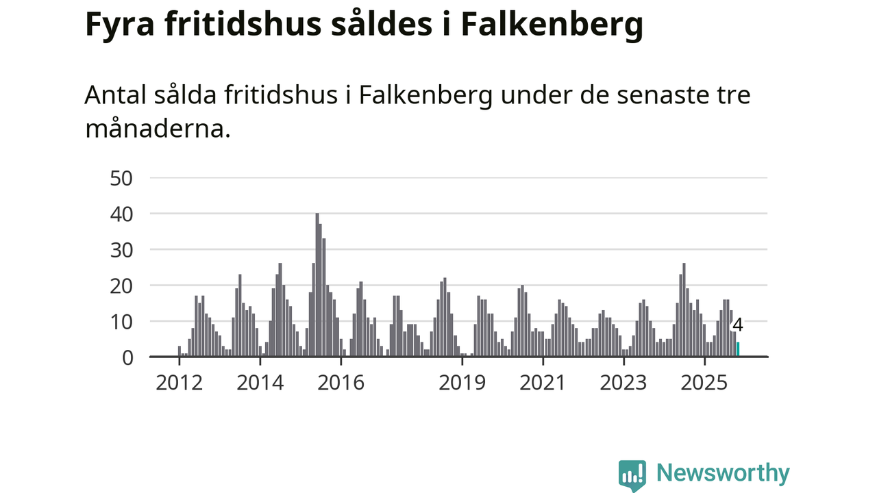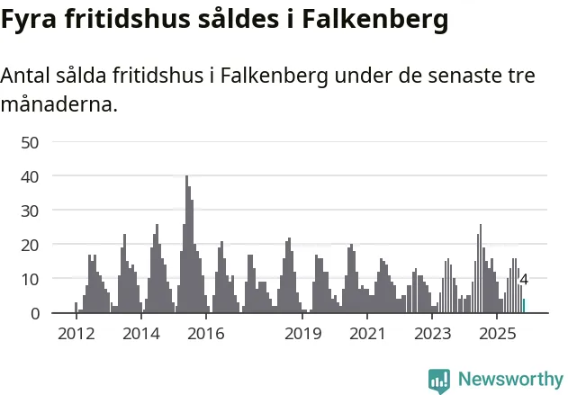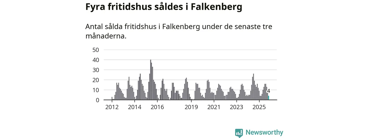 Sammanlagt såldes fyra fritidshus i Falkenbergs kommun mellan september och november till ett genomsnittligt pris på 3,4 miljoner kronor. I fjol gjordes 16 affärer vid den här tiden på året.