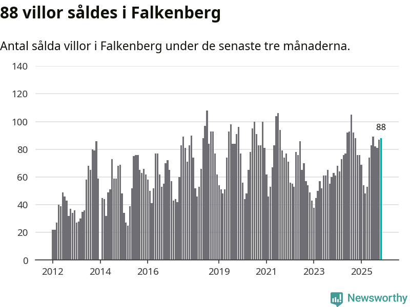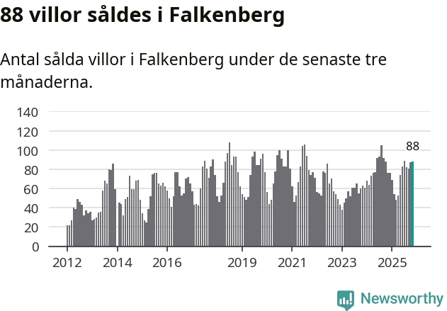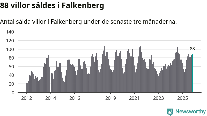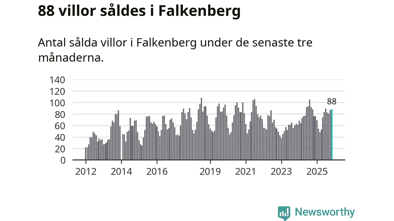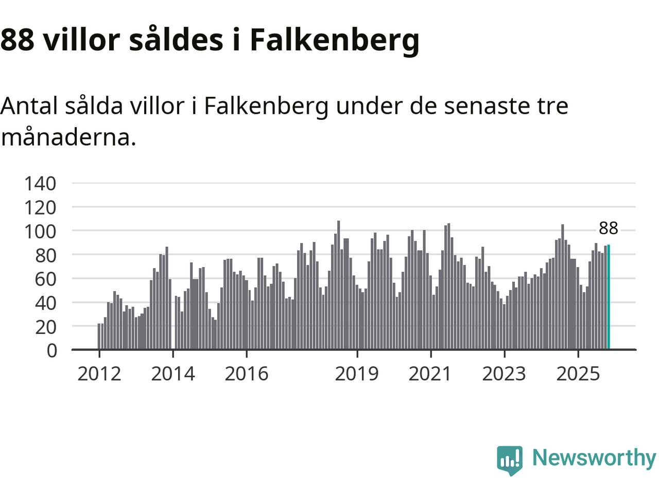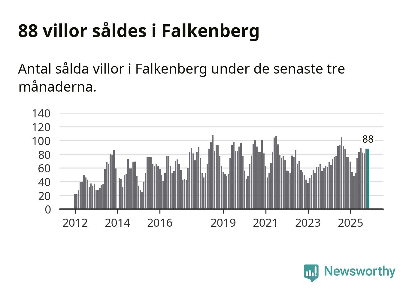 Sammanlagt såldes 88 villor i Falkenbergs kommun mellan september och november till ett genomsnittligt pris på 3,6 miljoner kronor. I fjol gjordes 76 affärer vid den här tiden på året.