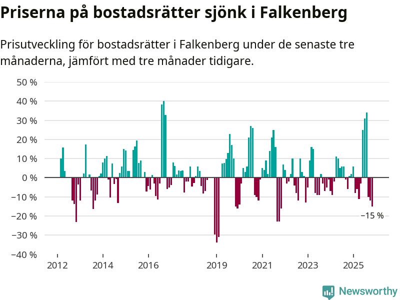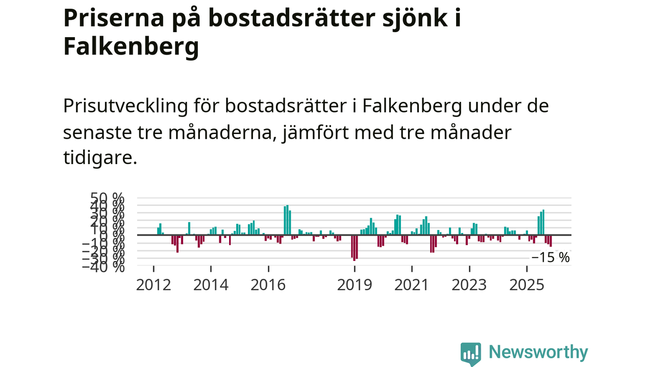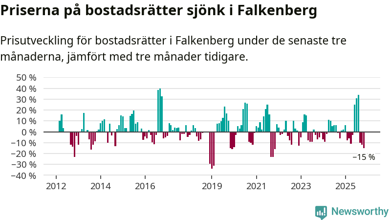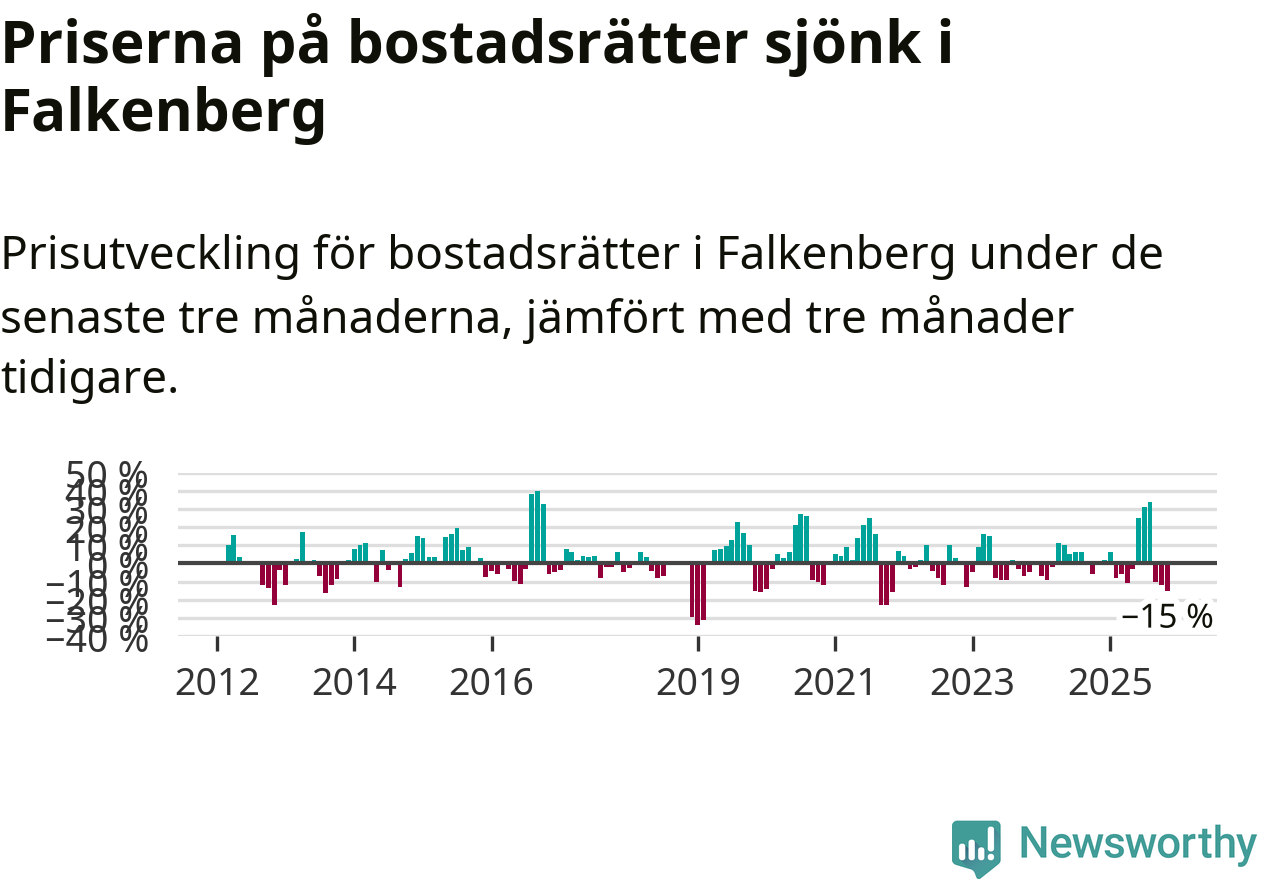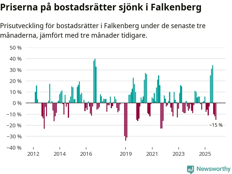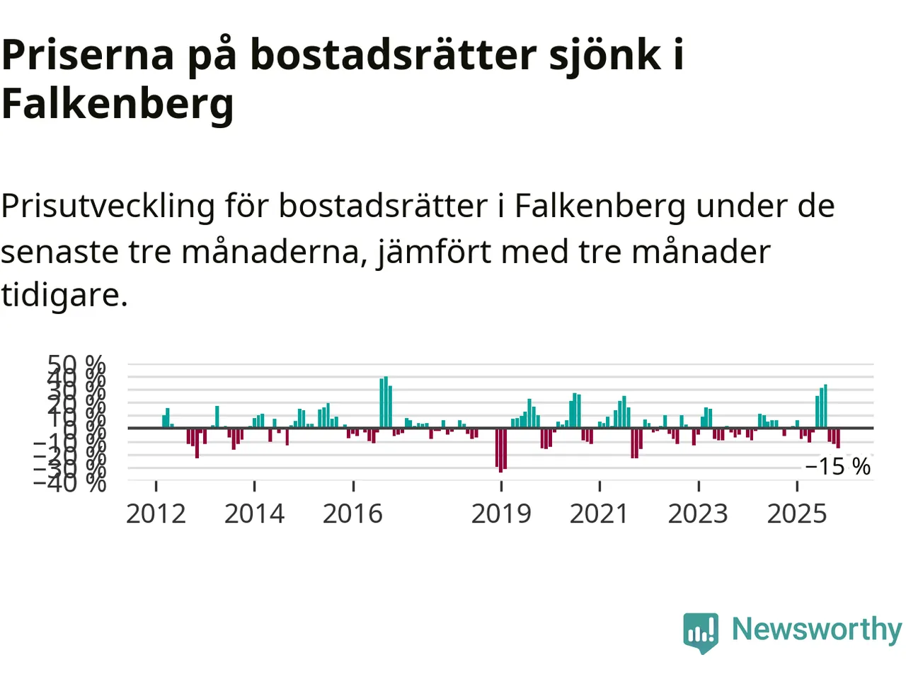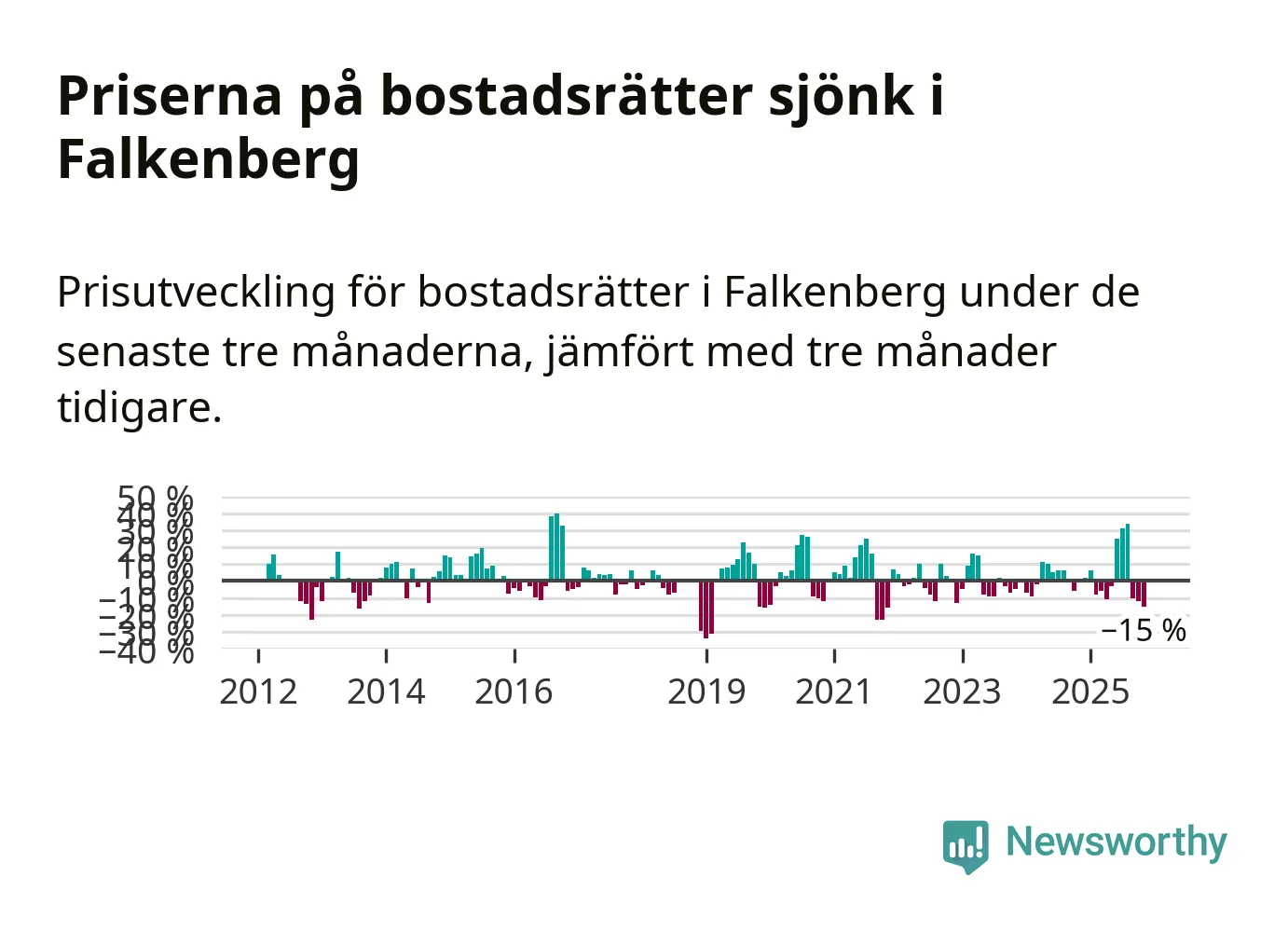 Priserna på bostadsrätter sjönk med 15 procent i Falkenbergs kommun under de senaste tre månaderna. Det är den svagaste prisutvecklingen sedan 2021.