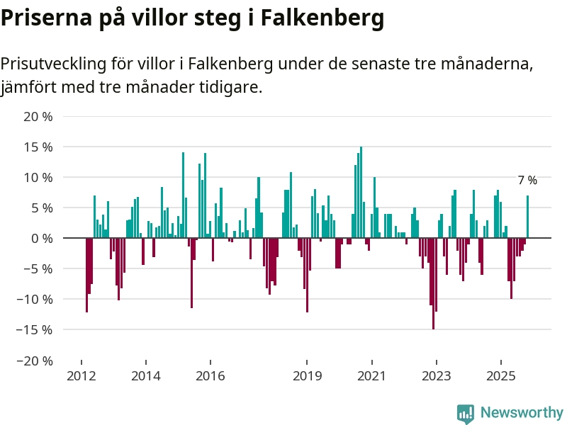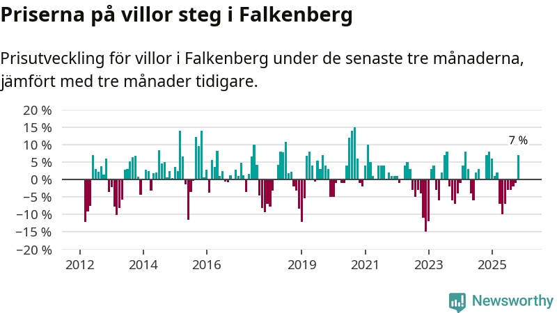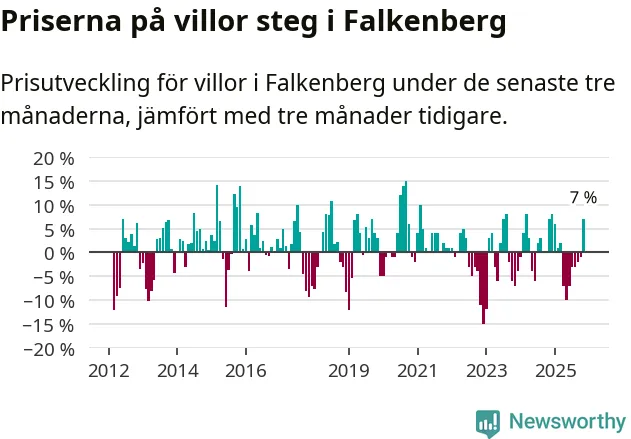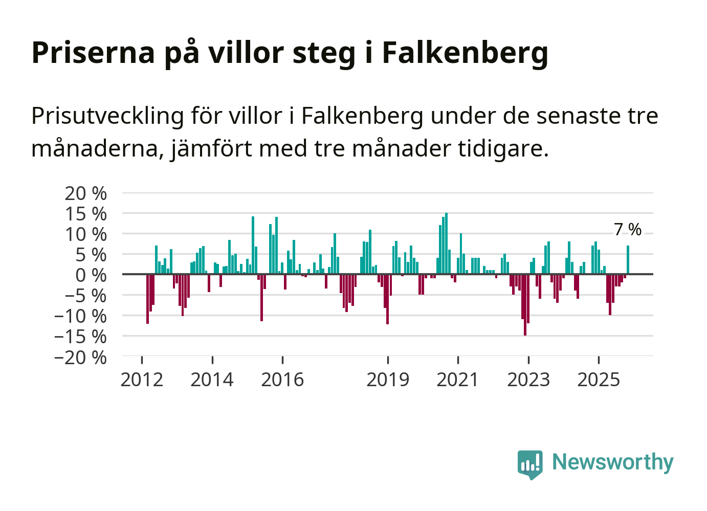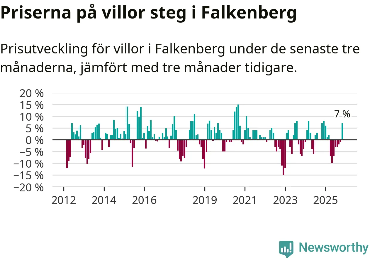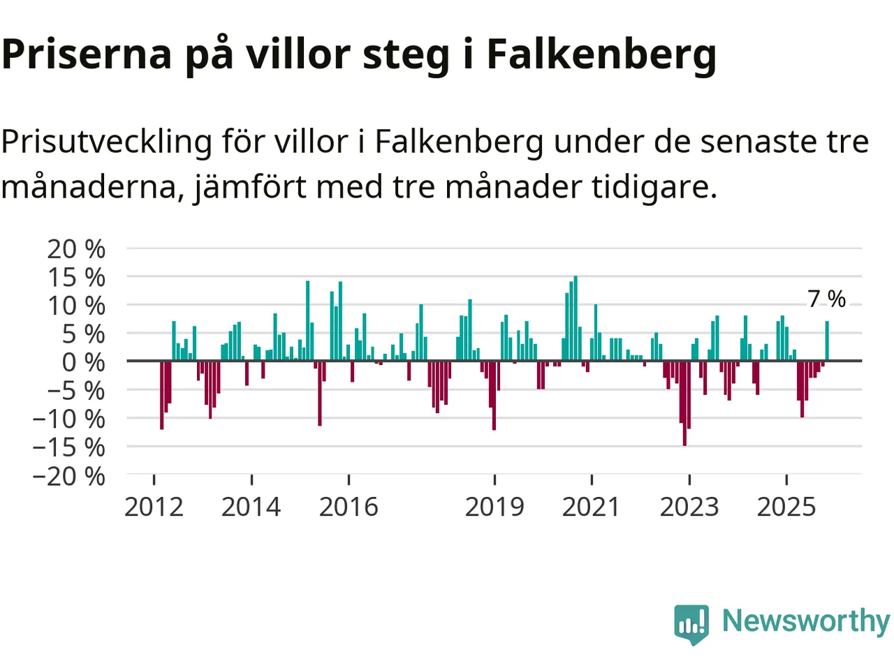 Villapriserna har gått upp i Falkenbergs kommun. Medelpriset på försäljningarna under de senaste tre månaderna visar på en uppgång med 7 procent.