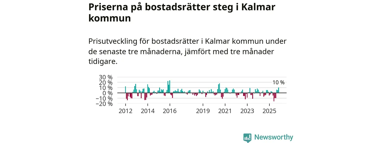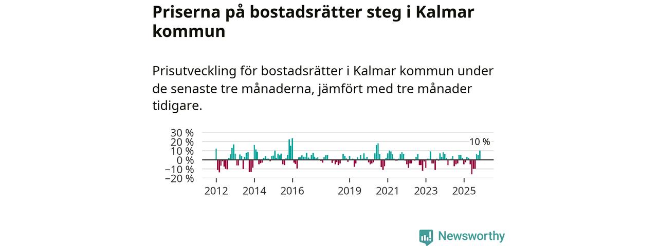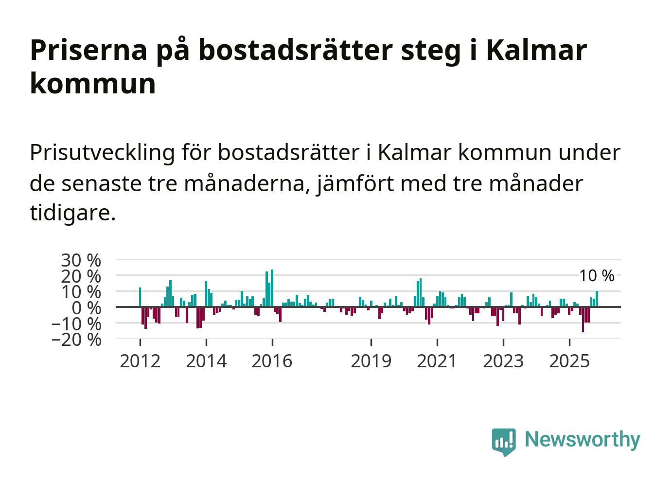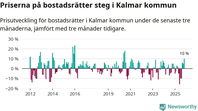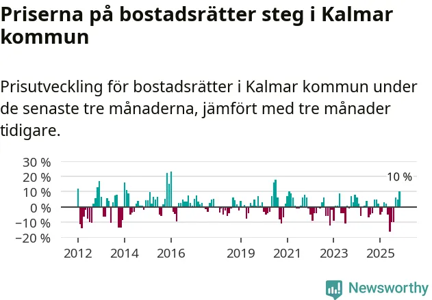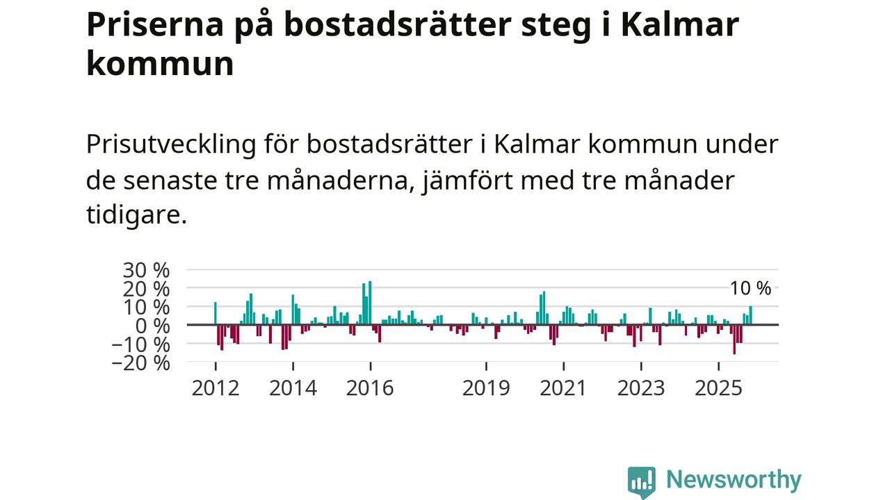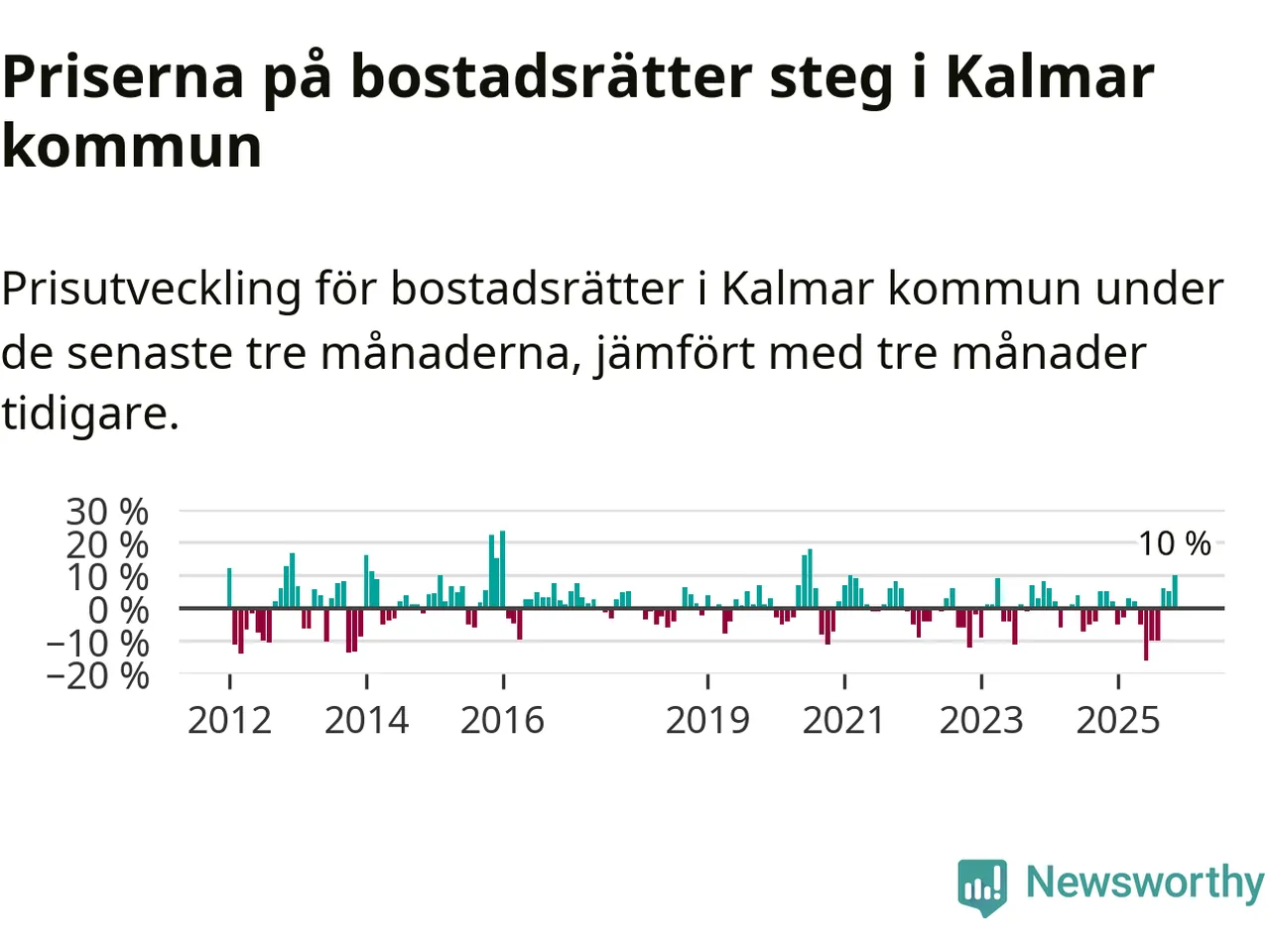Priserna på bostadsrätter steg med tio procent i Kalmar kommun under de senaste tre månaderna. Det är den starkaste prisutvecklingen sedan 2021.