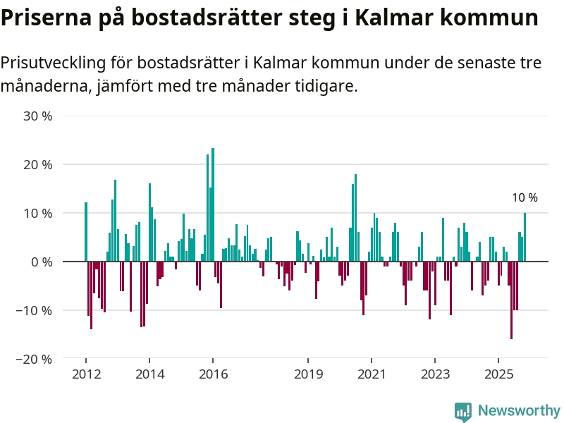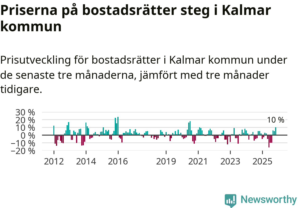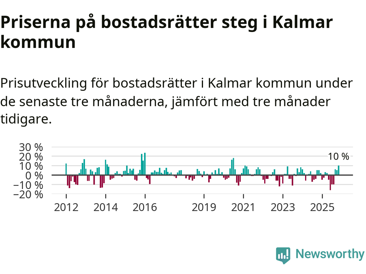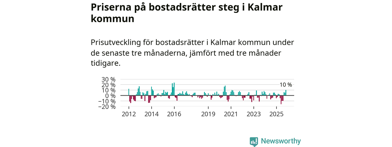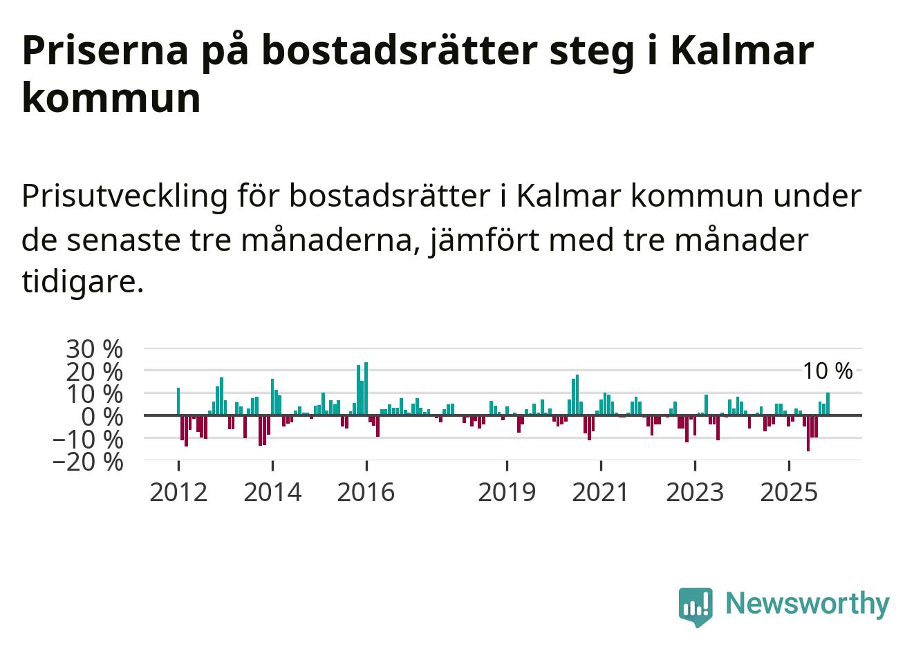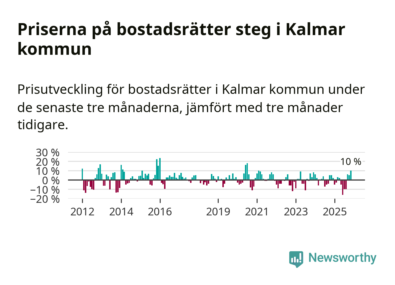 Priserna på bostadsrätter steg med tio procent i Kalmar kommun under de senaste tre månaderna. Det är den starkaste prisutvecklingen sedan 2021.