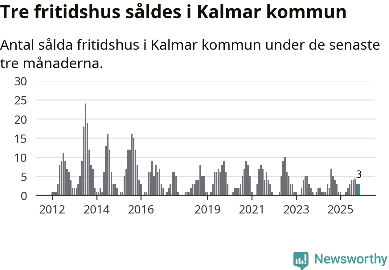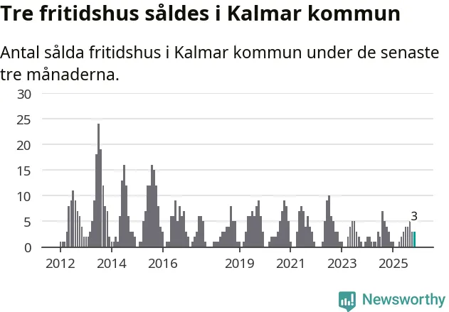 Mellan september och november gjordes sammanlagt tre affärer med fritidshus i Kalmar kommun. Det är lika många affärer som vid motsvarande tid i fjol.