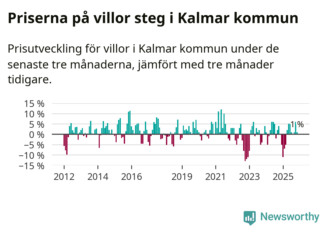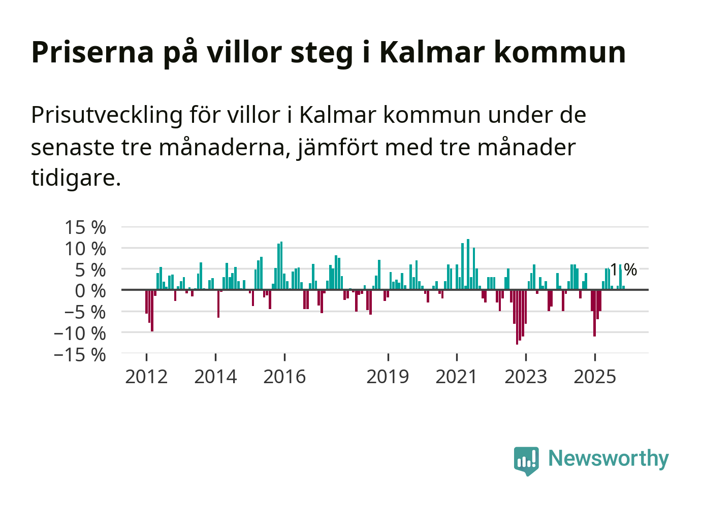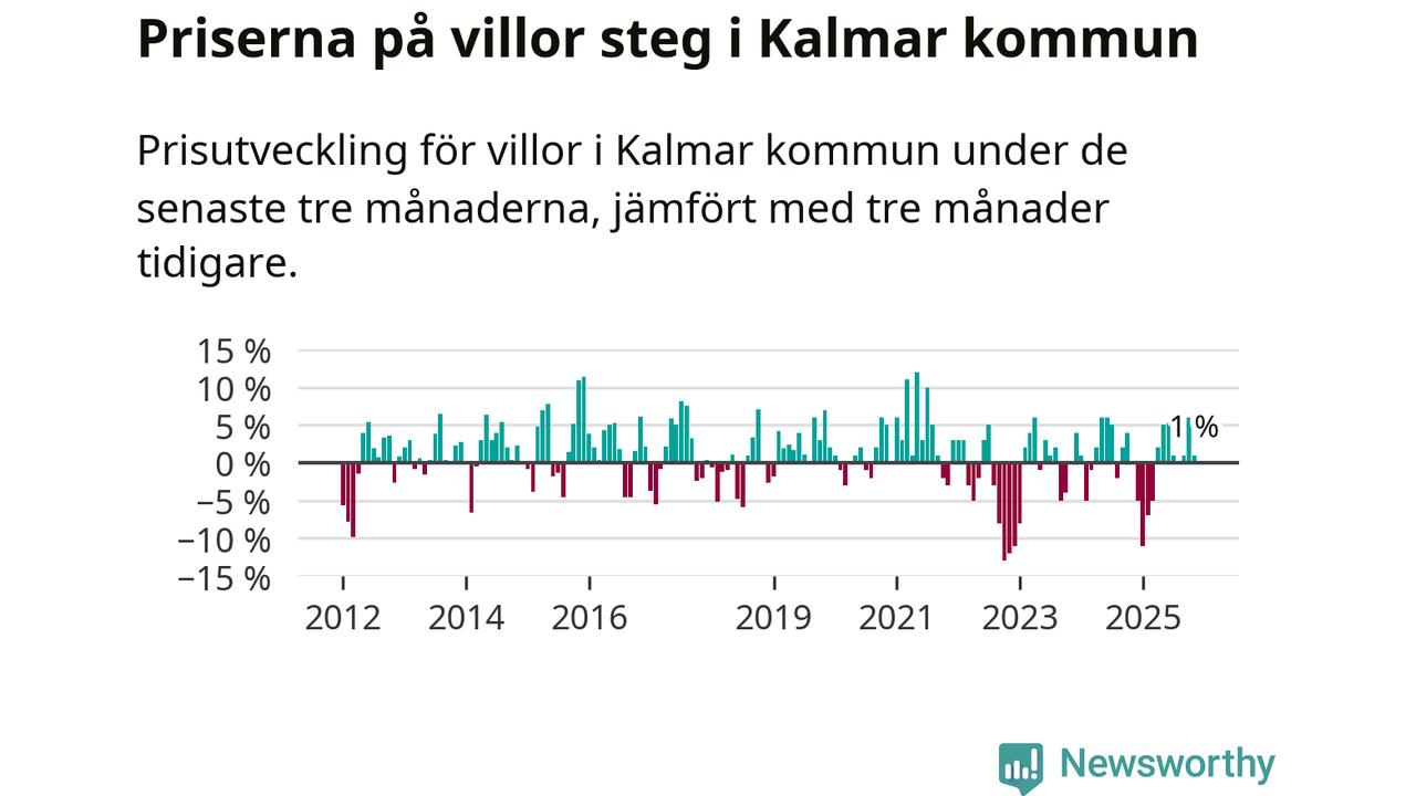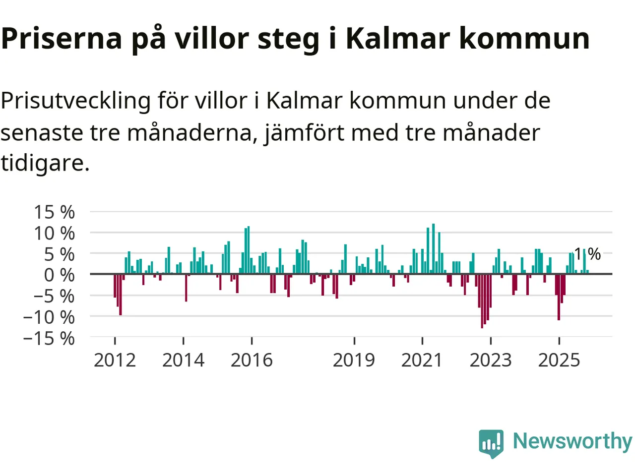 Statistiken visar även på en prisuppgång i Kalmar kommun. Medelpriset på försäljningarna av villor i kommunen var 1 procent högre än för tre månader sedan. I hela Kalmar län däremot sjunker villapriserna. I hela länet noterades en prisnedgång på 2 procent.