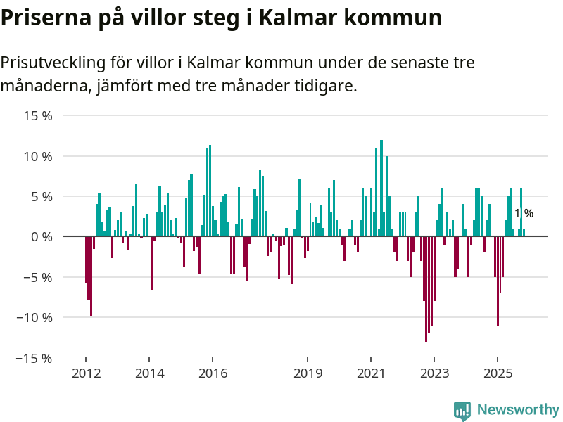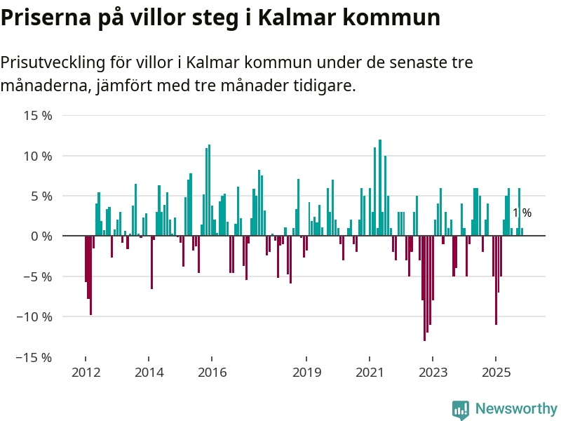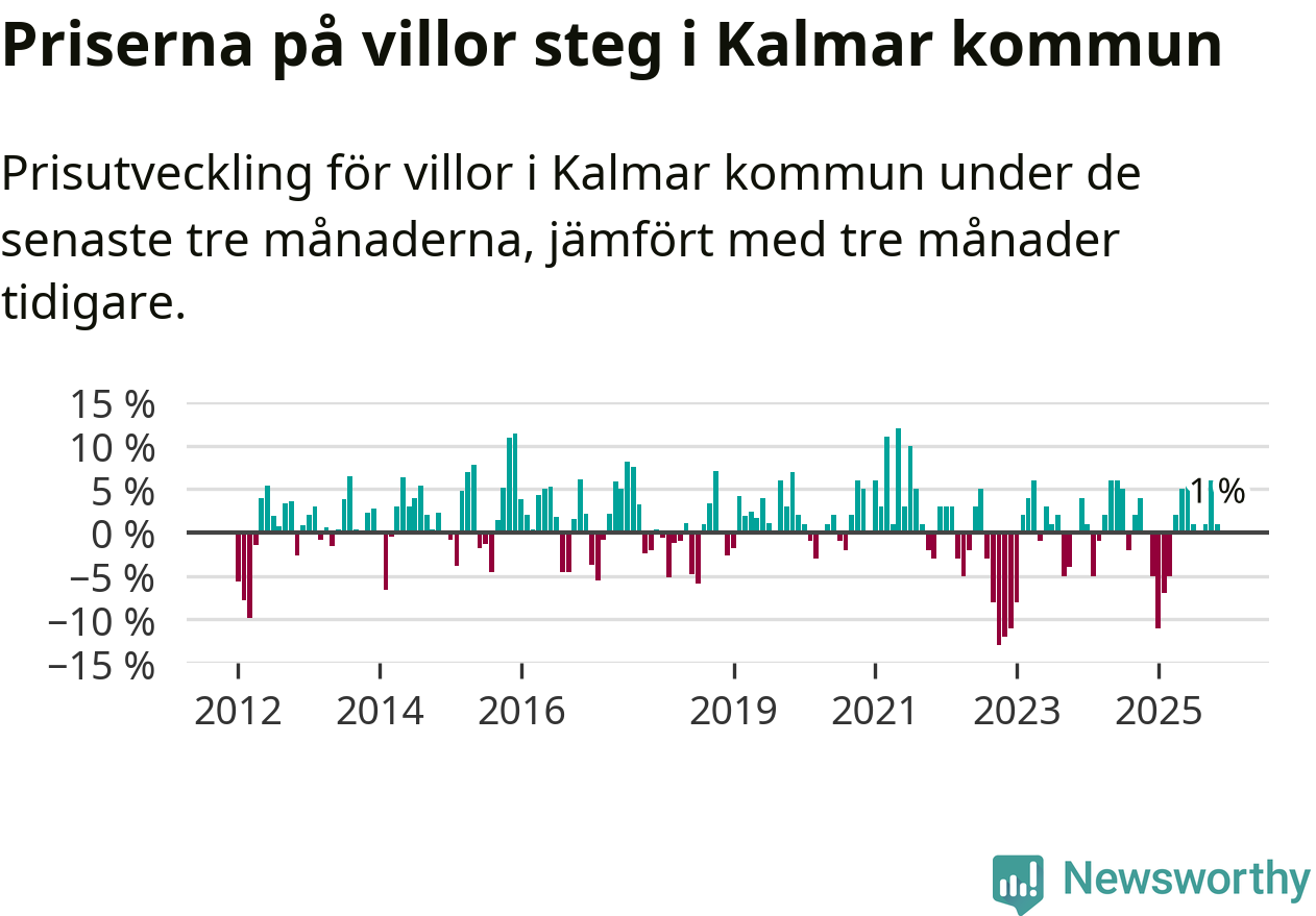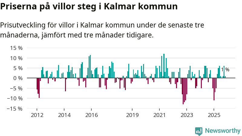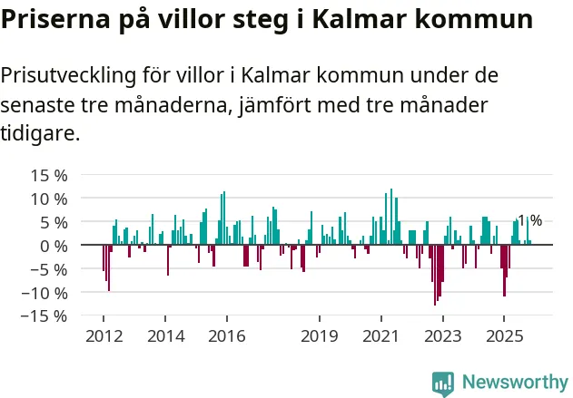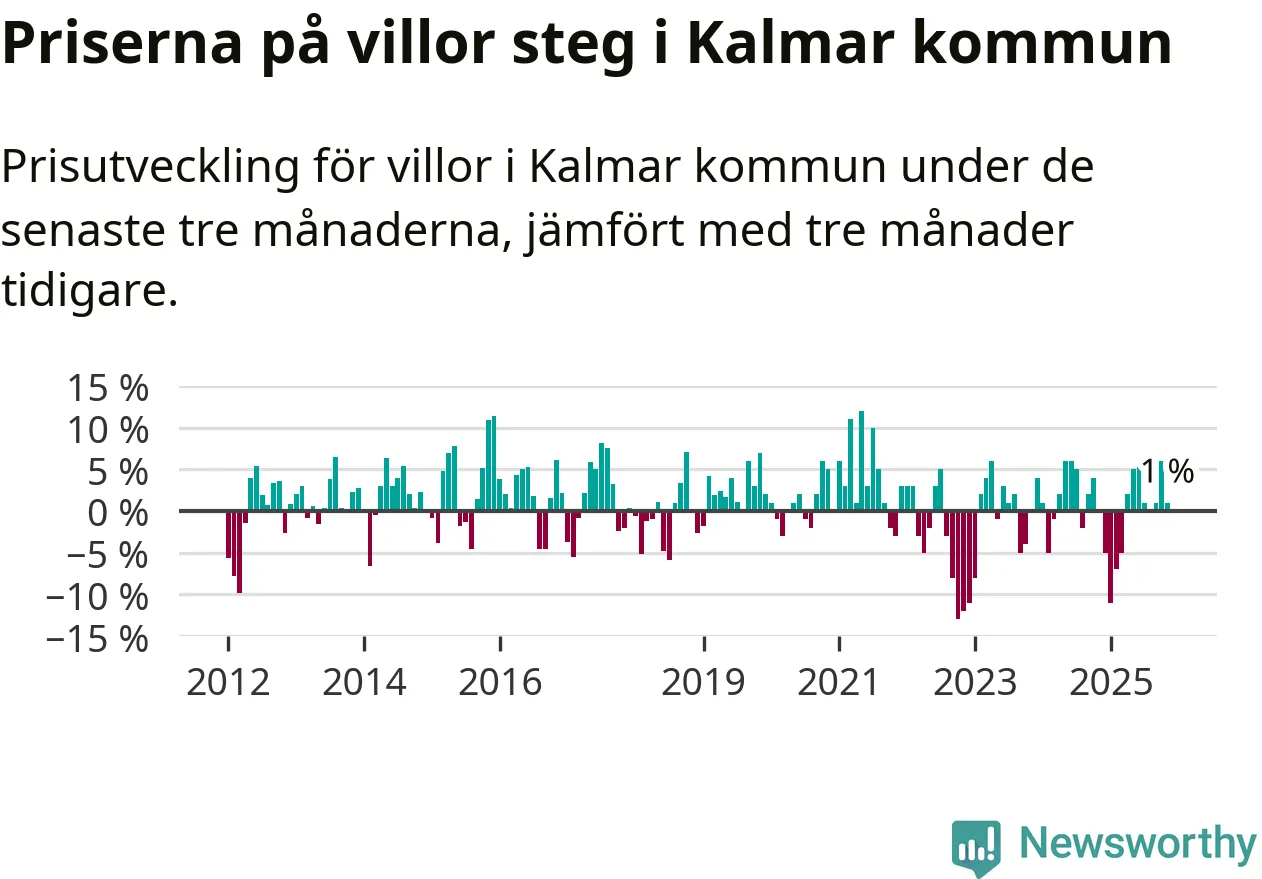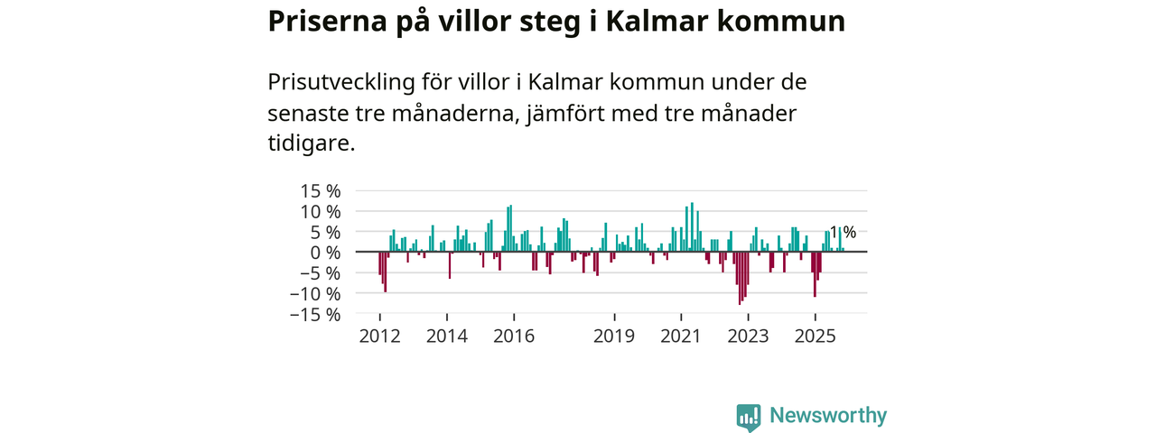Statistiken visar även på en prisuppgång i Kalmar kommun. Medelpriset på försäljningarna av villor i kommunen var 1 procent högre än för tre månader sedan. I hela Kalmar län däremot sjunker villapriserna. I hela länet noterades en prisnedgång på 2 procent.